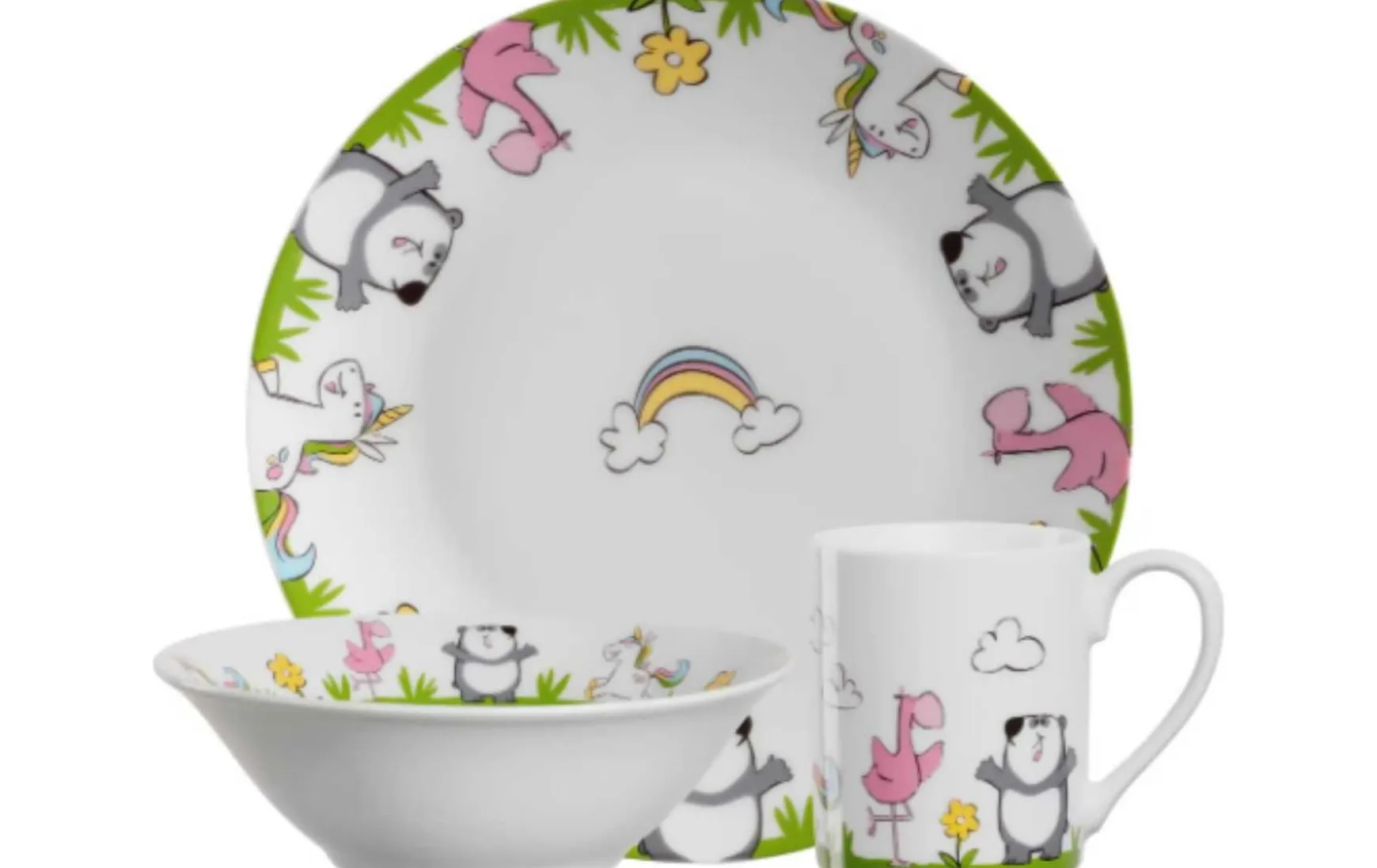 Farbenfrohes, freundliches Motiv mit Panda, Flamingo und Einhorn. Dies Kindergeschirrset besteht aus: 1 Teller, 1 Becher, 1 Schale