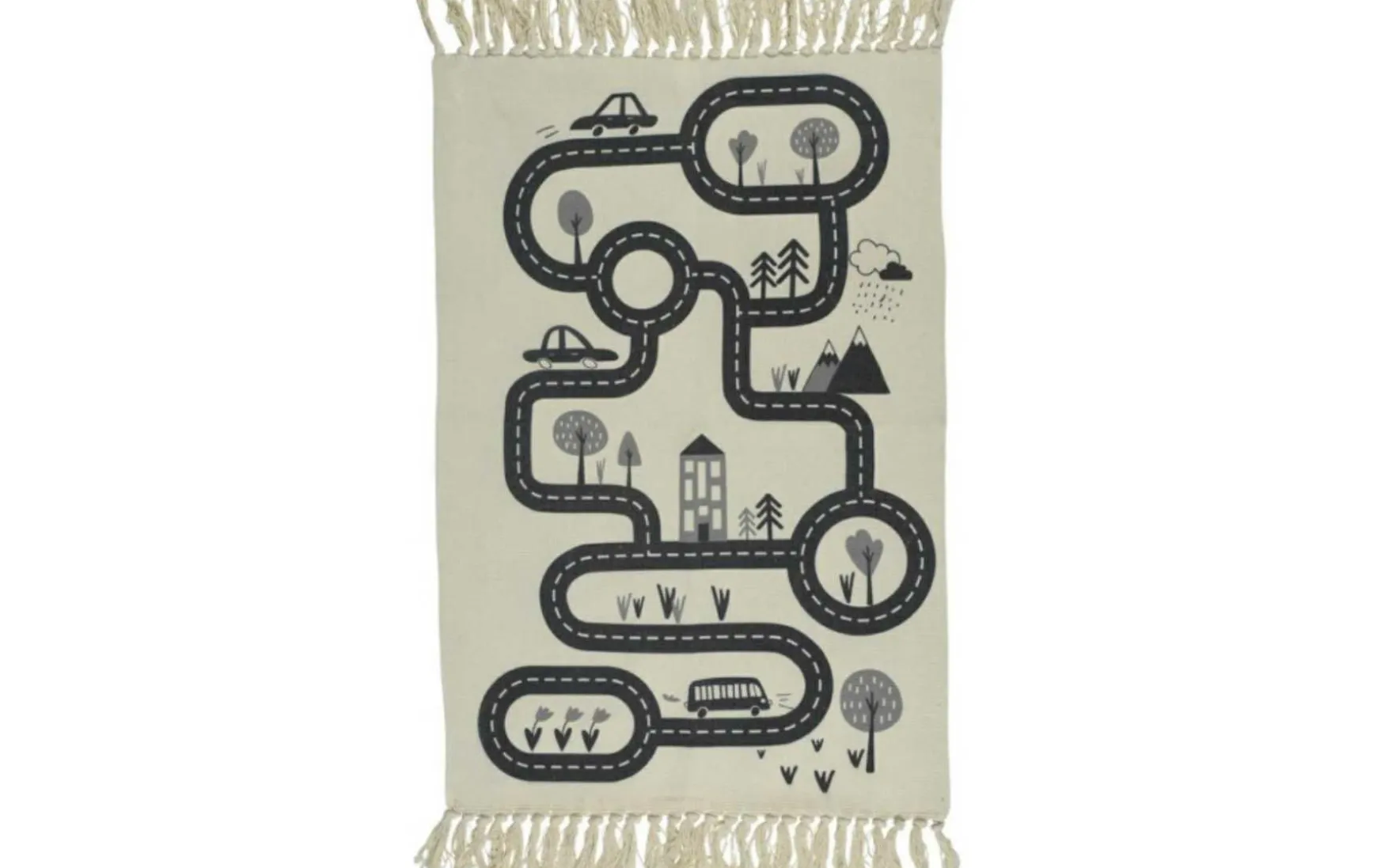 Kinderteppich in angenehmer Beigefarbe. Es zeigt eine Straße, Autos, Pflanzen und Verkehrszeichen. Es wird nicht nur eine dekorative Ergänzung für das Kinderzimmer sein, sondern auch ein Ort für kreatives Spielen. Das darauf aufgebrachte Muster regt die Fantasie an und hat auch pädagogische Funktionen. Jedes Kleinkind kann beginnen, die Grundregeln des Verkehrs zu erlernen. Der Teppich verleiht dem Innenraum eine gemütliche, sanfte Atmosphäre. An zwei Seiten ist es mit Quasten verziert, die ihm einen Boho-Stil-Charakter verleihen.