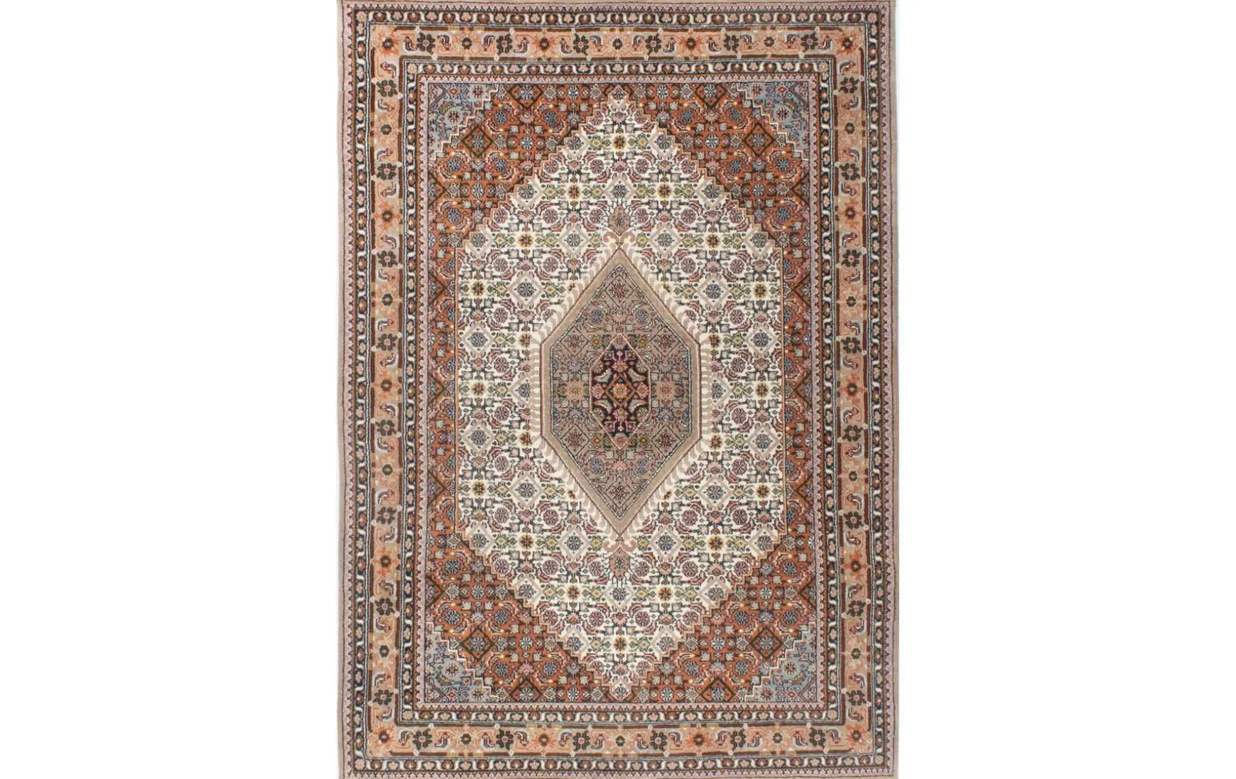 Dieser handgeknüpfte Teppich aus Indien besticht mit seinem geometrischen Design. Der Flor besteht zu 100% aus Schurwolle und ist daher besonders weich.
