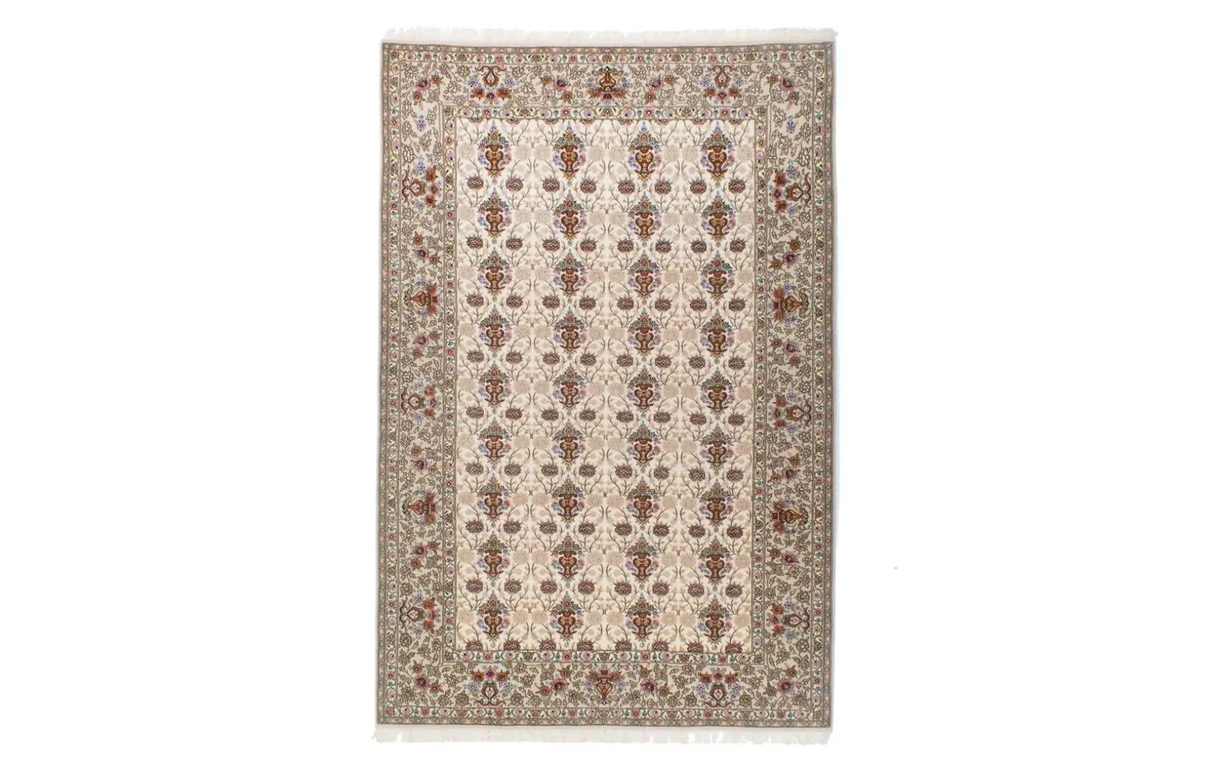 Hier zeigt sich ein handgeknüpfter Teppich aus dem Iran, in königlicher Qualität mit extra dichtem Flor aus 100% feiner Korkschafwolle. Die Kette besteht aus Seide.