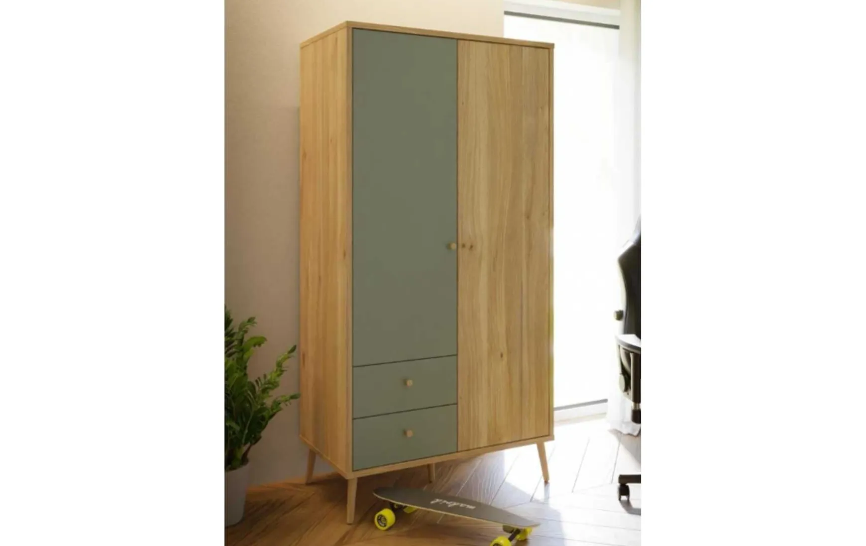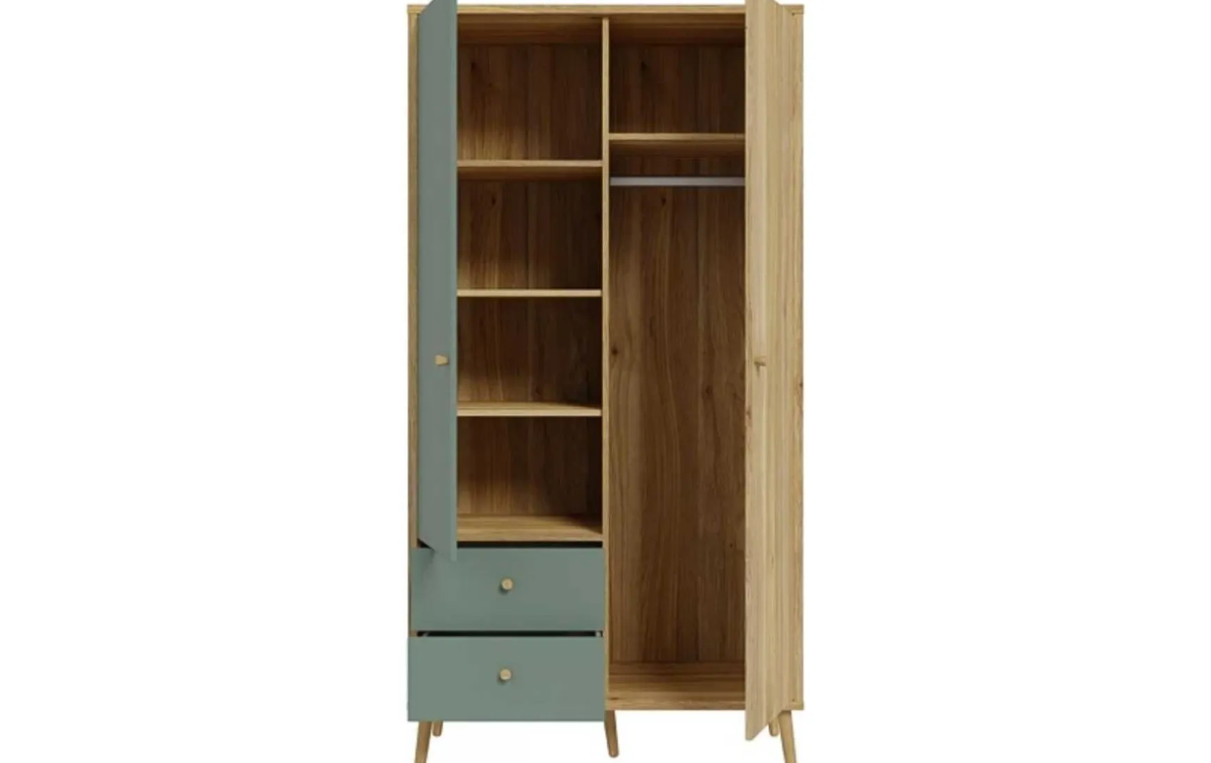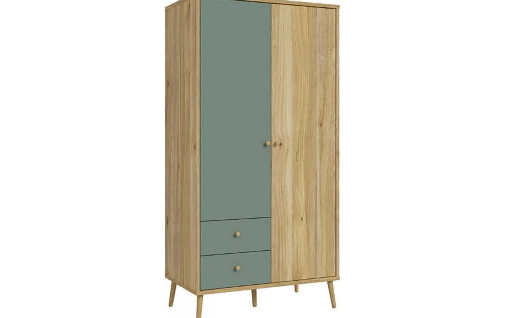 Der Kleiderschrank im skandinavischen Look überzeugt durch seine natürliche Ausstrahlung und funktionale Ausstattung. In modernem Salbei Grün mit warmen Holzakzenten fügt sich der Schrank harmonisch in zeitgemäße Wohnkonzepte ein. Knopfgriffe aus unbehandelter Eiche sowie Füße aus naturbelassenem Eichenholz unterstreichen den nordischen Stil. Der Drehtürenschrank ist mit zwei Türen inklusive Softclose-Funktion, zwei Schubladen und einer Kleiderstange ausgestattet und bietet praktischen Stauraum für Kleidung und Accessoires. Mit seinen Maßen von ca. 94 × 186 × 52 cm (B/H/T) eignet er sich ideal auch für kleinere Räume. Gefertigt aus hochwertigem Holzwerkstoff, ist die Oberfläche pflegeleicht und kann einfach trocken abgewischt werden. Der Kleiderschrank wird zerlegt geliefert und verbindet modernes Design mit wohnlicher Natürlichkeit.