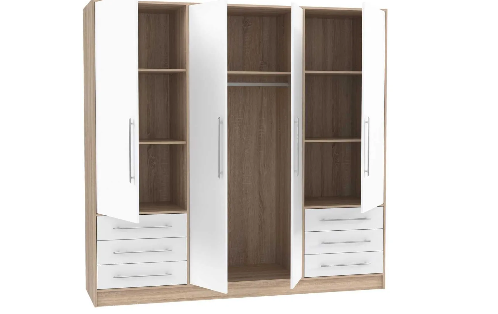 Der Kleiderschrank im Konsum-Stil überzeugt durch großzügigen Stauraum und eine durchdachte Innenaufteilung. Mit vier Türen und sechs Schubkästen auf stabilen Metalllaufleisten bietet er viel Platz für Kleidung, Wäsche und Accessoires. Hinter den beiden mittleren Türen befinden sich ein Fachboden und eine Kleiderstange, ideal für hängende Garderobe, während hinter der linken und rechten Tür jeweils zwei Fachböden für zusätzliche Ordnung sorgen. Mit seinen Maßen von ca. 207 × 200 × 60 cm (B/H/T) und einem Gewicht von rund 167,7 kg eignet sich der Schrank perfekt für größere Schlafräume. Der Korpus in Sonoma Eiche Dekor wird stilvoll durch weiße, matte Fronten ergänzt und verleiht dem Möbel eine moderne, freundliche Optik. Gefertigt aus hochwertigem Holzwerkstoff ist die Oberfläche pflegeleicht und kann einfach trocken abgewischt werden. Der Kleiderschrank wird zerlegt geliefert, der Aufbau ist dank bebilderter Anleitung einfach, sämtliches Montagematerial ist im Lieferumfang enthalten.