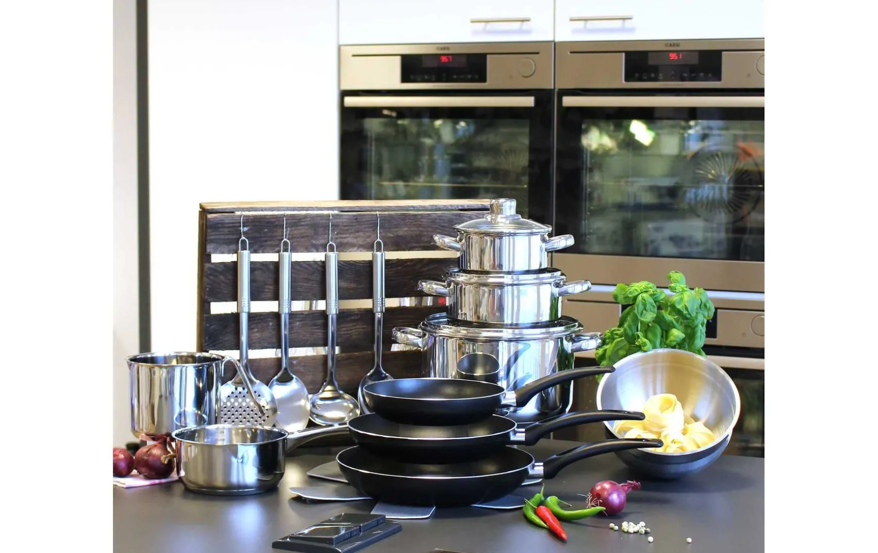 Das 15-teilige Starter-Topfset bietet Ihnen eine perfekt abgestimmte Grundausstattung für jede Küche. Hochwertige Töpfe aus Edelstahl 18/8–18/10 mit praktischer Volumenskala treffen auf antihaftbeschichtete Aluminium-Pfannen für komfortables und fettarmes Braten. Glasdeckel mit Edelstahlrand, ergonomische Griffe sowie vielseitiges Zubehör wie Pfannenschoner und Küchenhelfer machen dieses Set zum idealen Begleiter für Einsteiger und ambitionierte Hobbyköche. Geeignet für alle Herdarten – inklusive Induktion – überzeugt das Set durch Funktionalität, Langlebigkeit und modernes Design.