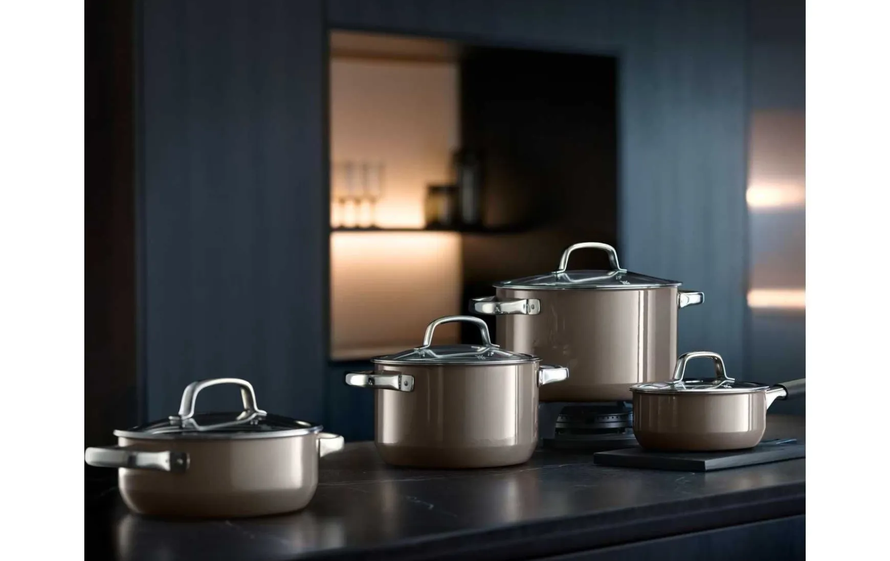 Kompromisslose Qualität und Funktionalität mit herausragenden Materialien in zeitloser Schönheit gebündelt zu einem Kochgeschirr, das Sie für viele Jahre zuverlässig begleitet: das ist Fusiontec von WMF. Das einzigartige Material besteht aus einer besonderen Legierung, die die besten Eigenschaften bestehender Kochgeschirrmaterialien auf sich vereint. Die Töpfe des 4-teiligen Fusiontec Mineral Topf-Sets glänzen dazu im wörtlichen Sinn mit einer metallisch-schimmernden Oberfläche, die auf den ersten Blick begeistert. Dazu verfügen sie über wärmereduzierende Hohlgriffe, breite Schüttränder sowie jeweils über einen sehr hochwertigen Glasdeckel. Das Fusiontec Mineral Topf-Set in der Farbe Dark Brass ist die ideale Wahl für alle, die hohen Wert auf eine hochwertige, langlebige und besonders formschöne Ausstattung ihrer Küche legen.