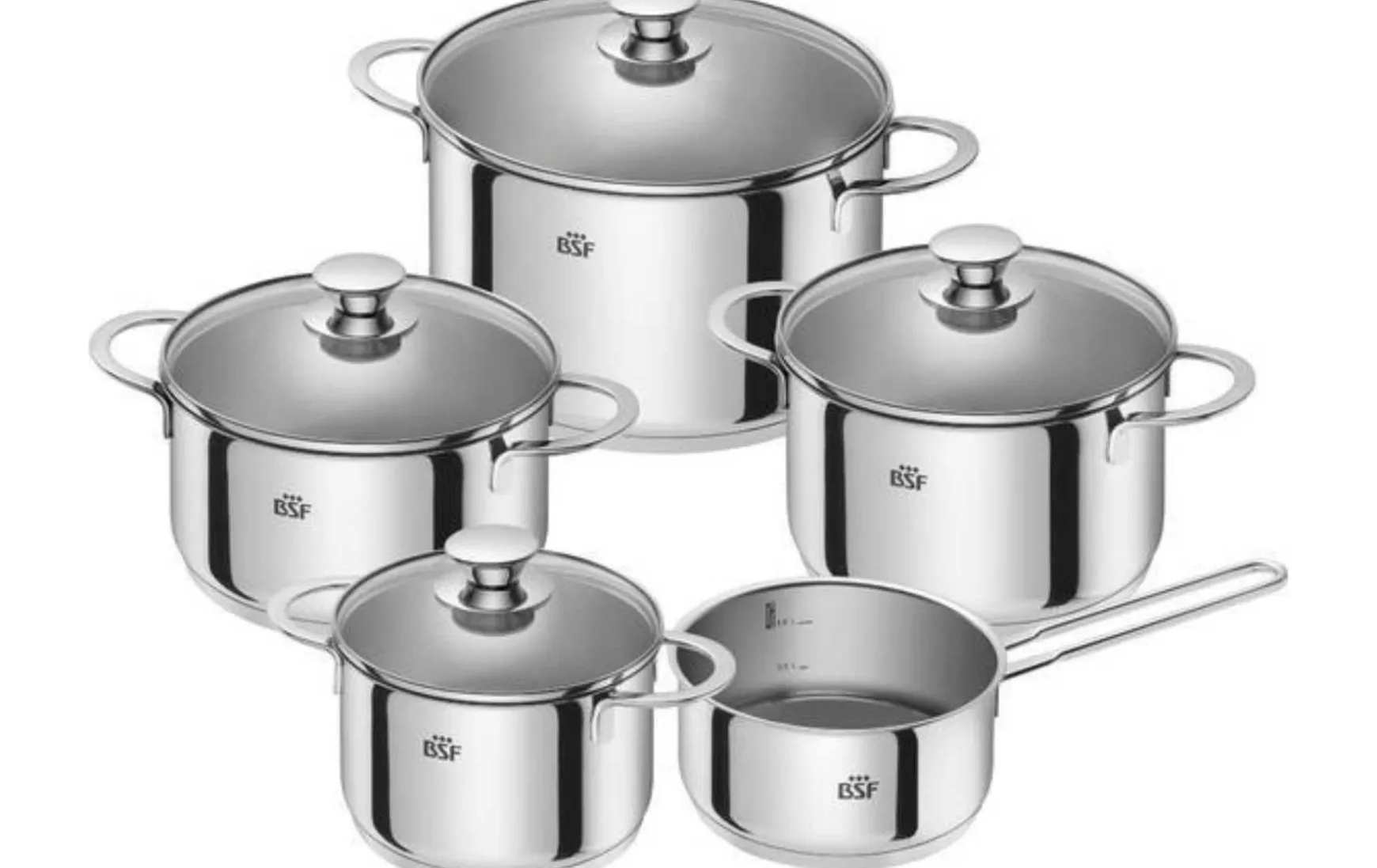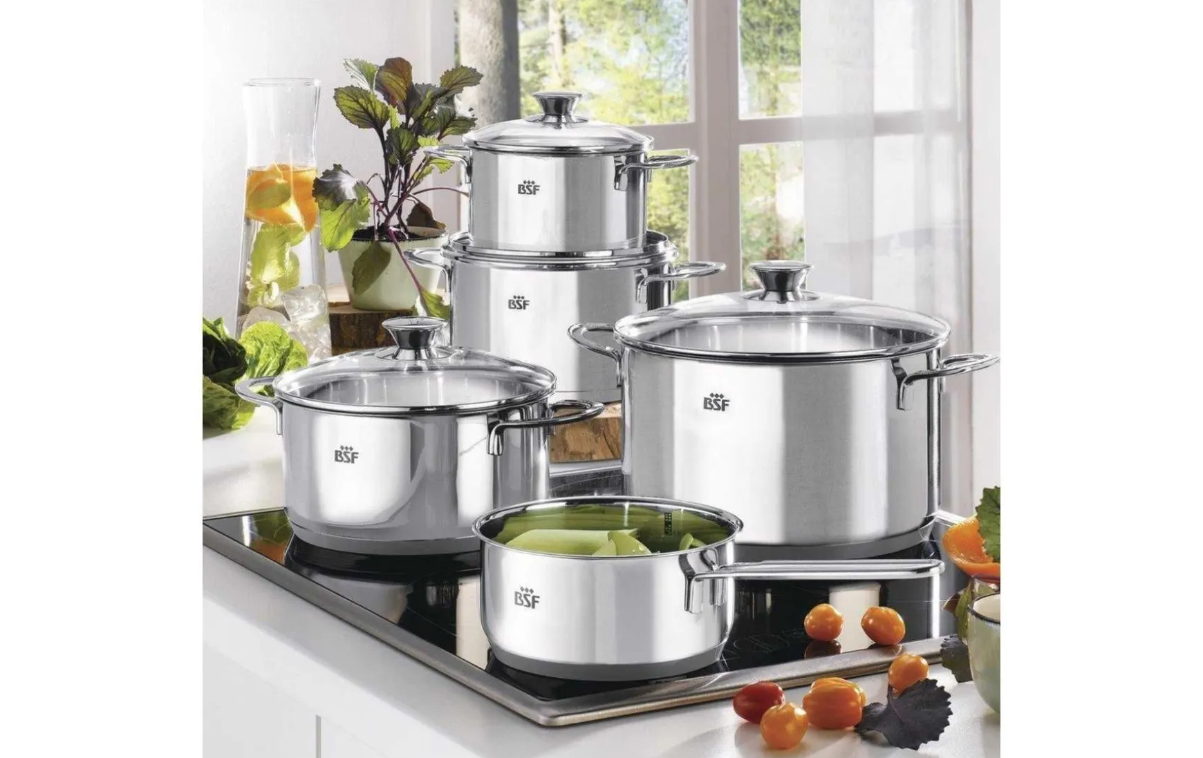 Diese Töpfe haben einen Sandwichboden mit einem Kern aus Aluminium, der die Hitze optimal verteilt. Das Kochgeschirrset können Sie auf jeder Herdart und sogar auf einem Induktionskochfeld verwenden.