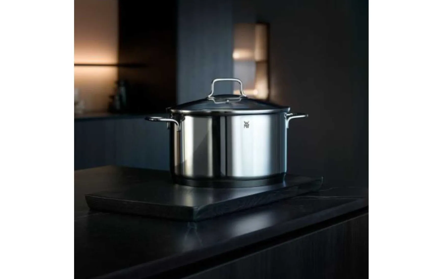 Raffinierte und markante Linien, hochglanzpolierte Oberflächen und viele sinnvolle Ausstattungsdetails: Dieses Kochgeschirr von WMF weiß in jeder Küche und – dank des TransTherm®-Allherdbodens auch auf jedem Herd, einschließlich Induktion zu überzeugen. Dieser ermöglicht dank optimaler Wärmeverteilung und -speicherung besonders energiesparendes Kochen mit dem 5-teiligen Topf-Set. Und damit nicht genug. Alle Teile sind dazu mit einem breiten Schüttrand für mühelos-tropffreies Ausgießen von Flüssigkeiten versehen, während dank des hochwertigen Glasdeckels der Kochvorgang jederzeit problemlos überwacht werden kann. Gefertigt aus genauso elegantem wie strapazierfähigem und pflegeleichtem Cromargan®: Edelstahl Rostfrei 18/10 und hochwertigem Glas, dürfen alle Teile selbstverständlich zur komfortablen Reinigung in die Spülmaschine.