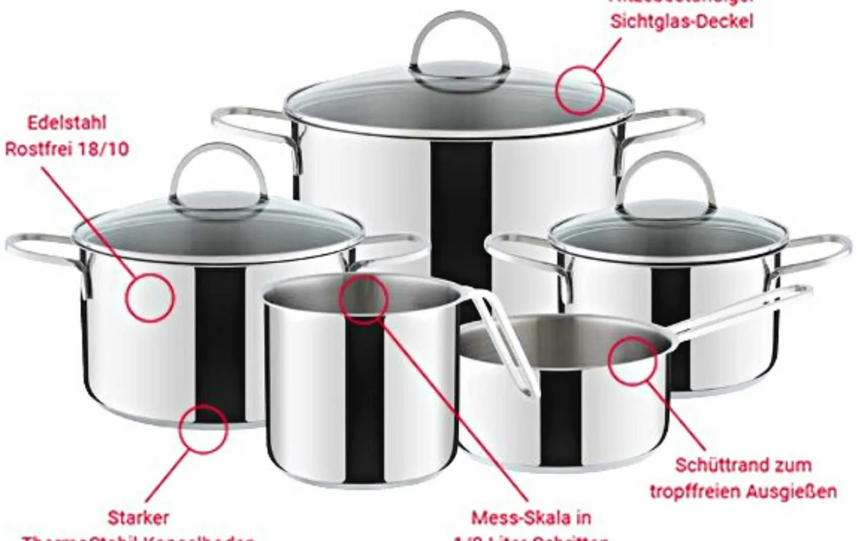 - Artikelinhalt: 3x Fleischtöpfe, 1x Milchtopf, 1x Kasserolle, 3x Deckeln