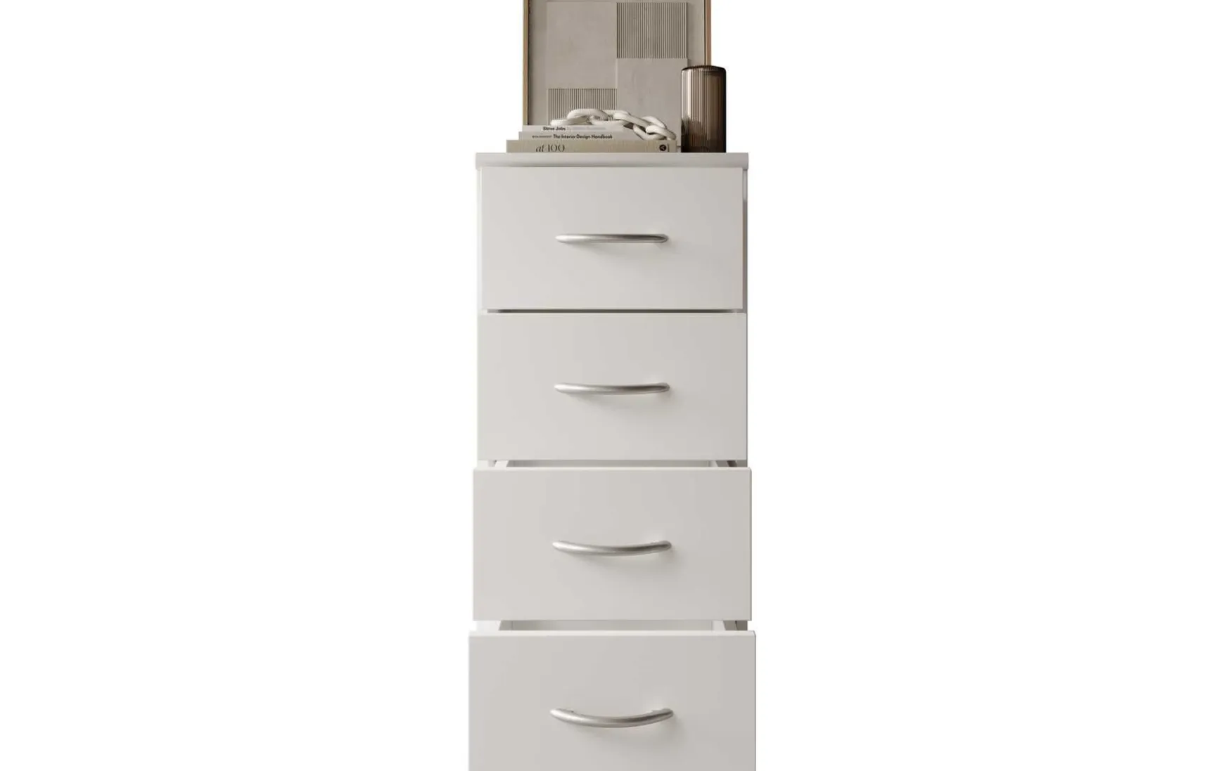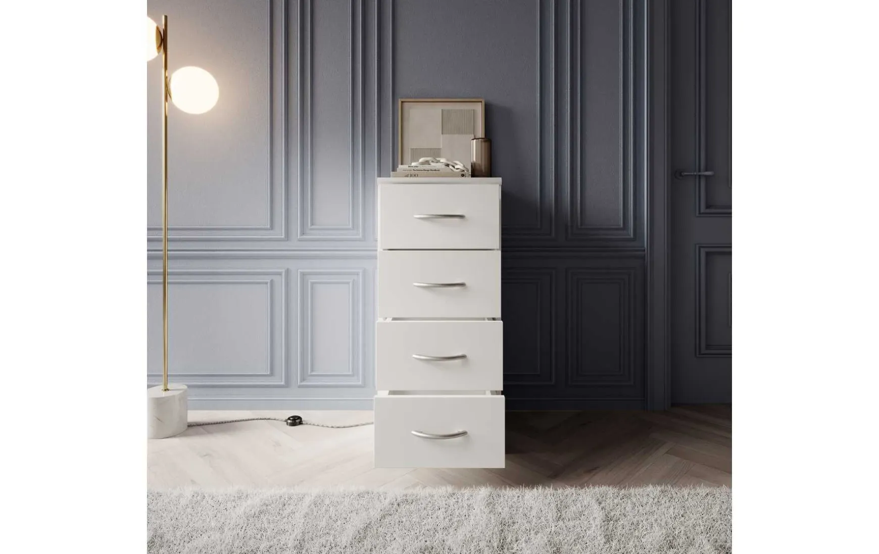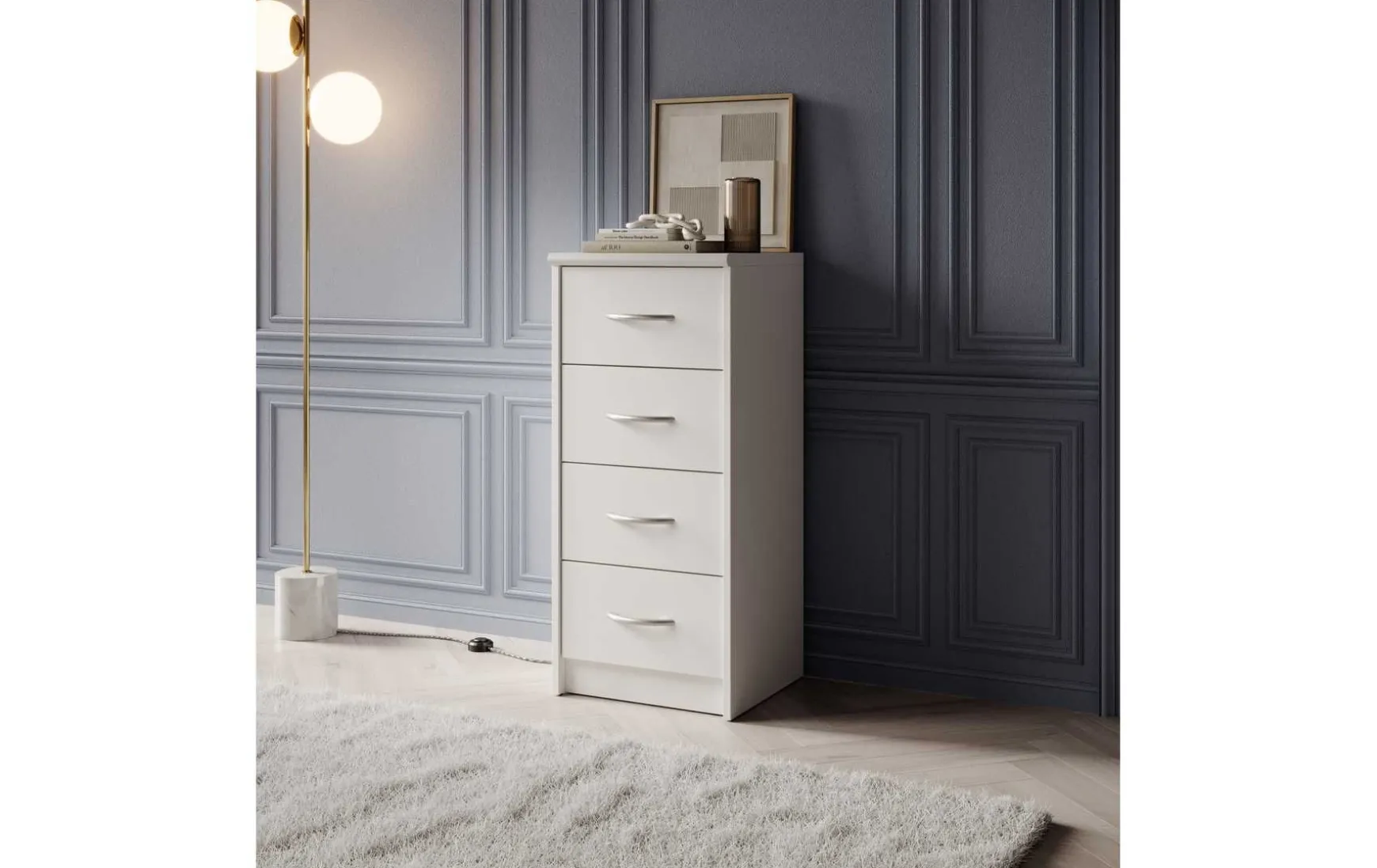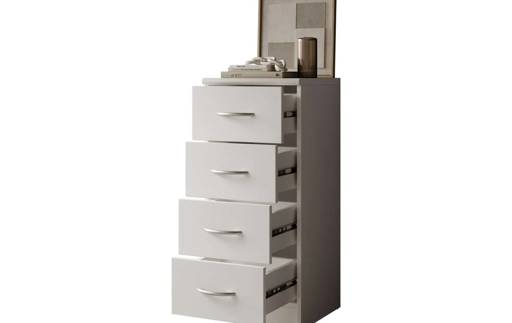 Mit ihrem schlichten aber zeitlos elegantem Design mit Dekor in Weiß fügt sich diese Kommode in jeden Wohnraum hervorragend ein. In den 4 Schubladen ist trotz der geringen Stellfläche reichlich Stauraum für allerlei Utensilien.
