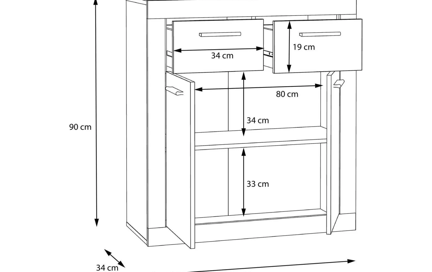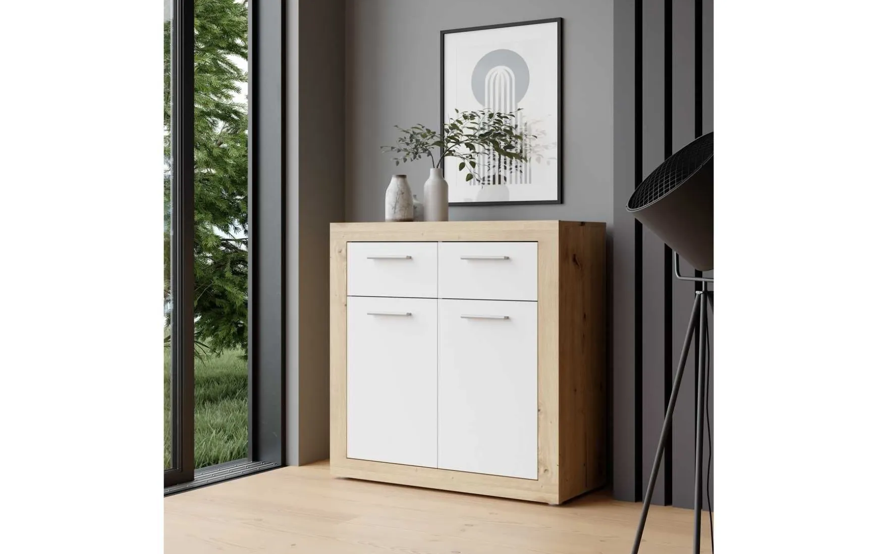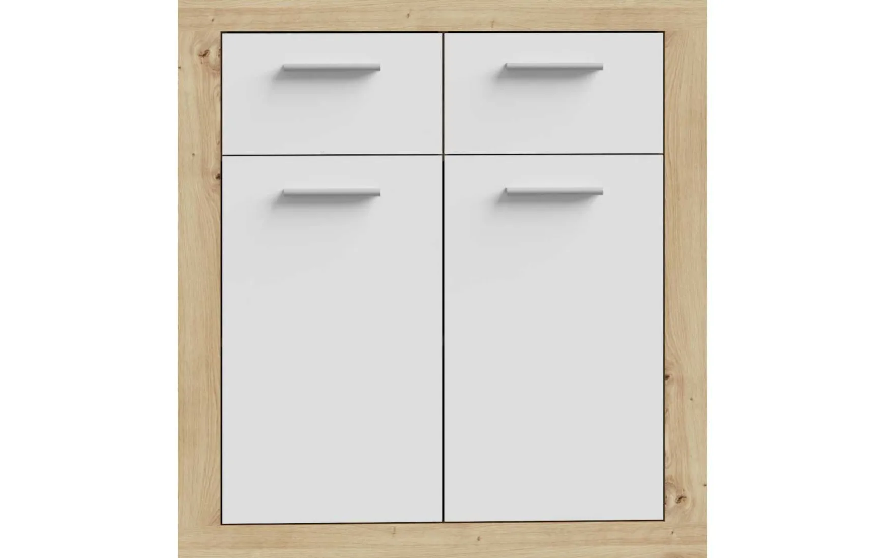 Die Kommode überzeugt durch ihr kompaktes Design und durchdachte Aufteilung. Mit zwei Türen, zwei Schubkästen und einem Einlegeboden bietet sie praktischen Stauraum für Wohn-, Ess- oder Flurbereich.