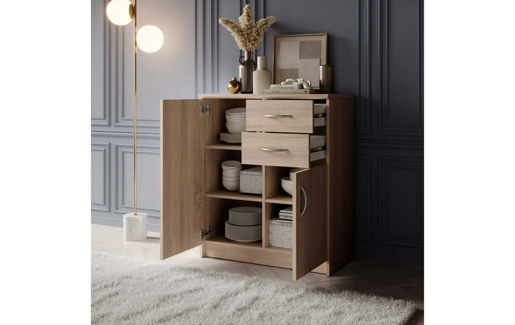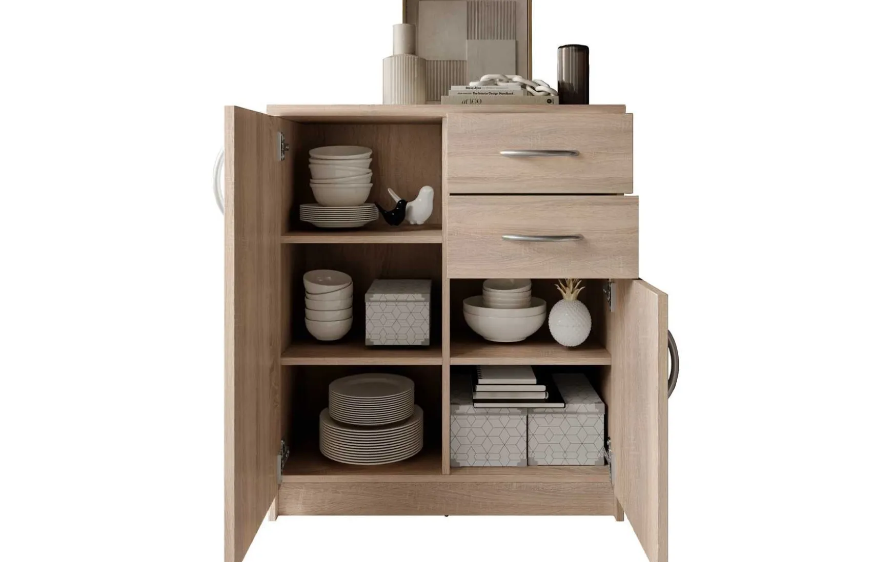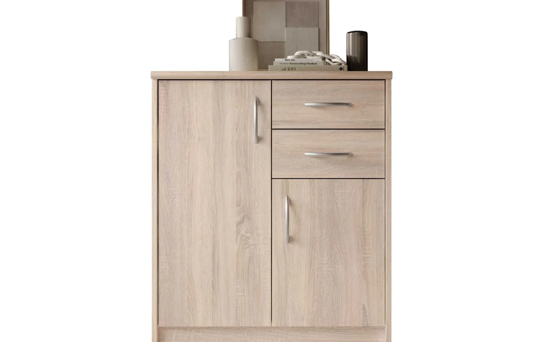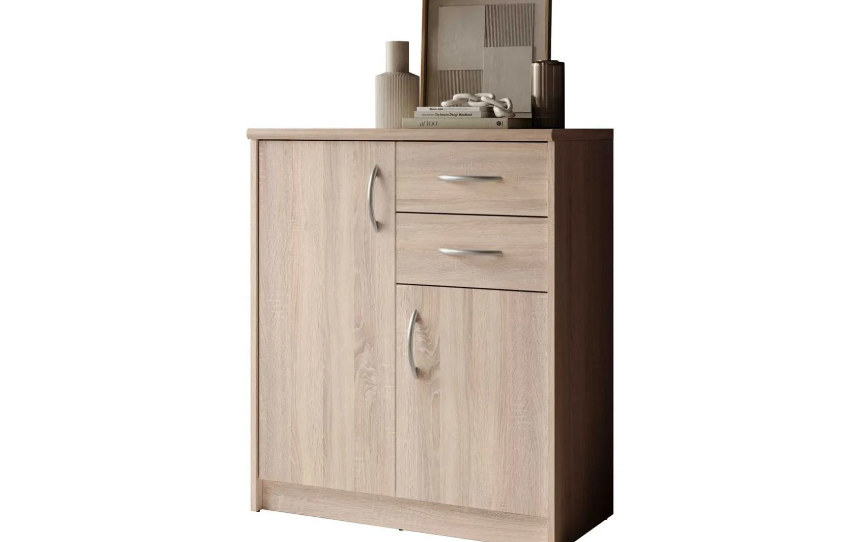 Mit ihrem schlichten aber zeitlos elegantem Design mit Dekor in Eiche Sonoma fügt sich diese Kommode in jeden Wohnraum hervorragend ein. Hinter den beiden Türen verbergen sich insgesamt 3 höhenverstellbare Einlegeböden, die in Kombination mit den beiden Schubladen viel Stauraum bieten.