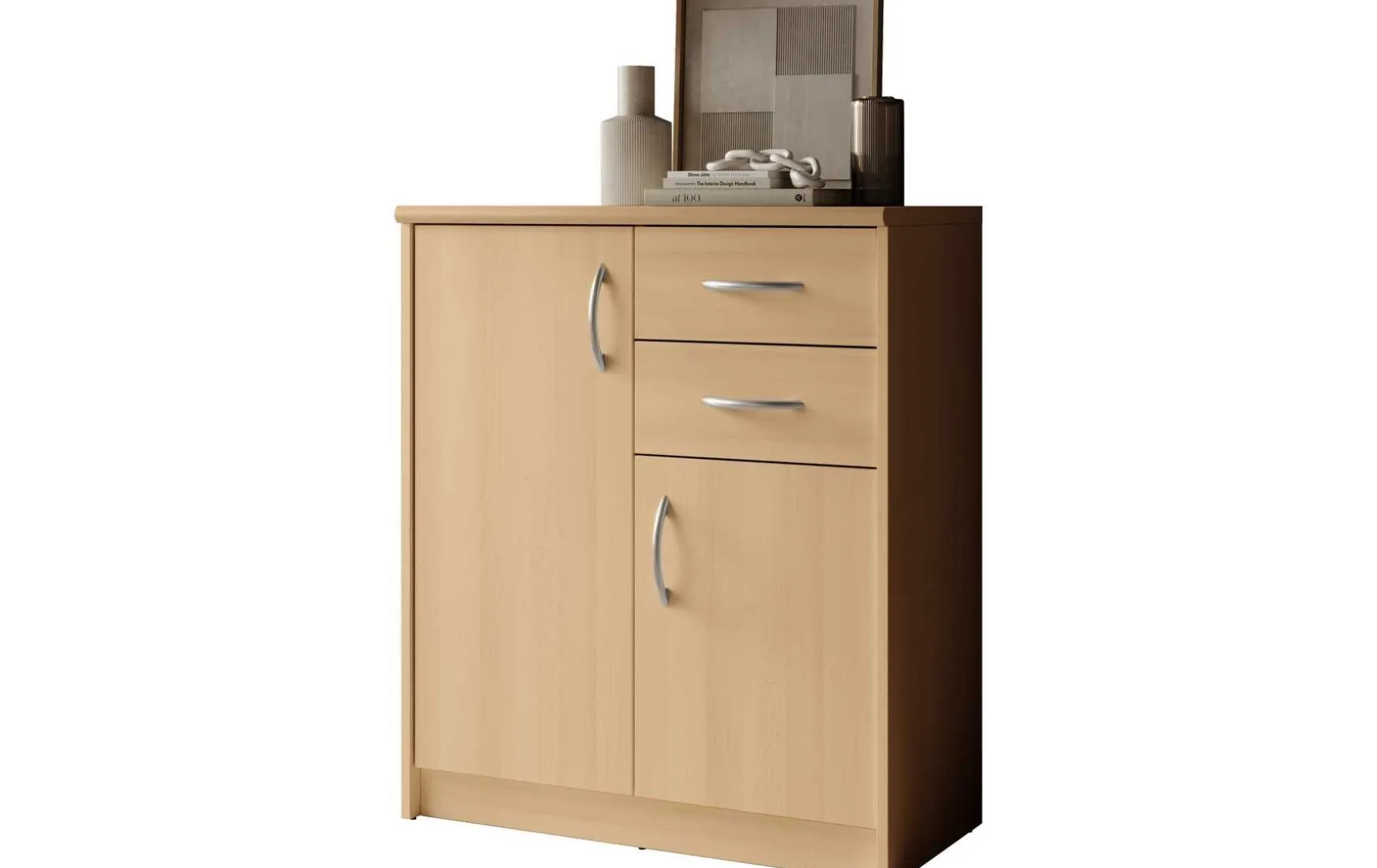Mit ihrem schlichten aber zeitlos elegantem Design mit Dekor in Buche fügt sich diese Kommode in jeden Wohnraum hervorragend ein. Hinter den beiden Türen verbergen sich insgesamt 3 höhenverstellbare Einlegeböden, die in Kombination mit den beiden Schubladen viel Stauraum bieten.