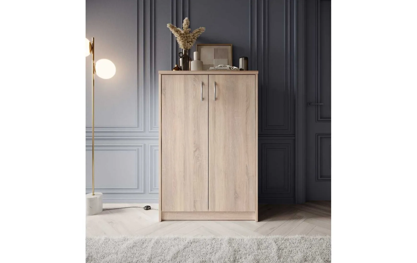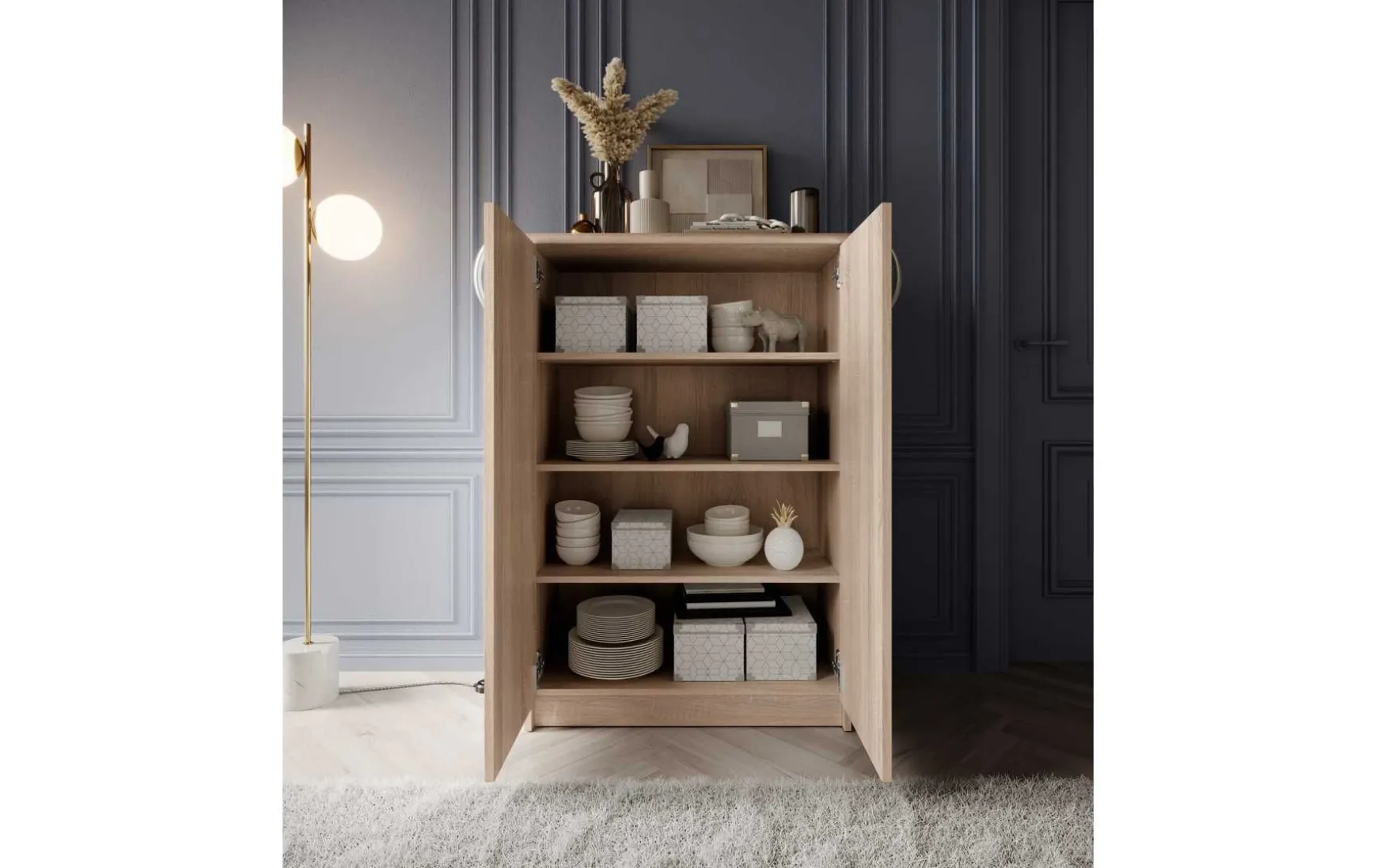 Mit ihrem schlichten aber zeitlos elegantem Design mit Dekor in Eiche Sonoma fügt sich diese Kommode in jeden Wohnraum hervorragend ein. Hinter der Doppeltür verbirgt sich ein großer Stauraum, der durch 3 höhenverstellbare Einlegeböden unterteilt wird.