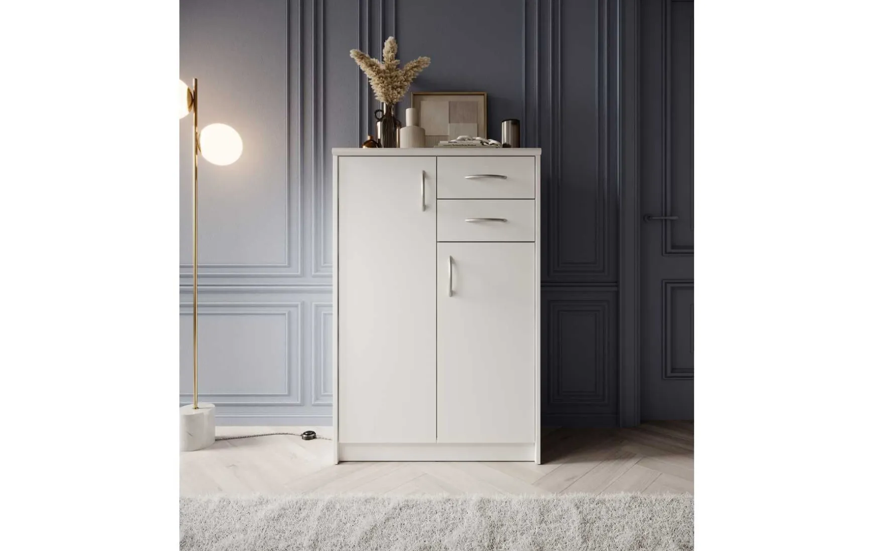 Mit ihrem schlichten aber zeitlos elegantem Design mit Dekor in Weiß fügt sich diese Kommode in jeden Wohnraum hervorragend ein. Hinter den beiden Türen verbergen sich insgesamt 4 höhenverstellbare Einlegeböden, die in Kombination mit den beiden Schubladen besonders viel Stauraum bieten.