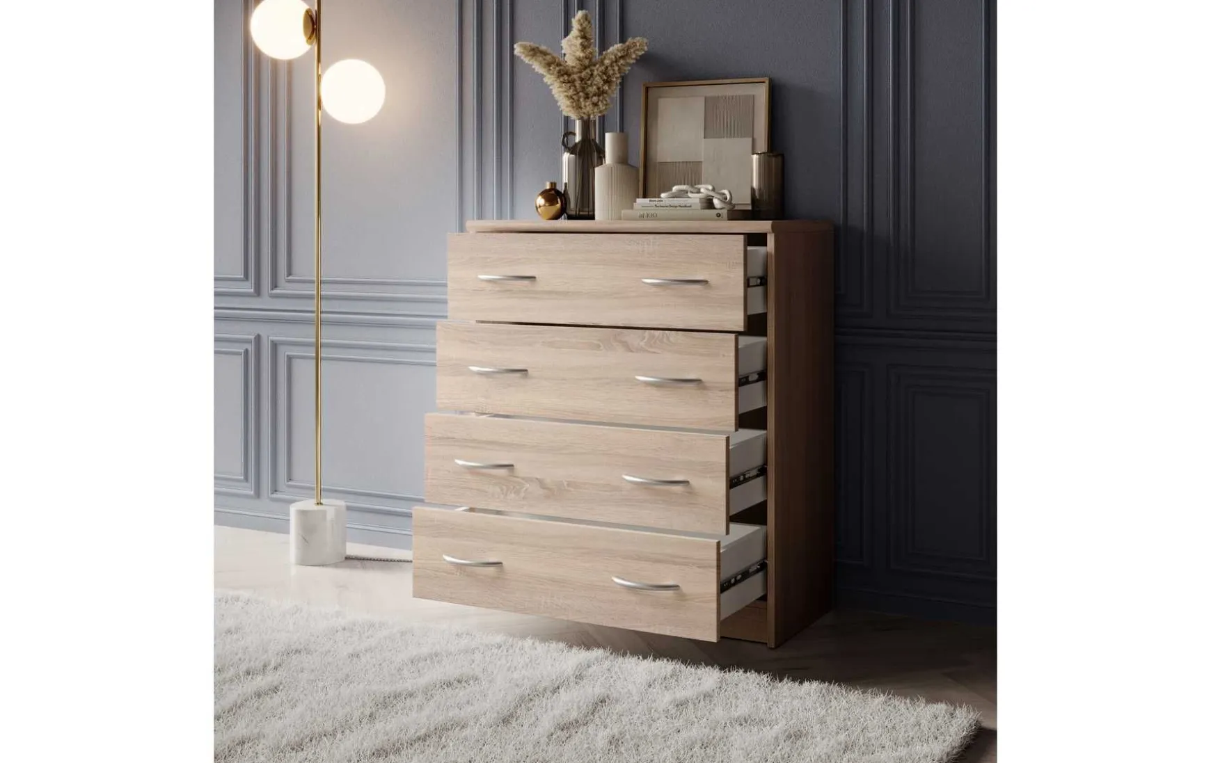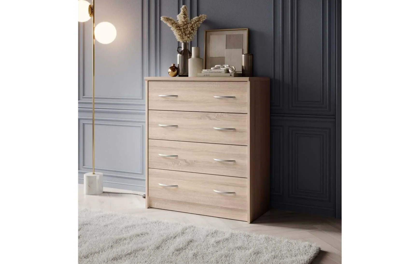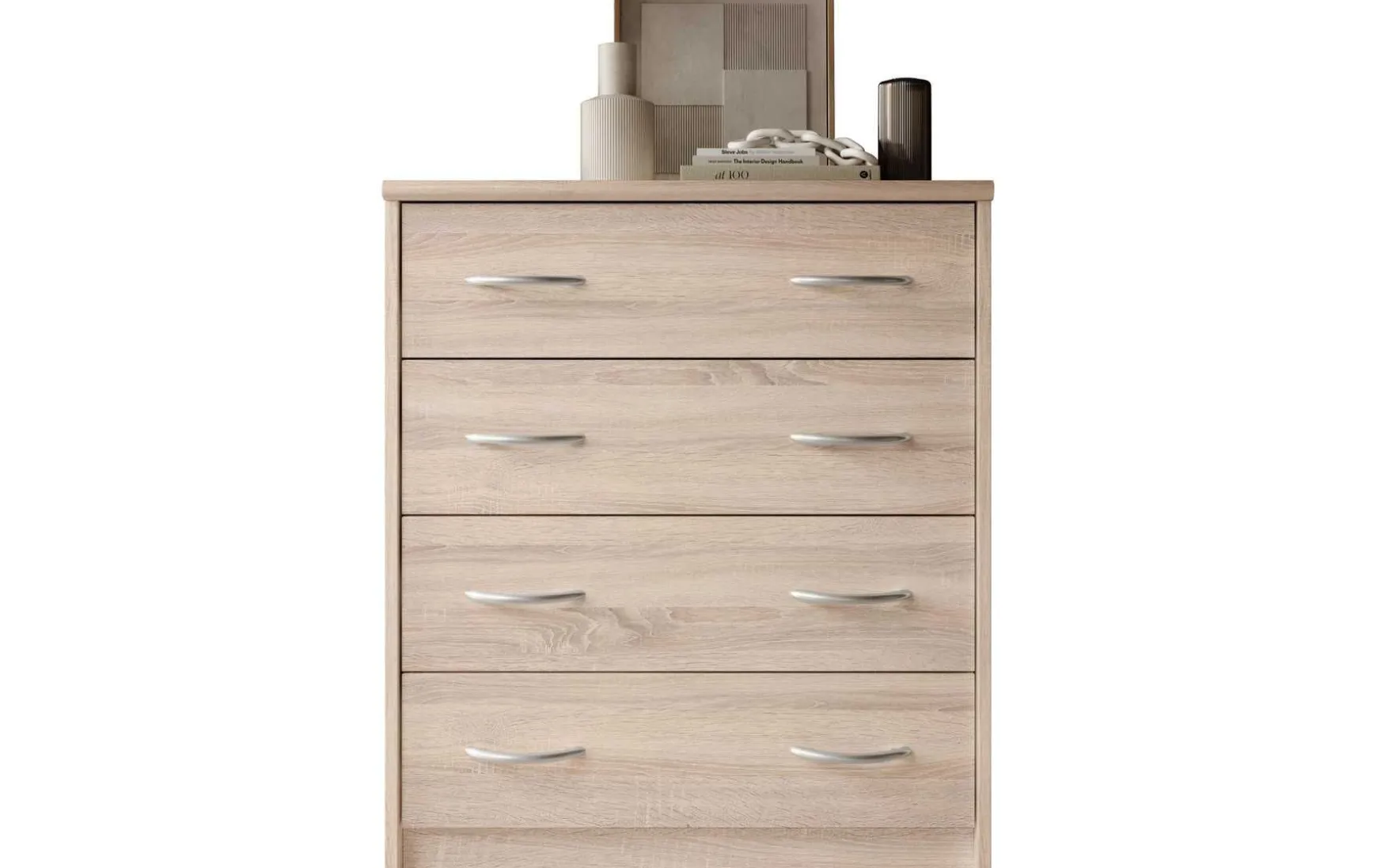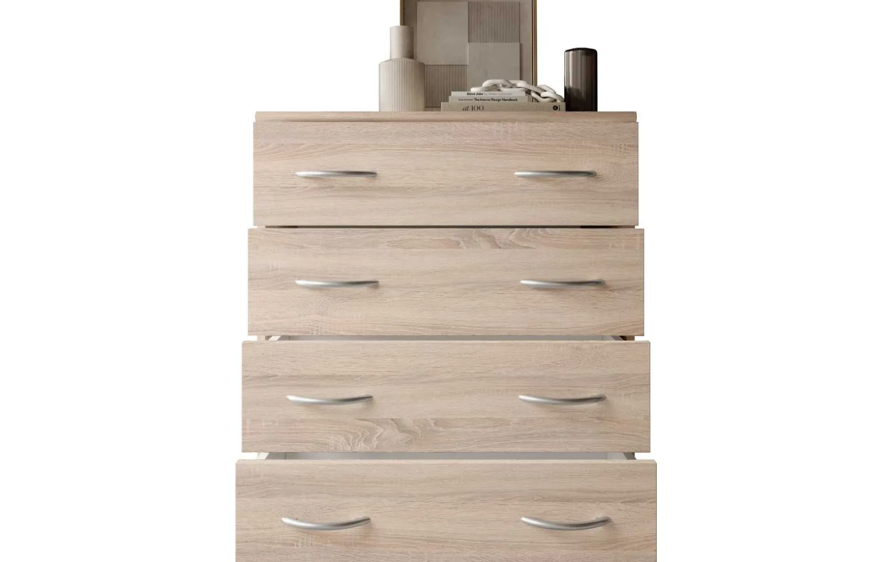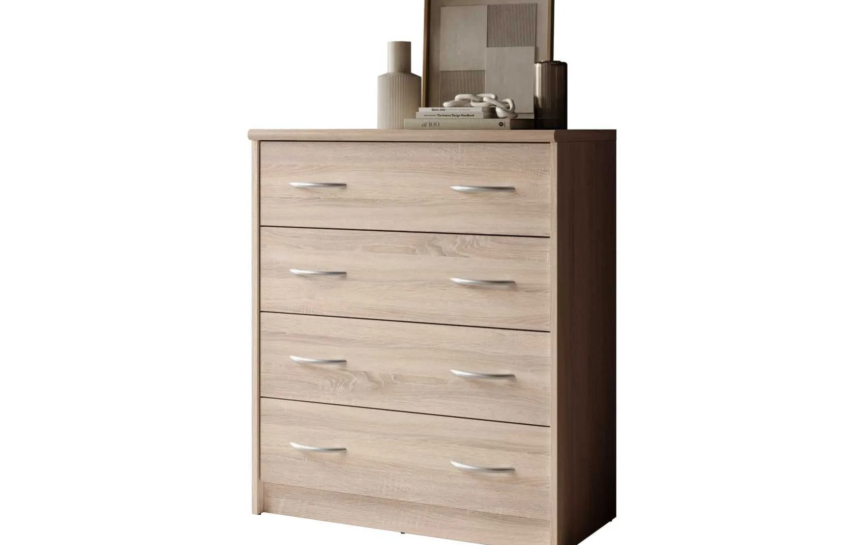 Mit ihrem schlichten aber zeitlos elegantem Design mit Dekor in Eiche Sonoma fügt sich diese Kommode in jeden Wohnraum hervorragend ein. In den 4 besonders breiten Schubladen ist reichlich Stauraum für allerlei Utensilien.