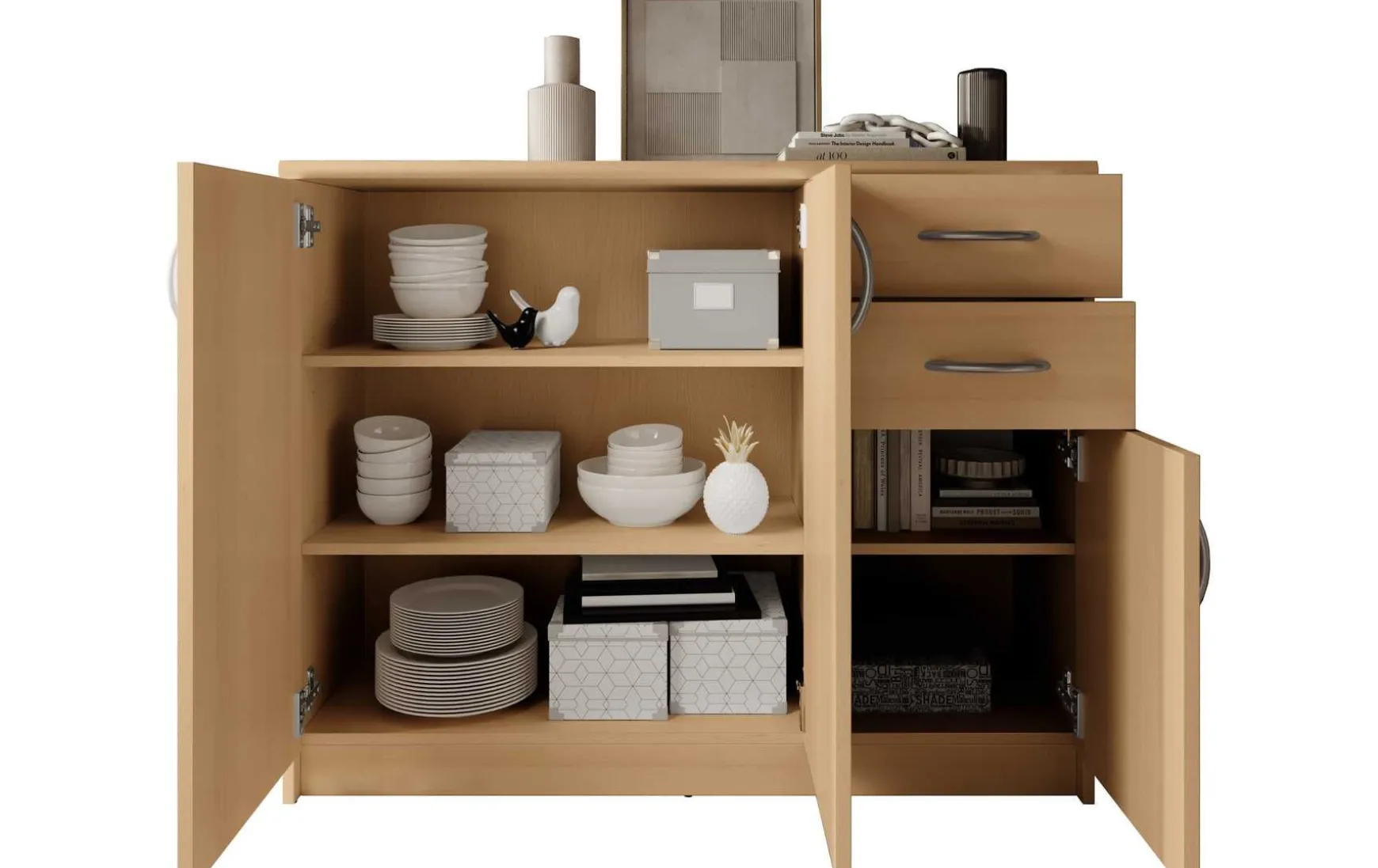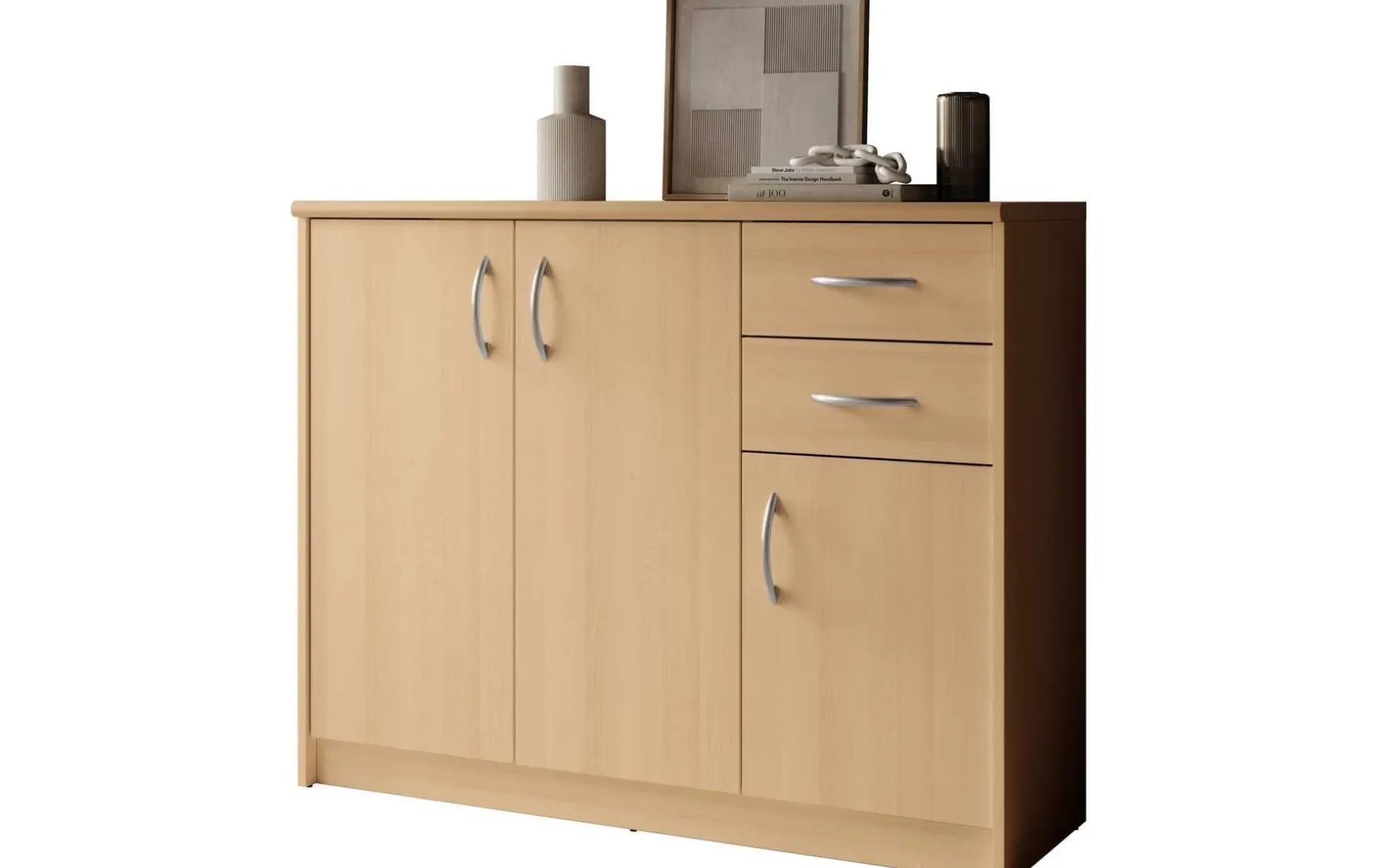 Mit ihrem schlichten aber zeitlos elegantem Design mit Dekor in Buche fügt sich diese Kommode in jeden Wohnraum hervorragend ein. Hinter der Doppeltür befindet sich ein besonders großer Stauraum, der von 2 höhenverstellbaren Einlegeböden unterteilt wird. Ein weiterer Stauraum mit einem höhenverstellbaren Einlegeboden befindet sich hinter der dritten Tür. In Kombination mit den beiden Schubladen ergibt sich somit reichlich Platz für allerlei Utensilien.