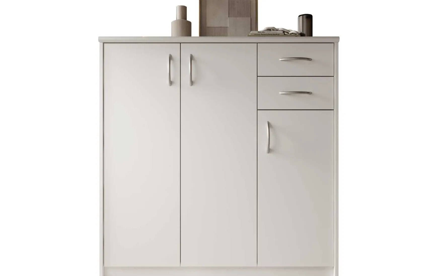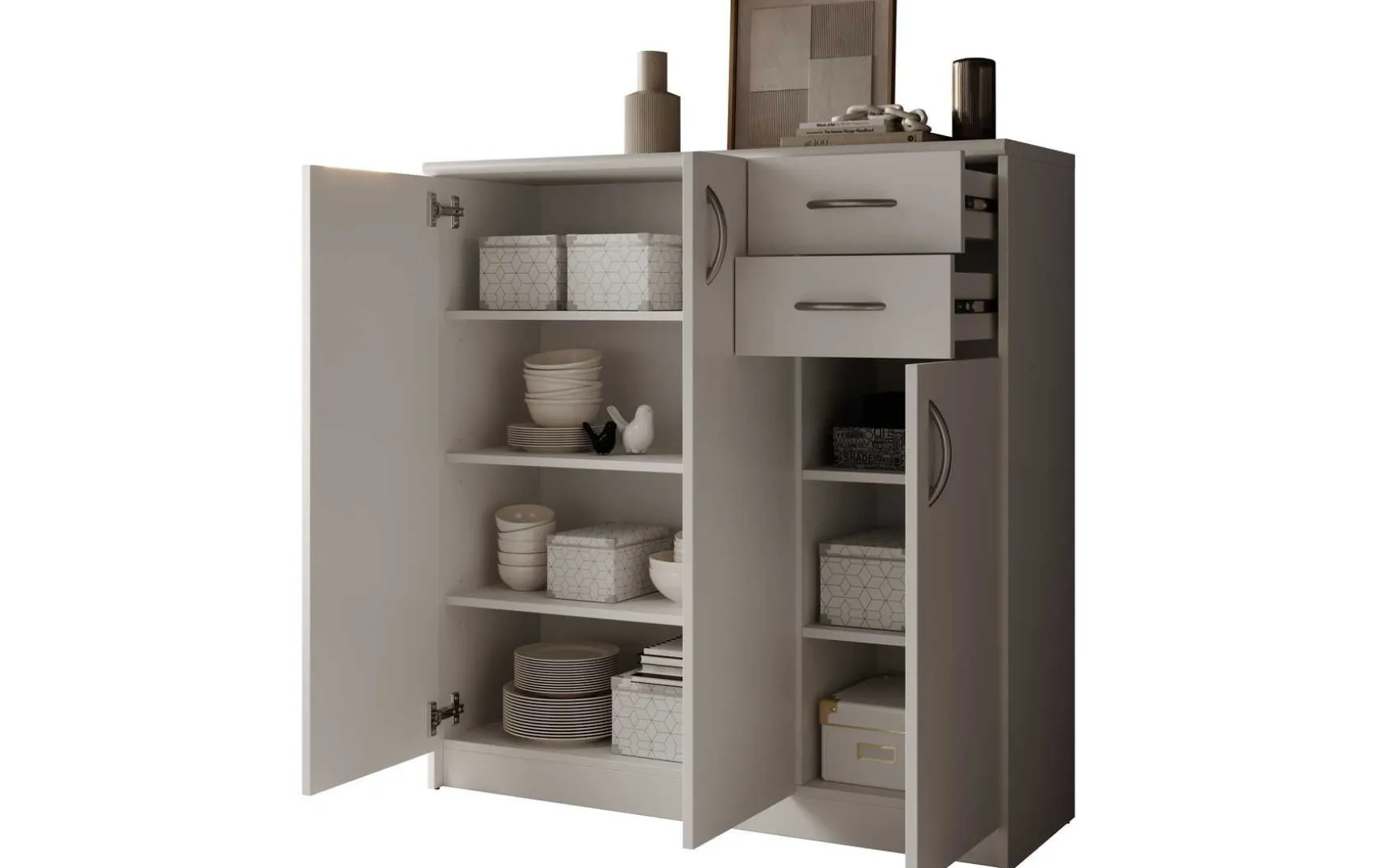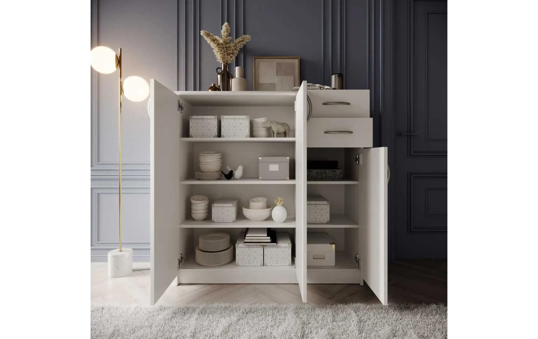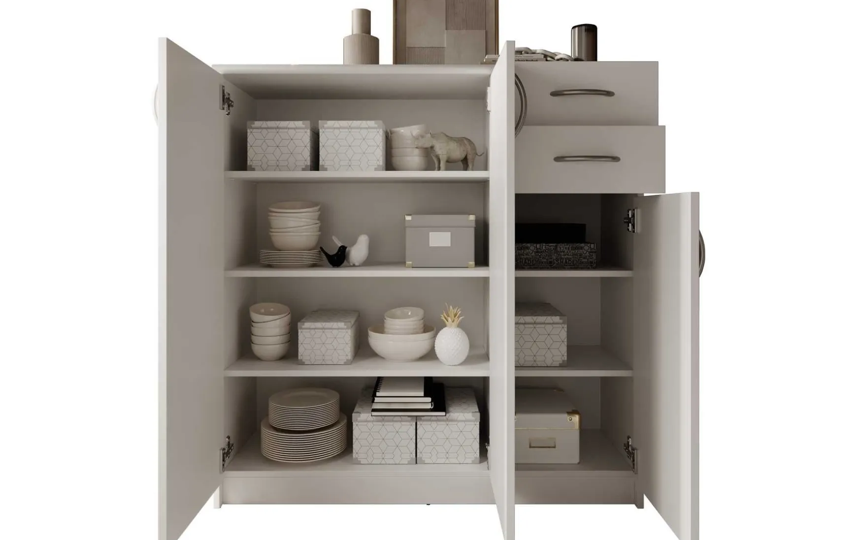Mit ihrem schlichten aber zeitlos elegantem Design mit Dekor in Weiß fügt sich diese Kommode in jeden Wohnraum hervorragend ein. Hinter der Doppeltür befindet sich ein besonders großer Stauraum, der von 3 höhenverstellbaren Einlegeböden unterteilt wird. Ein weiterer Stauraum mit 2 höhenverstellbaren Einlegeböden befindet sich hinter der dritten Tür. In Kombination mit den beiden Schubladen ergibt sich somit reichlich Platz für allerlei Utensilien.