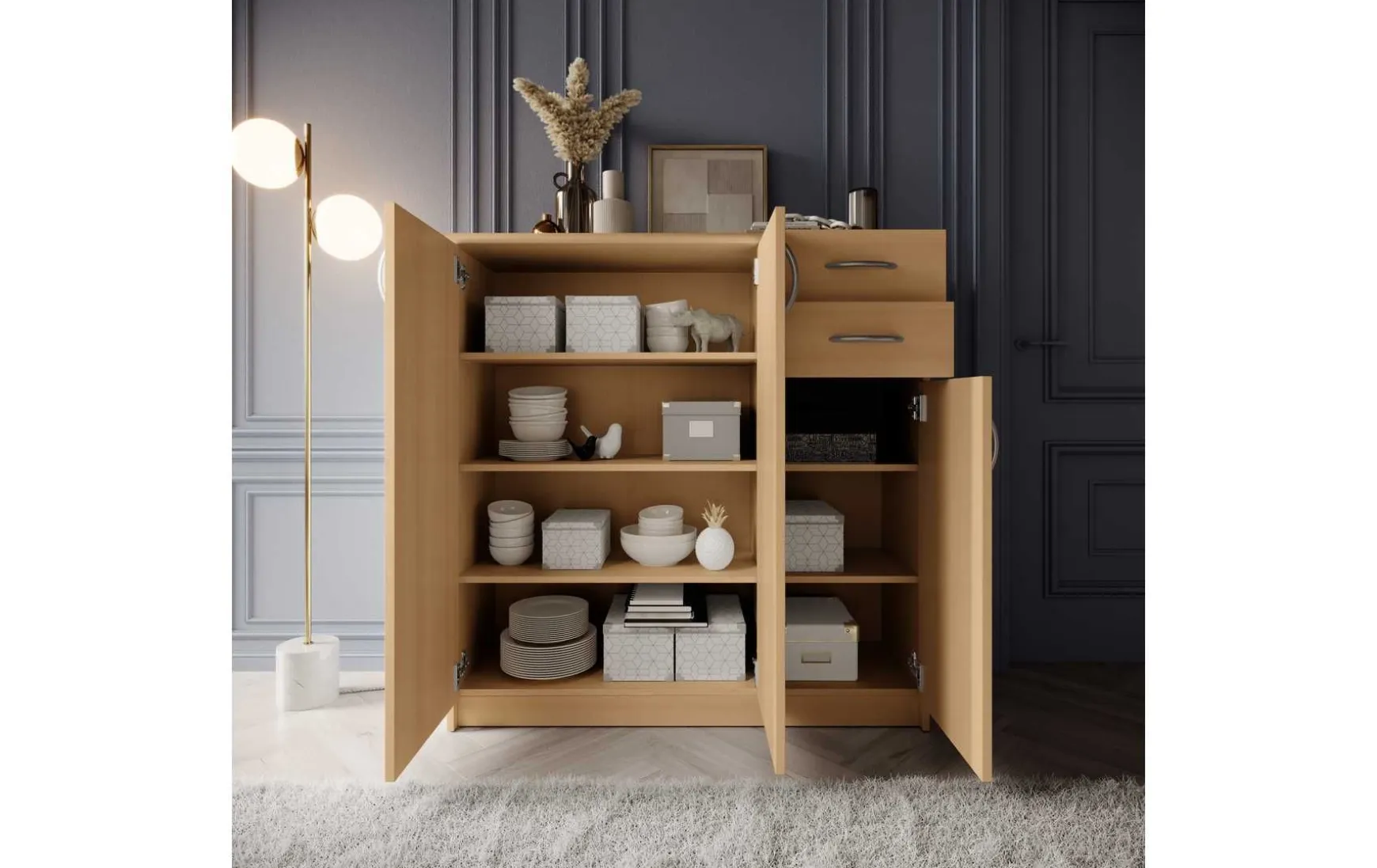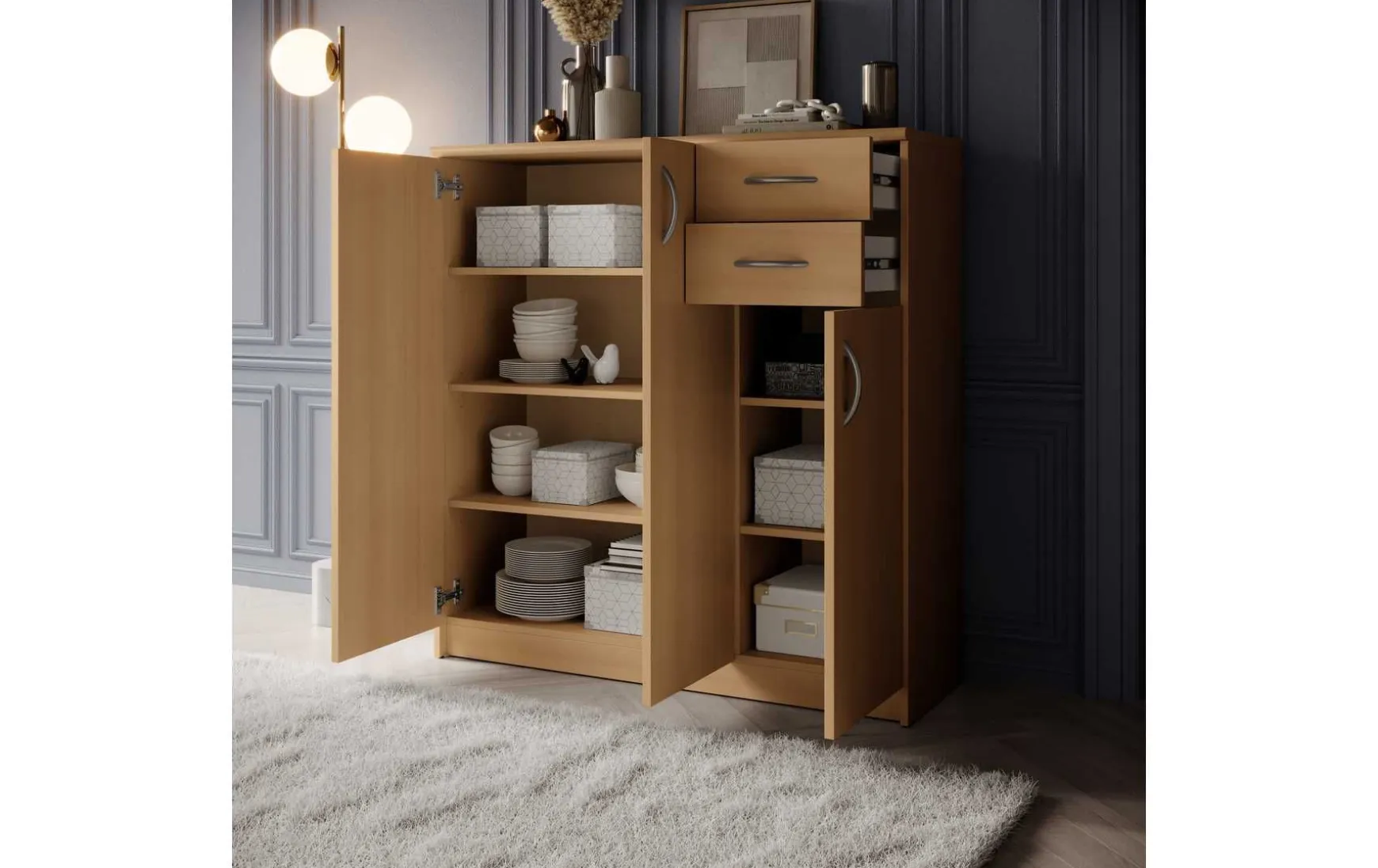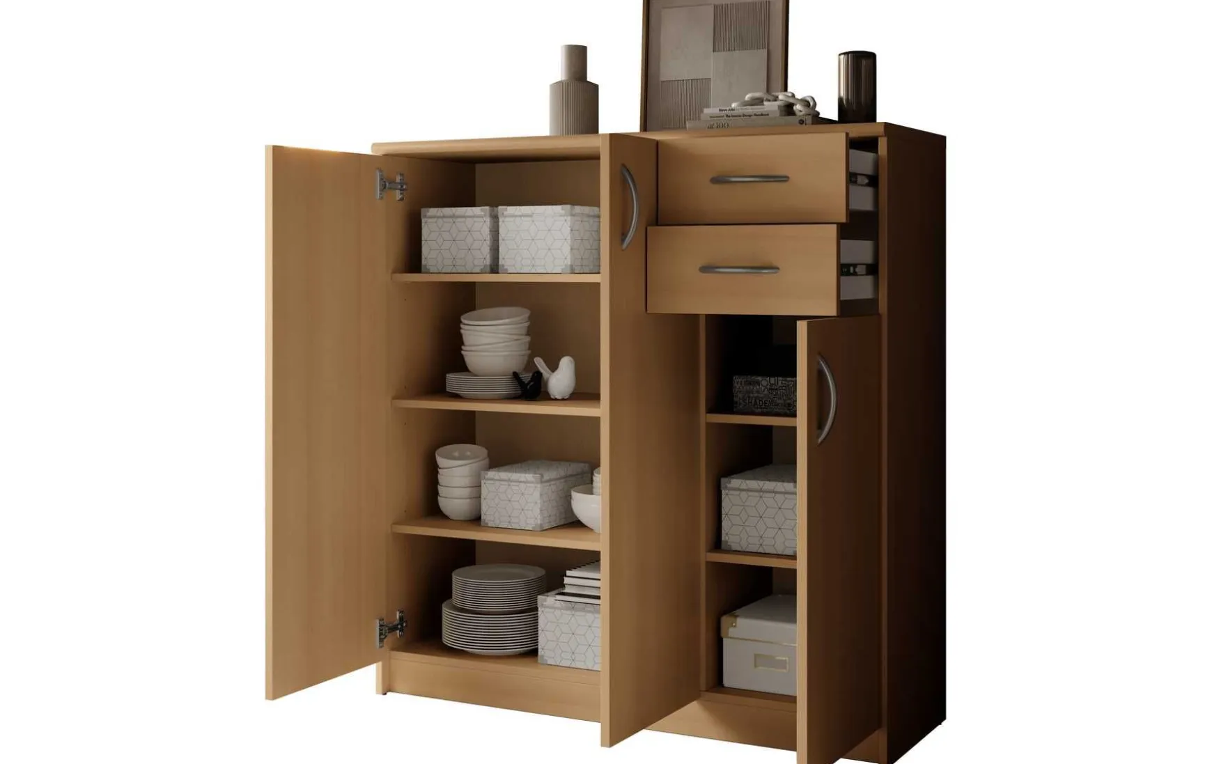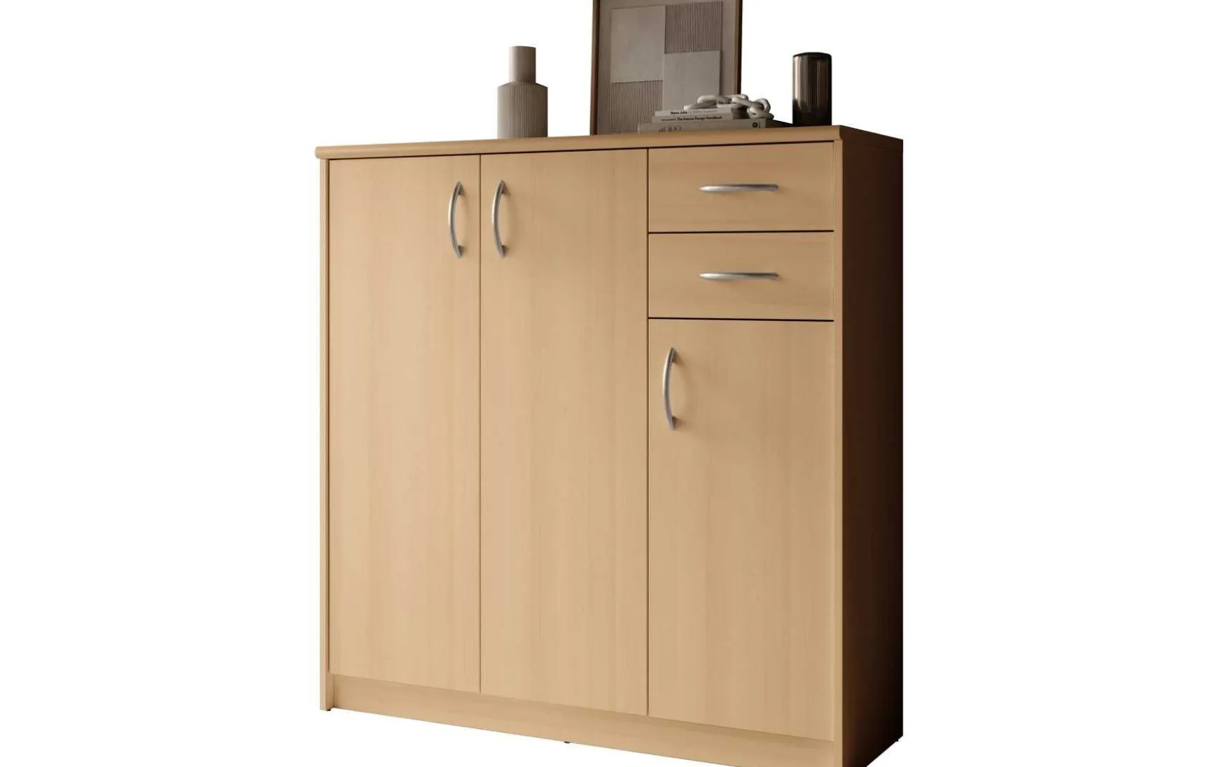Mit ihrem schlichten aber zeitlos elegantem Design mit Dekor in Buche fügt sich diese Kommode in jeden Wohnraum hervorragend ein. Hinter der Doppeltür befindet sich ein besonders großer Stauraum, der von 3 höhenverstellbaren Einlegeböden unterteilt wird. Ein weiterer Stauraum mit 2 höhenverstellbaren Einlegeböden befindet sich hinter der dritten Tür. In Kombination mit den beiden Schubladen ergibt sich somit reichlich Platz für allerlei Utensilien.
