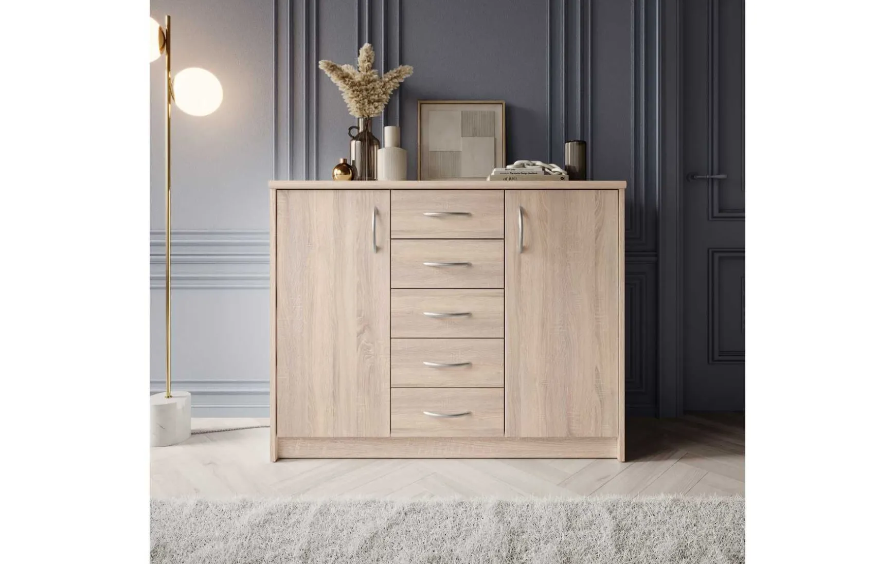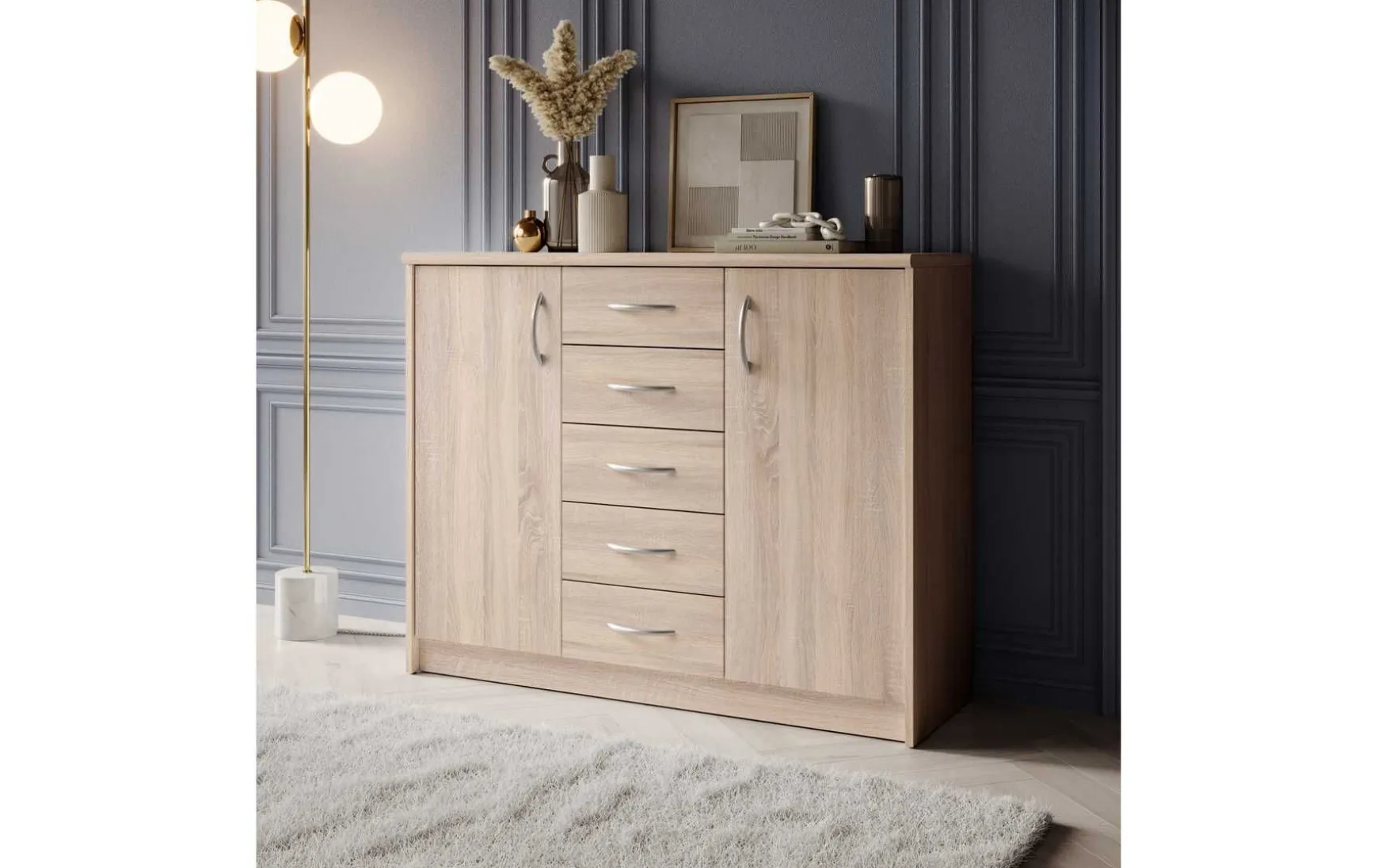 Mit ihrem schlichten aber zeitlos elegantem Design mit Dekor in Eiche Sonoma fügt sich diese Kommode in jeden Wohnraum hervorragend ein. Hinter den beiden Türen befindet sich jeweils ein großer Stauraum, der von 2 höhenverstellbaren Einlegeböden unterteilt wird. In Kombination mit den 5 Schubladen ergibt sich somit reichlich Platz für allerlei Utensilien.