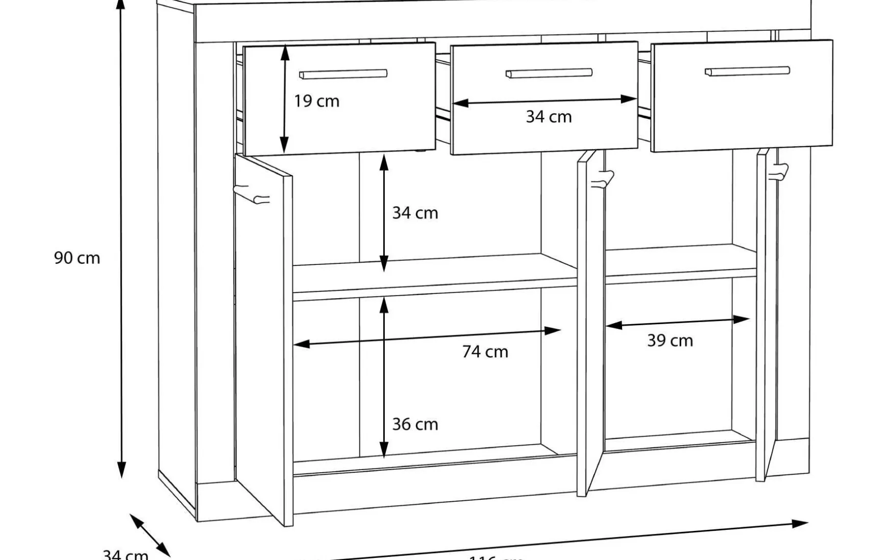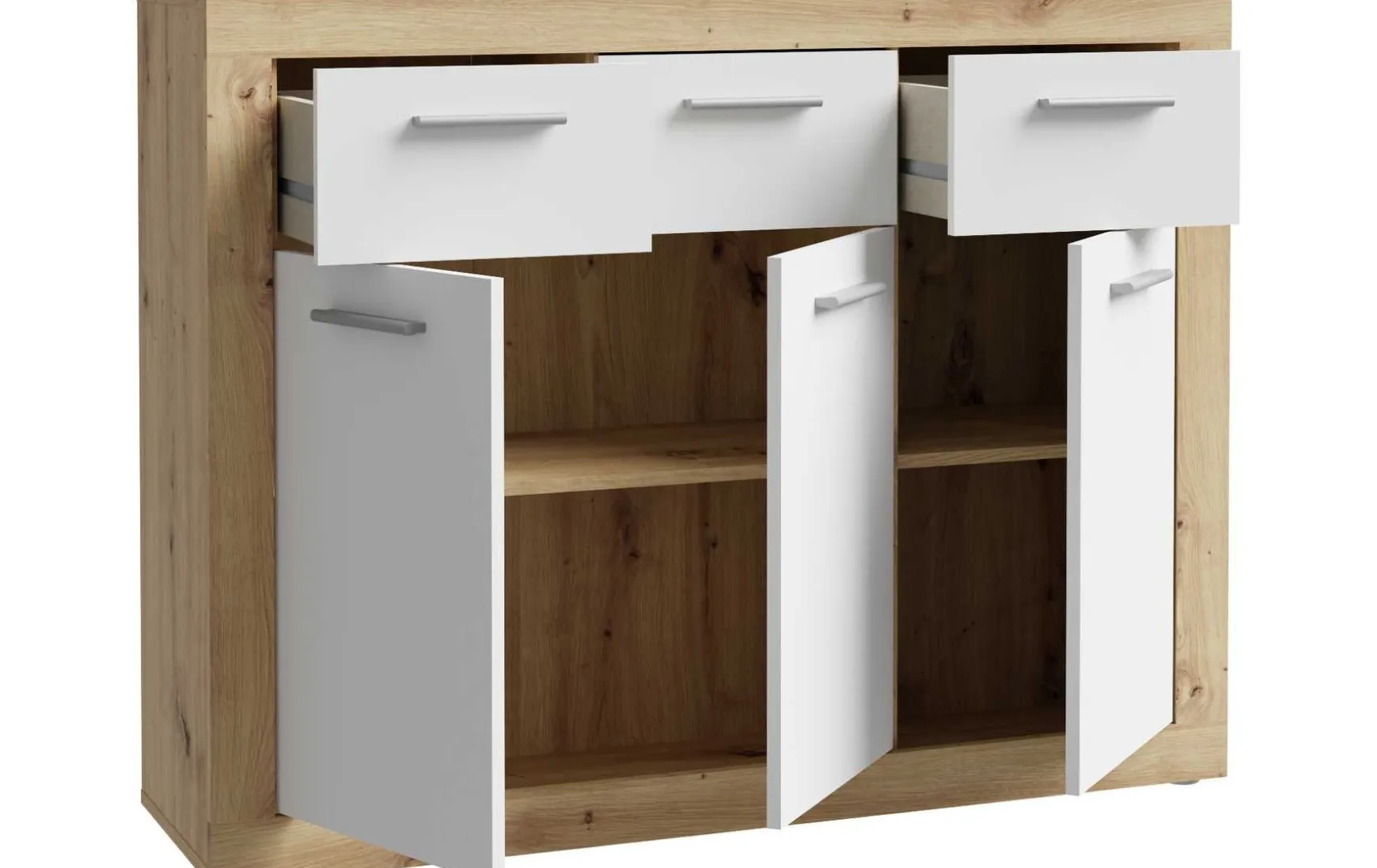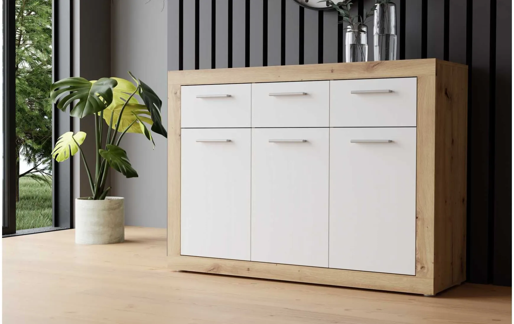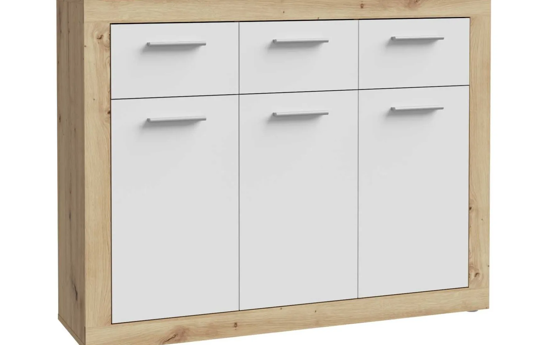 Die Kommode überzeugt durch ihr kompaktes Design und durchdachte Aufteilung. Mit zwei Türen, zwei Schubkästen und einem Einlegeboden bietet sie praktischen Stauraum für Wohn-, Ess- oder Flurbereich.