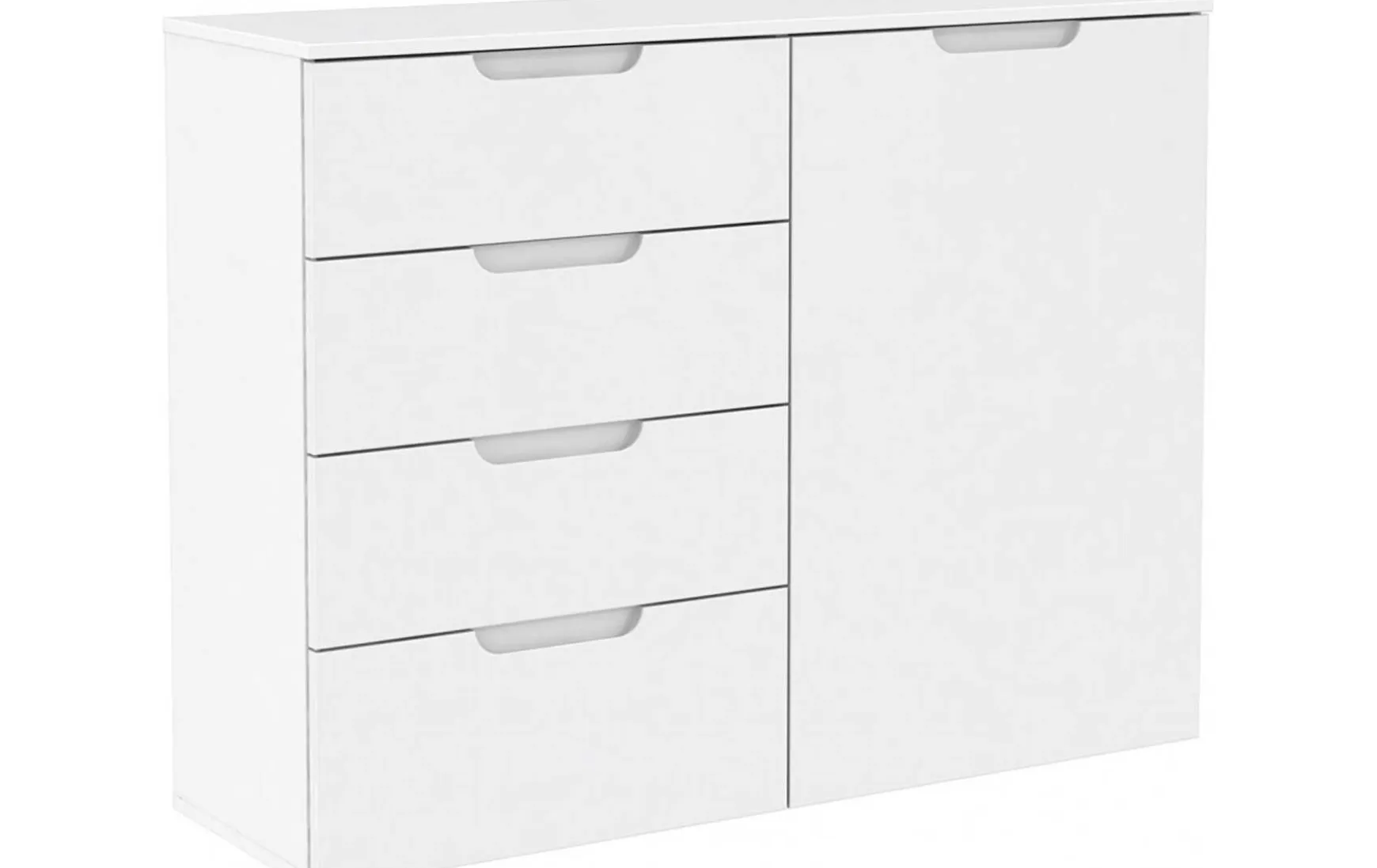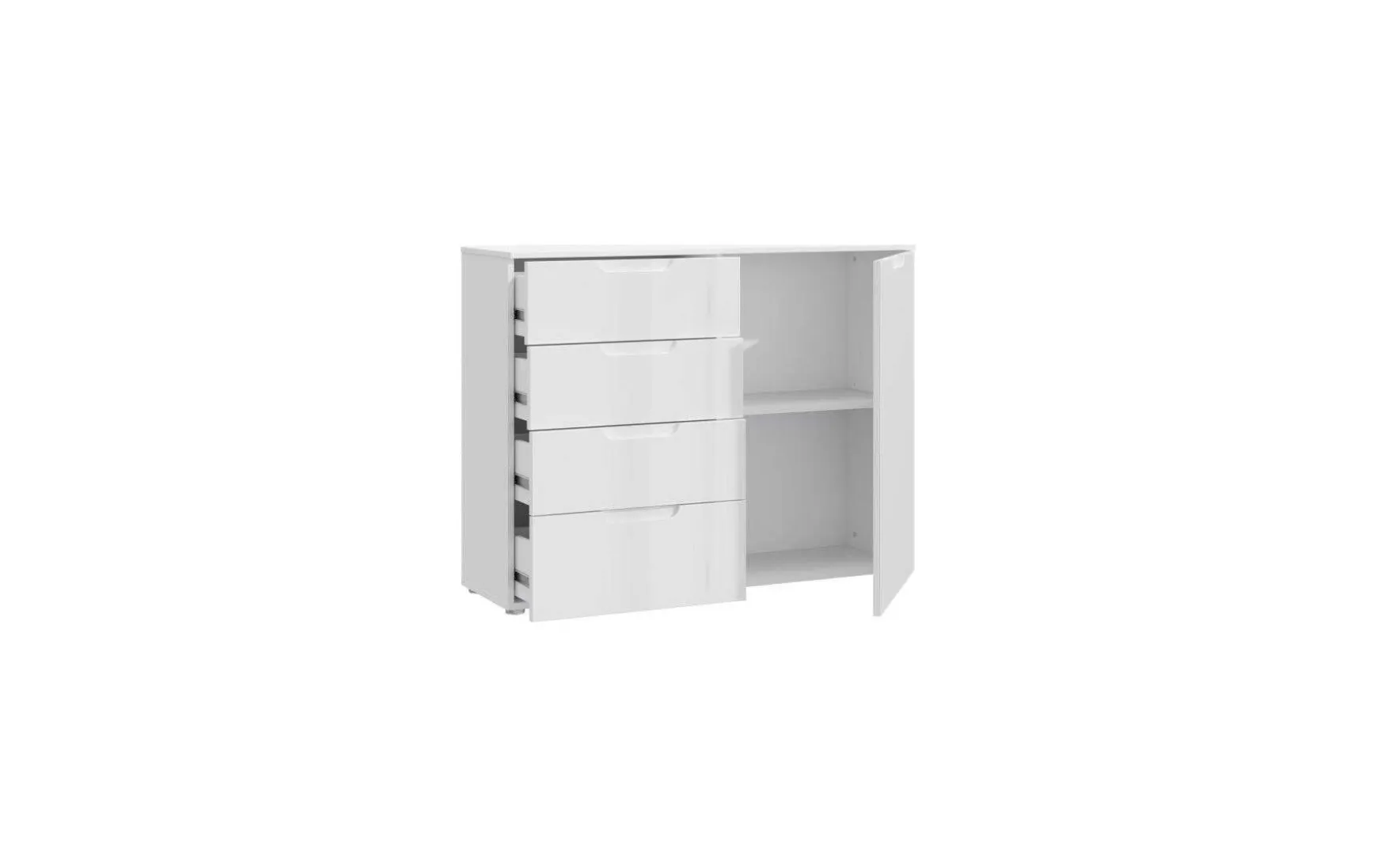 Durch das moderne Design in Weiß Hochglanz bringt diese Kommode viel Helligkeit in jeden Raum. Hinter der großen Tür verbergen sich 2 geräumige Fächer die, zusammen mit den 4 Schubladen, sehr viel Stauraum bieten.