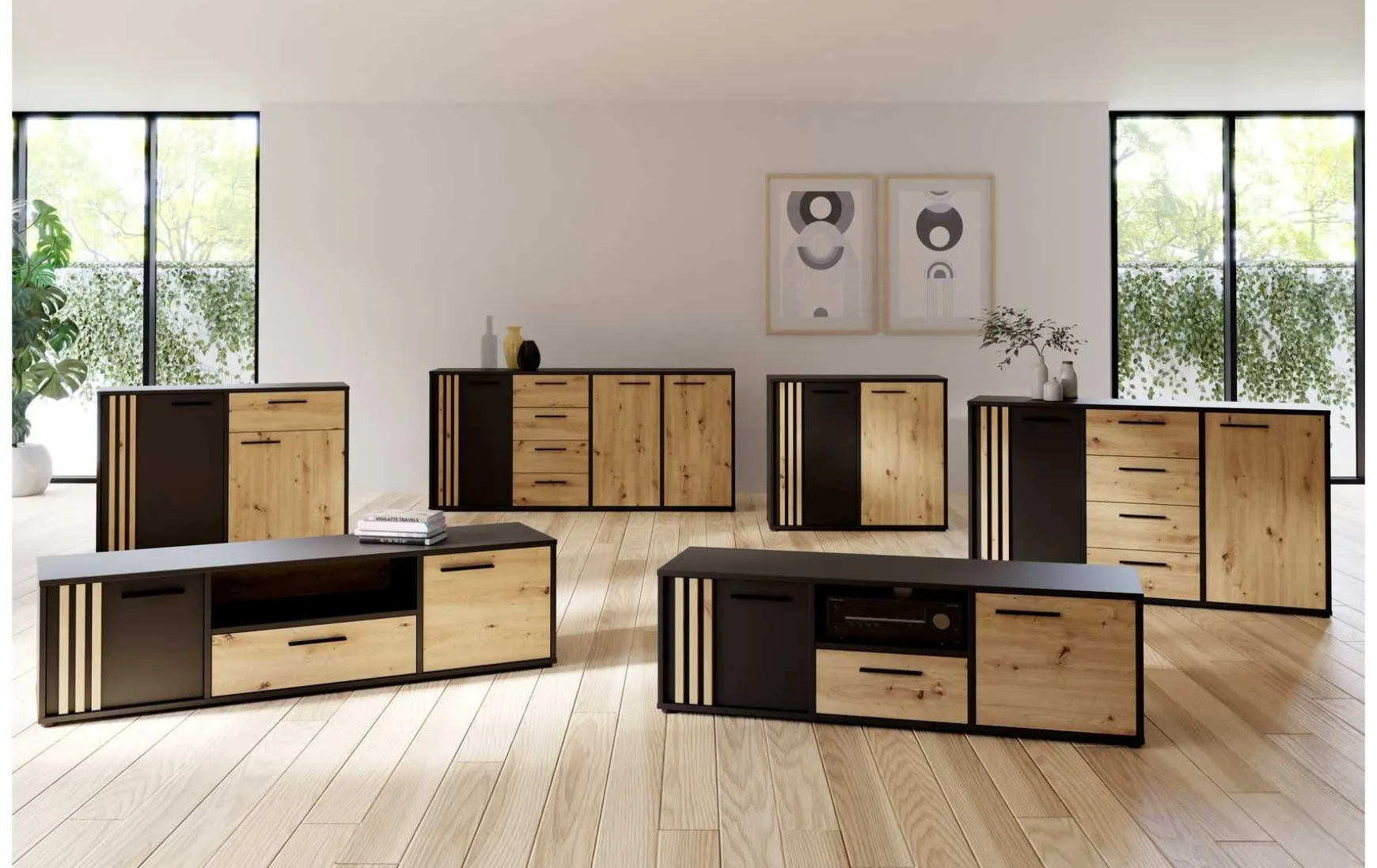 Diese moderne Kommode in Artisan Eiche NB vereint elegantes Design mit viel Stauraum und praktischer Funktionalität. Die warme Holzoptik kombiniert mit schwarzen Griffen und Füßen sorgt für ein zeitgemäßes, stilvolles Erscheinungsbild, das sich harmonisch in verschiedene Wohnbereiche einfügt. Hinter den zwei Drehtüren und in den vier Schubladen lassen sich Haushaltsgegenstände, Dokumente oder Accessoires ordentlich verstauen. Mit ihren Maßen von ca. 142,6 × 34,8 × 82,3 cm (B/T/H) bietet die Kommode viel Stauraum, ohne dabei zu viel Platz einzunehmen. Gefertigt aus robuster Artisan Eiche NB mit pflegeleichten Oberflächen, ist die Kommode langlebig und einfach zu reinigen. Der Schrank wird zerlegt geliefert und lässt sich unkompliziert montieren.