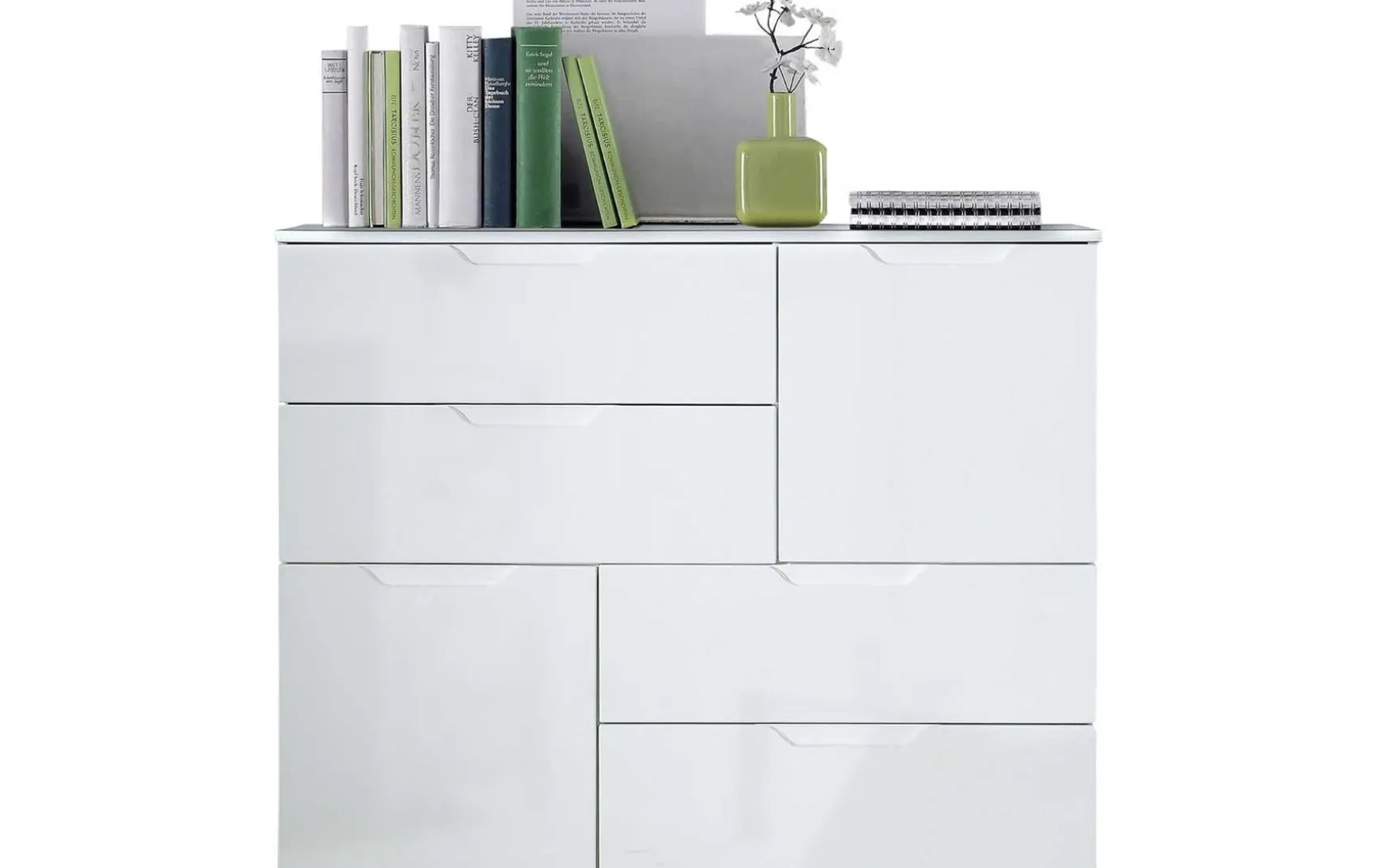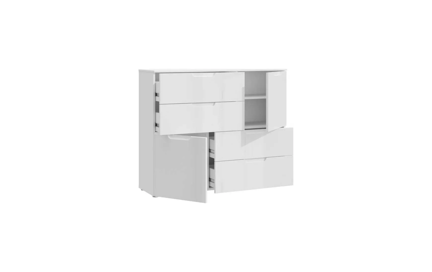 Durch das moderne Design in Weiß Hochglanz bringt diese Kommode viel Helligkeit in jeden Raum. Hinter den beiden Türen verbirgt sich jeweils ein höhenverstellbarer Einlegeboden. Zusammen mit den 4 Schubladen ergibt sich somit sehr viel Stauraum. Als besonderes Designhighlight sind die beiden Türen oben und unten seitlich versetzt, wodurch diese Kommode definitiv zum Blickfang in jedem Wohnraum wird.