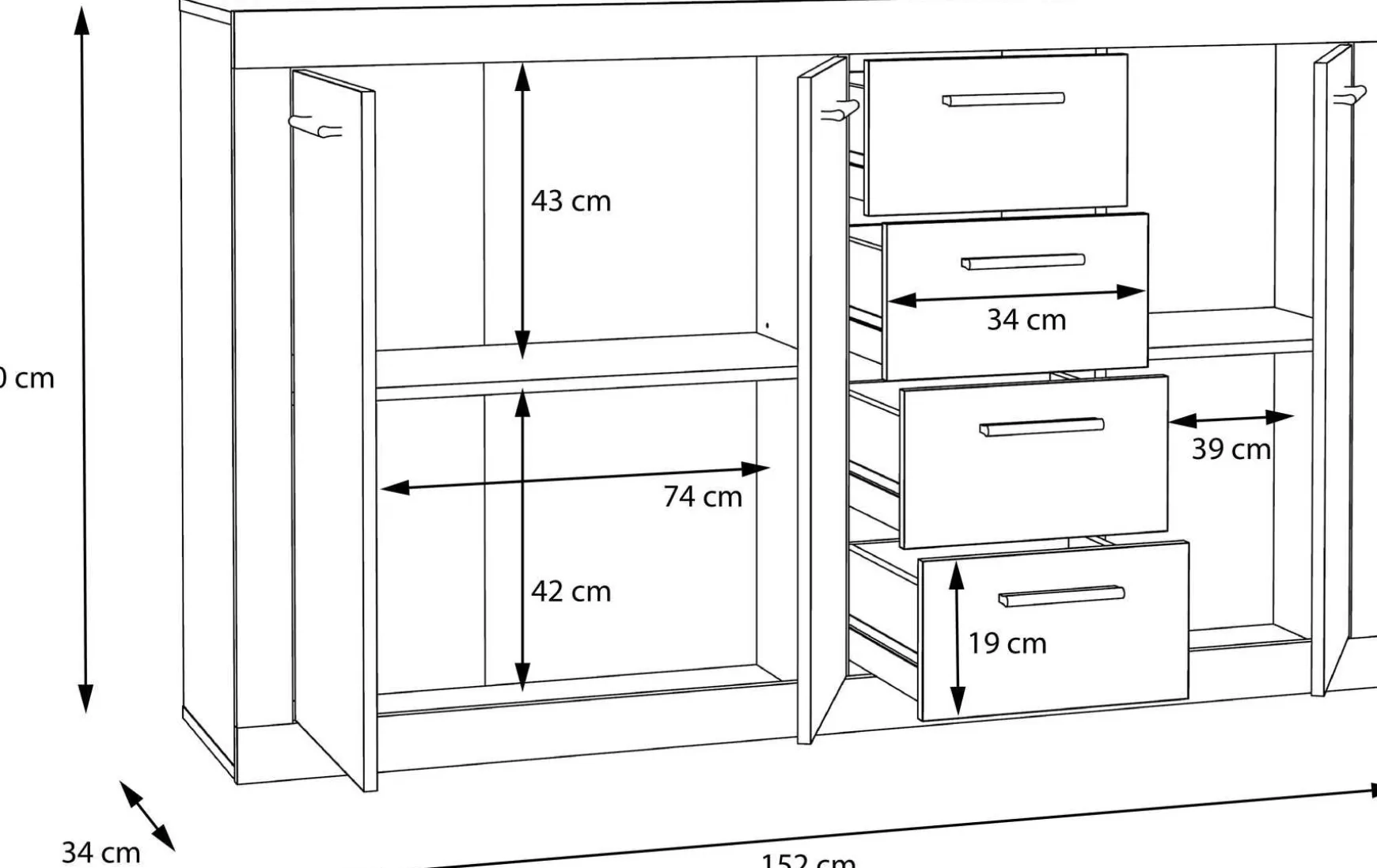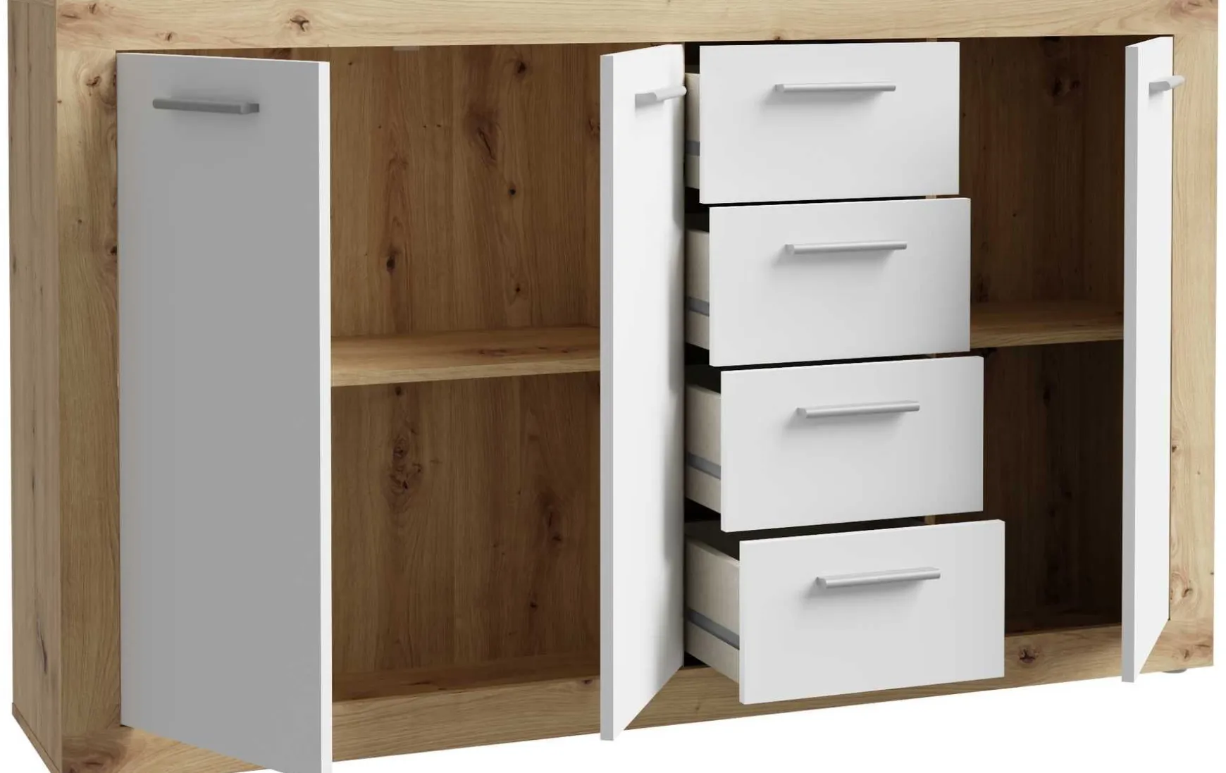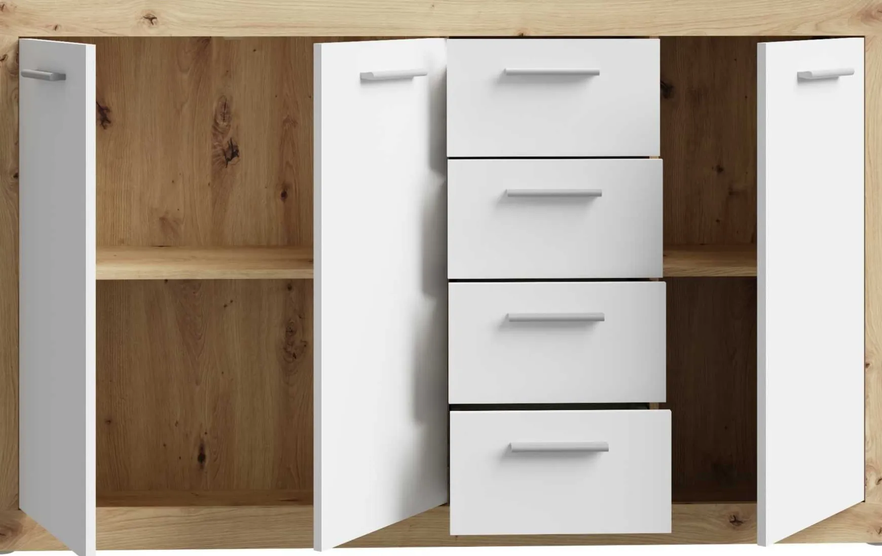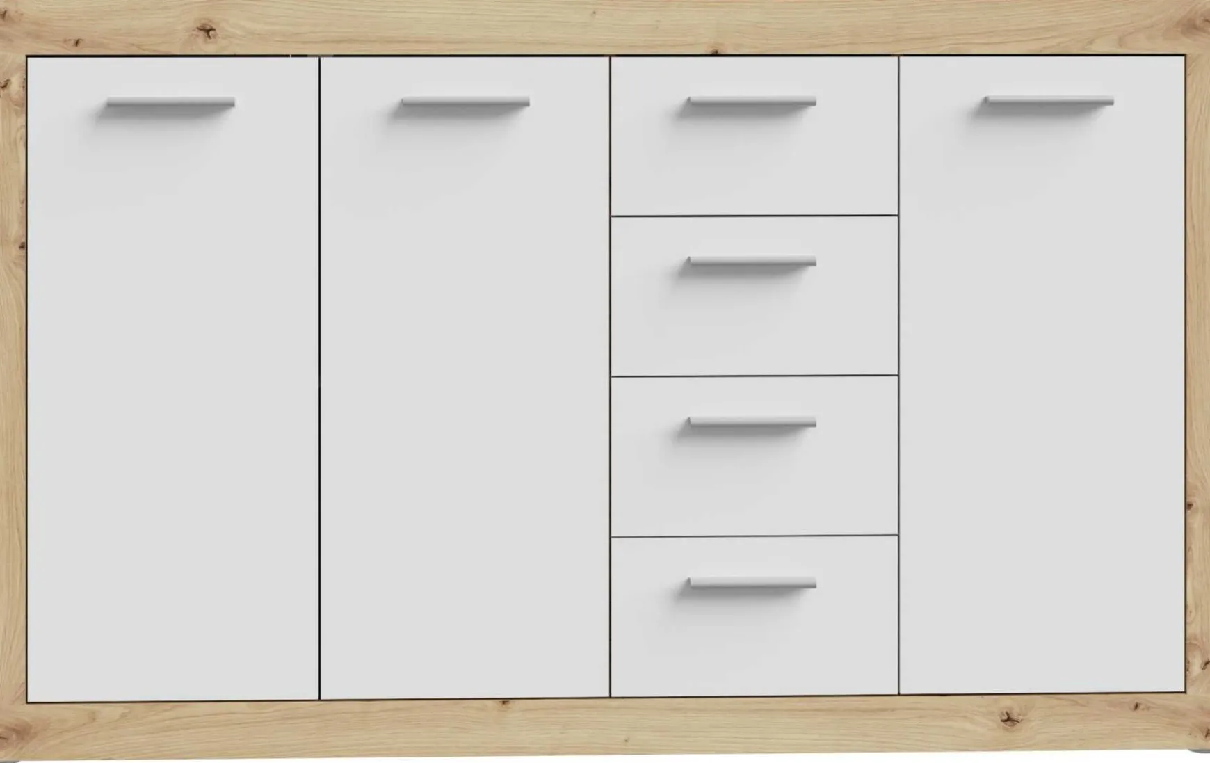 Die Kommode überzeugt durch ihr kompaktes Design und durchdachte Aufteilung. Mit zwei Türen, zwei Schubkästen und einem Einlegeboden bietet sie praktischen Stauraum für Wohn-, Ess- oder Flurbereich.