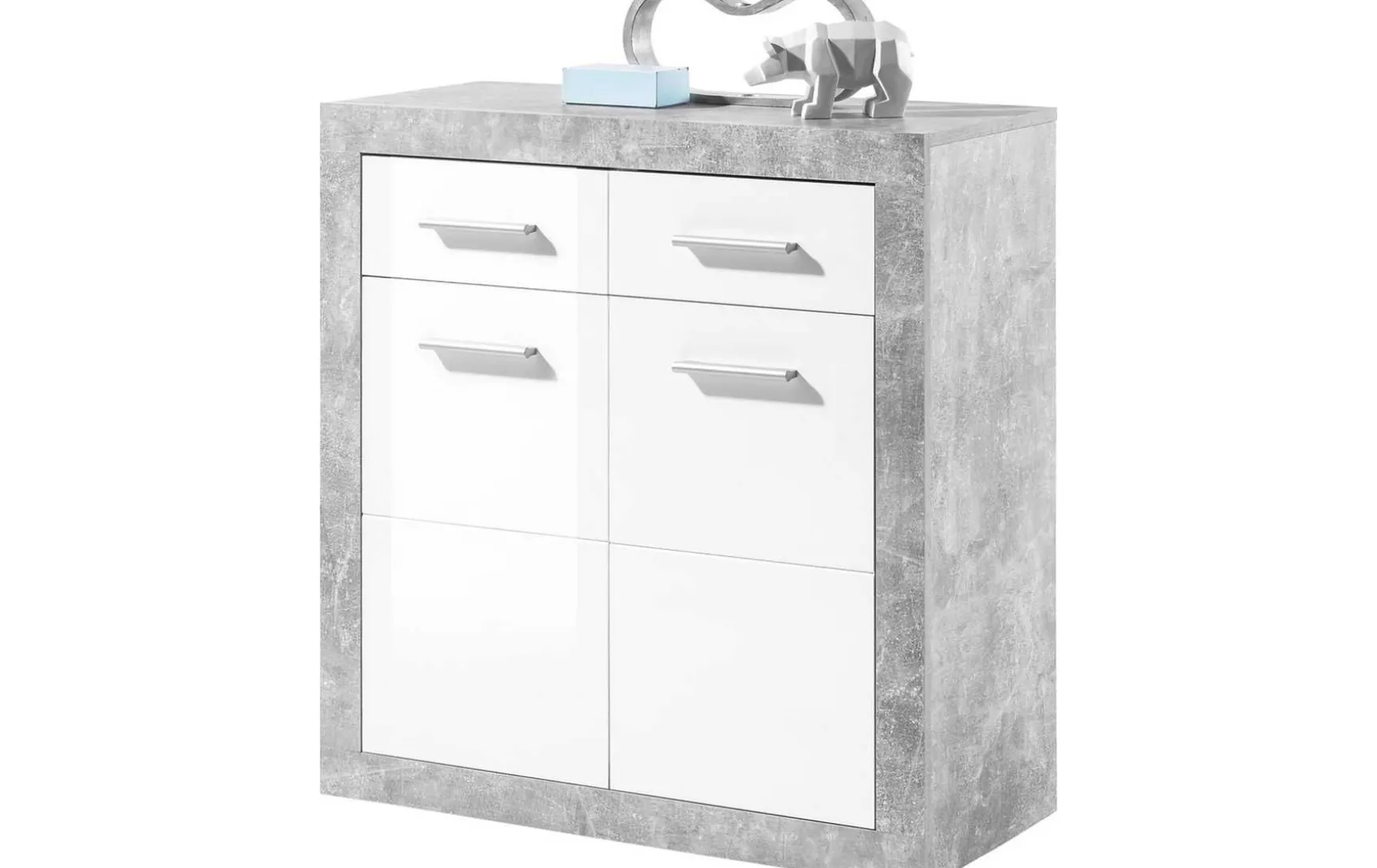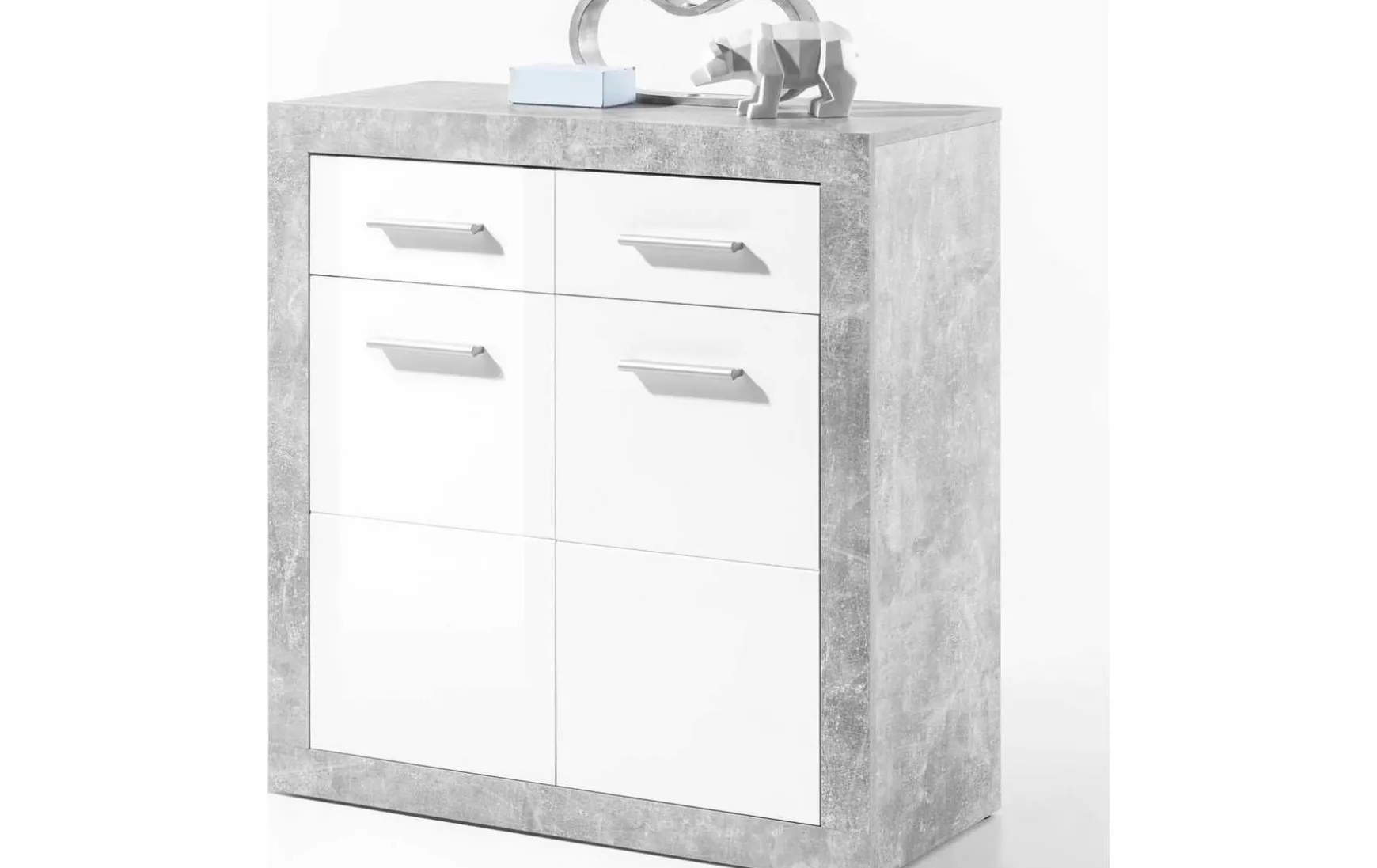 Das moderne Design besticht durch die breiten Korpuswände in Betonoptik mit Weiß glänzenden Fronten. Dadurch passt diese Kommode ideal in Vorräume, macht sich aber auch sehr gut als besonderer Blickfang in anderen Wohnräumen. Hinter der großen Doppeltür verbirgt sich ein besonders großer Stauraum mit einem höhenverstellbaren Einlegeboden. Zusammen mit den beiden Schubladen ergibt sich somit jede Menge Platz für die unterschiedlichsten Utensilien.