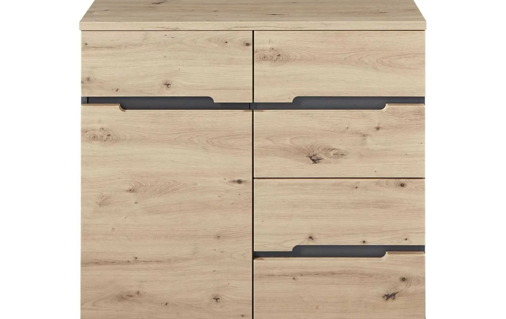 Diese Kommode verbindet modernes Design mit praktischem Stauraum. Die hochwertige Verarbeitung sowie die harmonische Kombination aus Artisan Eiche und Graphit verleihen ihr eine zeitgemäße Optik. Dezente Griffausfräsungen an den Fronten setzen dabei stilvolle Akzente und unterstreichen das klare Design.