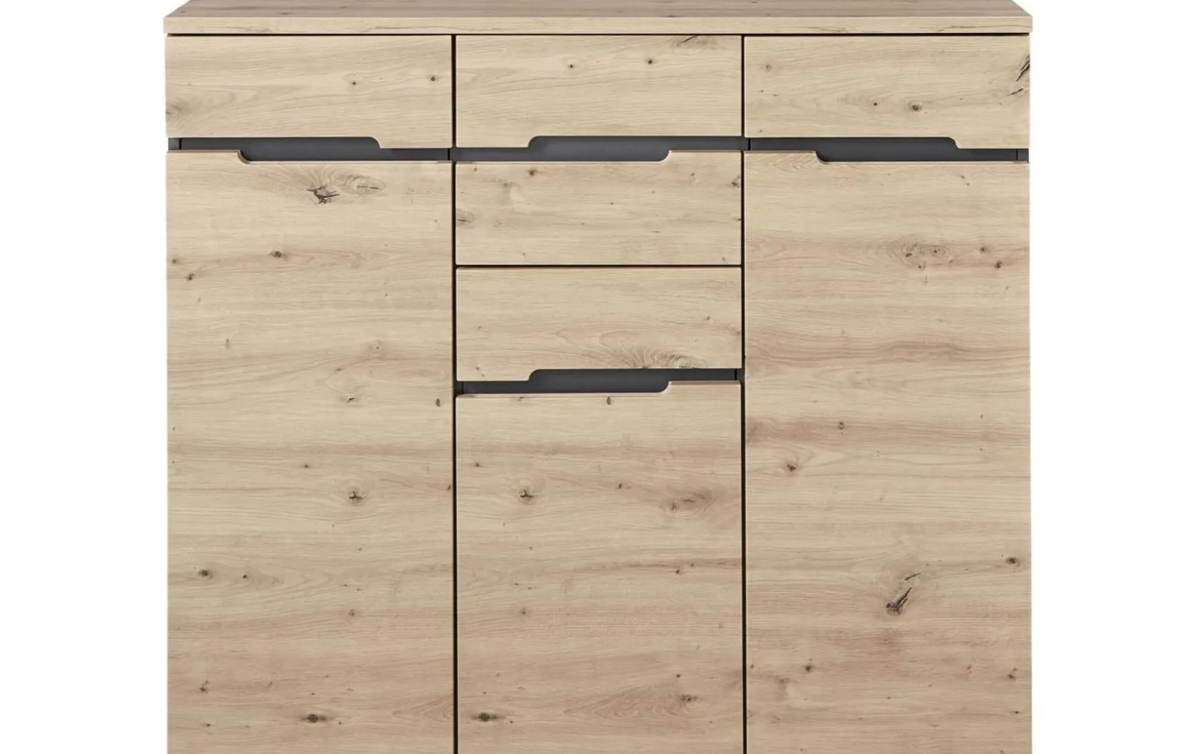 Diese Kommode verbindet modernes Design mit praktischem Stauraum. Die hochwertige Verarbeitung sowie die harmonische Kombination aus Artisan Eiche und Graphit verleihen ihr eine zeitgemäße Optik. Dezente Griffausfräsungen an den Fronten setzen dabei stilvolle Akzente und unterstreichen das klare Design.