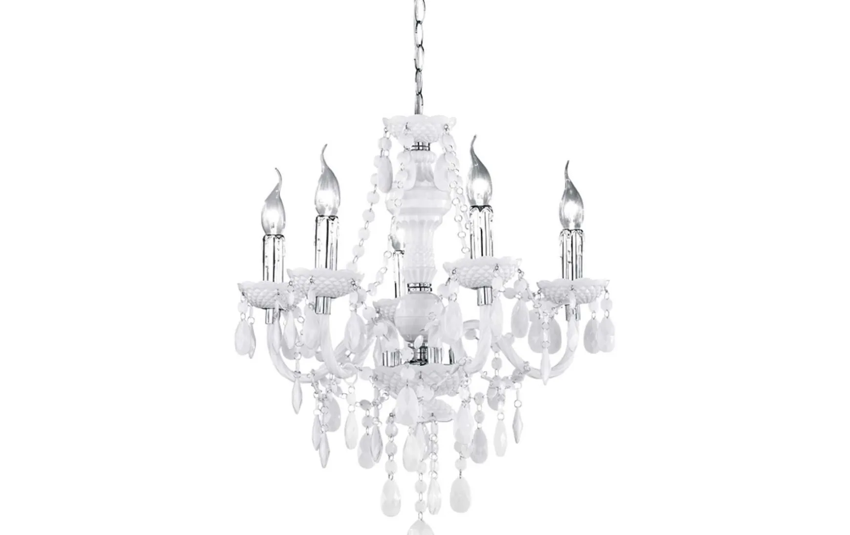 Dieser funkelnde Kronleuchter zieht alle Blicke auf sich. Der glamouröse Hingucker passt ideal in moderne und klassische Einrichtungsstile und überzeugt durch geschmackvolles Design und erstklassige Lichtverhältnisse. Die 5-flammige Leuchte hat eine Abhängung von 150 cm und einen Durchmesser von 52 cm. Die Farbgestaltung in Metall Chrom und dem weißen Kristallbehang aus Acryl ergänzt sich perfekt und lässt ein harmonisches Gesamtbild entstehen. Für eine energiesparende Beleuchtung empfiehlt sich die Verwendung eines LED Leuchtmittels. Diese sind eine optimale Alternative zu herkömmlichen Halogen Leuchtmitteln und stehen für eine hohe Lichtqualität und eine Energieeinsparung von bis zu 80%. Zusätzlich profitieren Sie bei LED Leuchtmitteln von einer langen Lebensdauer, einer geringen Wärmeentwicklung und schonen gleichzeitig die Umwelt.