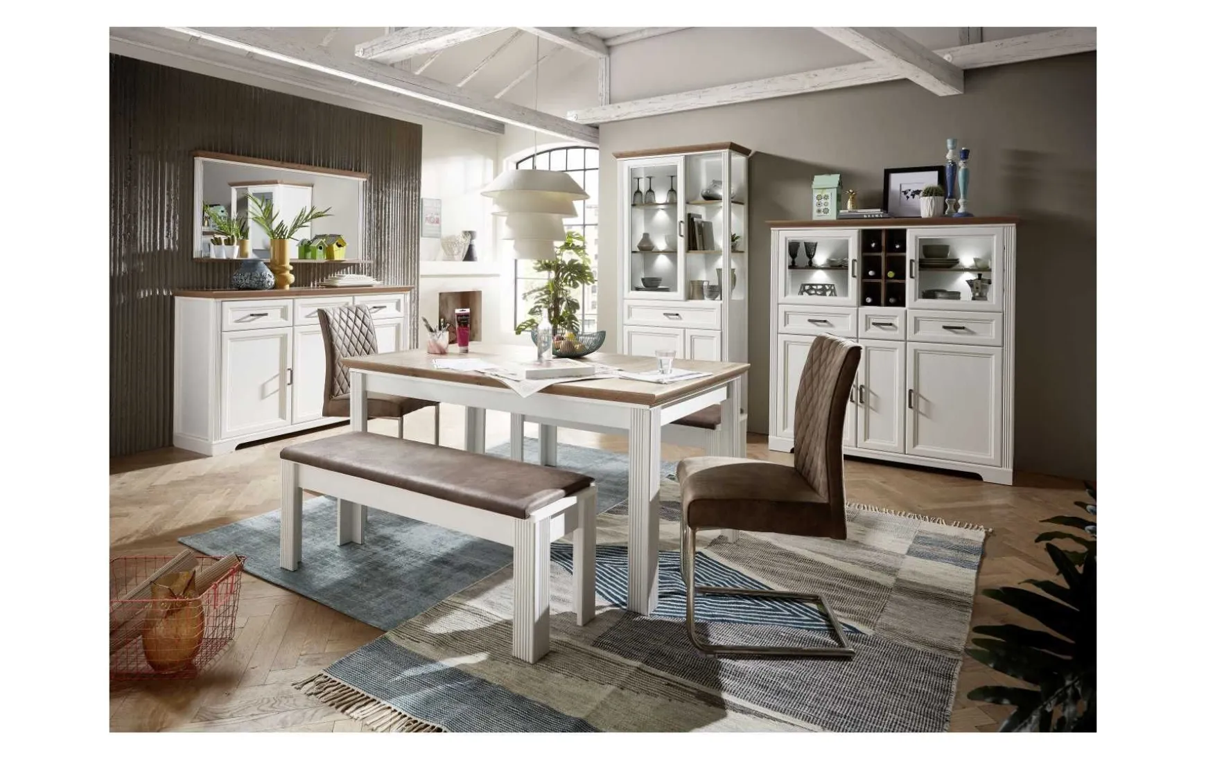 Das schlichte Design der Esszimmerbank in Pinie hell und Artisan Eiche ist im modernen Landhausstil. Die hier angebotene Sitzbank ist inklusive Klemmkissen mit braunem Stoffbezugt.