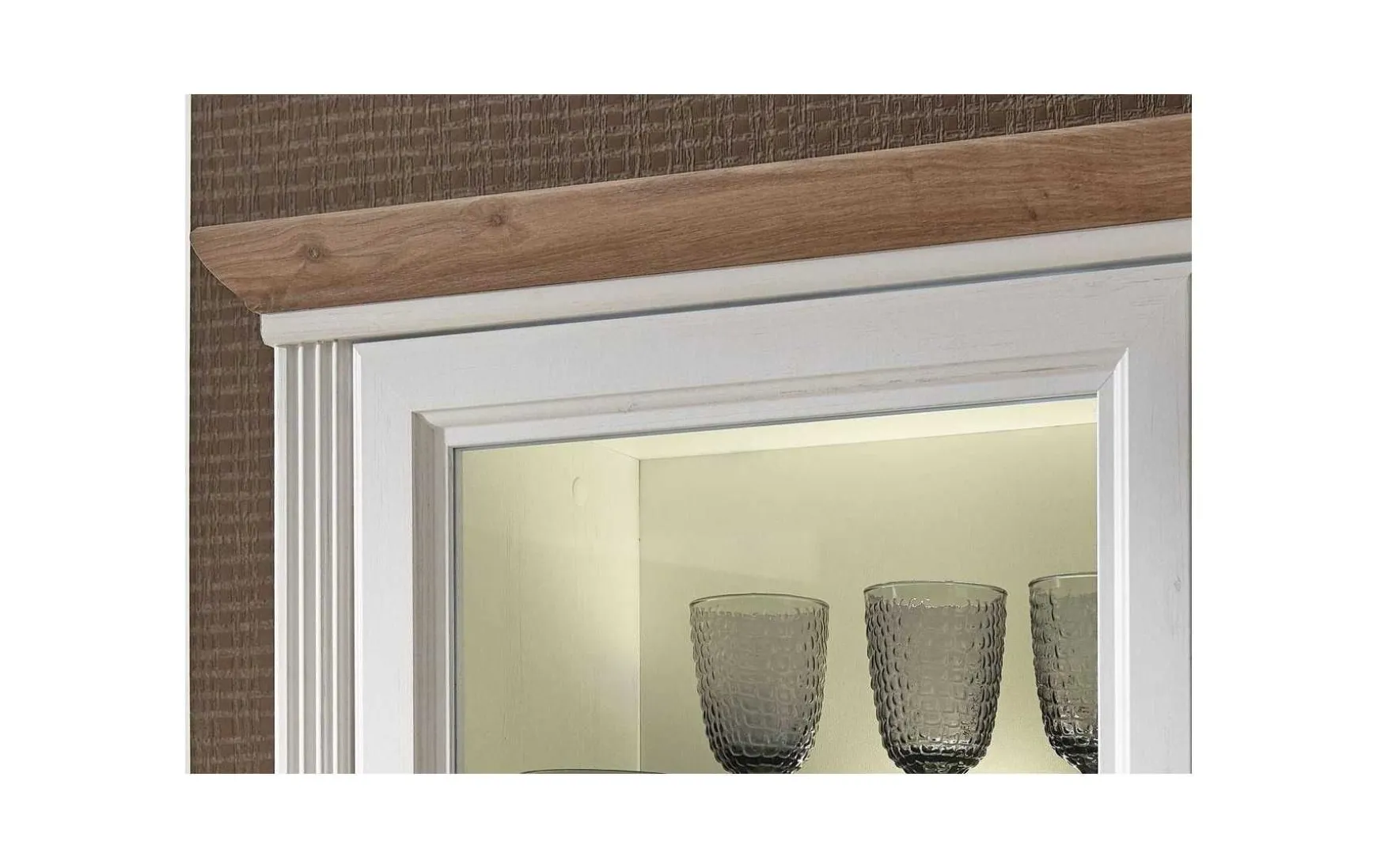 Diese schmale Vitrine mit großzügigem Stauraum im ansehnlichen Pinie hell und Artisan Eiche präsentiert sich im romantischen Landhaus-Stil. Die wunderbare Rahmenoptik und die harmonischen Farben sorgen für eine traumhafte Atmosphäre in Ihrem Wohn- und Esszimmer.