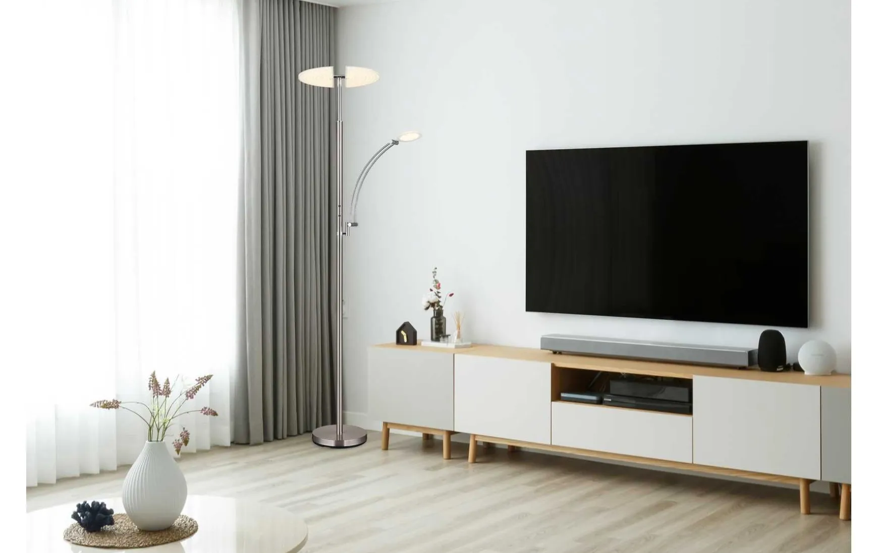 Zusätzlich verfügt der Deckenfluter über ein Leselicht (Durchmesser: 12 cm) und wird inklusive LED-Leuchtmitteln geliefert: 40W mit 4000lm Source und 2800lm Output sowie 5.5W mit 570lm Source und 400lm Output, einstellbar zwischen 2700-6000K.