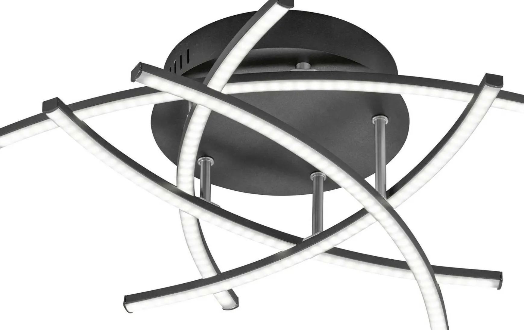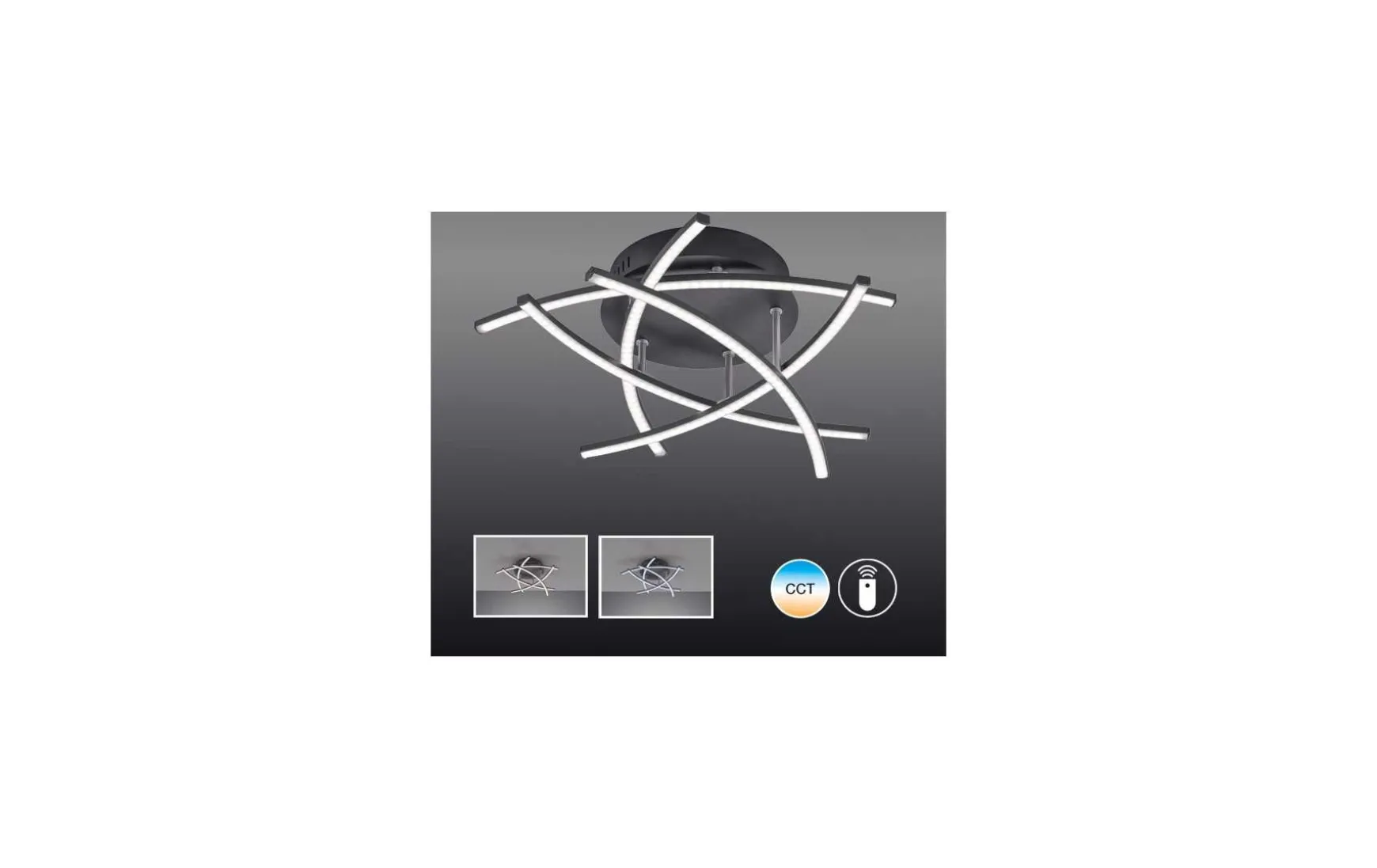 Wenn eine Deckenlampe gleichzeitig zum Dekorationsobjekt im Raum wird, dann haben Sie garantiert die richtige Entscheidung getroffen. Diese Deckenleuchte besteht aus fünf leicht gebogenen Lichtleisten, die überlagernd angeordnet sind und dadurch zum echten Eyecatcher im Raum werden. Suchen Sie nach einer wirkungsvollen Beleuchtung für Ihren Raum? Dann empfehlen wir Ihnen diese LED Deckenleuchte. Dank der Dimmbarkeit können Sie in jedem Raum immer genau die Lichtstimmung einstellen, nach der Ihnen gerade zumute ist. In der Leuchte sind die LED bereits fest eingebaut. Über eine Fernbedienung sind sie stufenlos dimmbar. Die LED sind mit der tunable White Technologie ausgestattet. Dadurch kann ein natürlicher Verlauf des Tageslichtes imitiert werden und das Licht variiert zwischen Kaltweiß und Warmweiß. Dieser Wechsel kann sich sehr positive auf die Stimmung und das Gemüt auswirken. Die LED Deckenleuchte ist hochwertig aus Metall gearbeitet. Die Farbkombination aus Sandschwarz und Nickelfarben matt wirkt sehr wertig, so dass auch Ihr Wohnzimmer optisch aufgewertet wird. Mit ihrer schlichten und zeitlosen Eleganz integriert sich diese LED Leuchte in jeden Raum. Vor allem kleine und mittelgroße Räume können Sie mit unserer LED Deckenleuchte optimal ausleuchten. Sie kennen das: Manchmal brauchen Sie helles, klares Licht, um im Wohnzimmer eine Zeitung zu lesen. Wenn es aber gemütlicher werden soll, ist das Deckenlicht oftmals viel zu hell, um zu entspannen und den Tag hinter sich zu lassen. Zum Glück ist unsere LED Lampe stufenlos dimmbar und mit der tunable White Technologie ausgestattet.