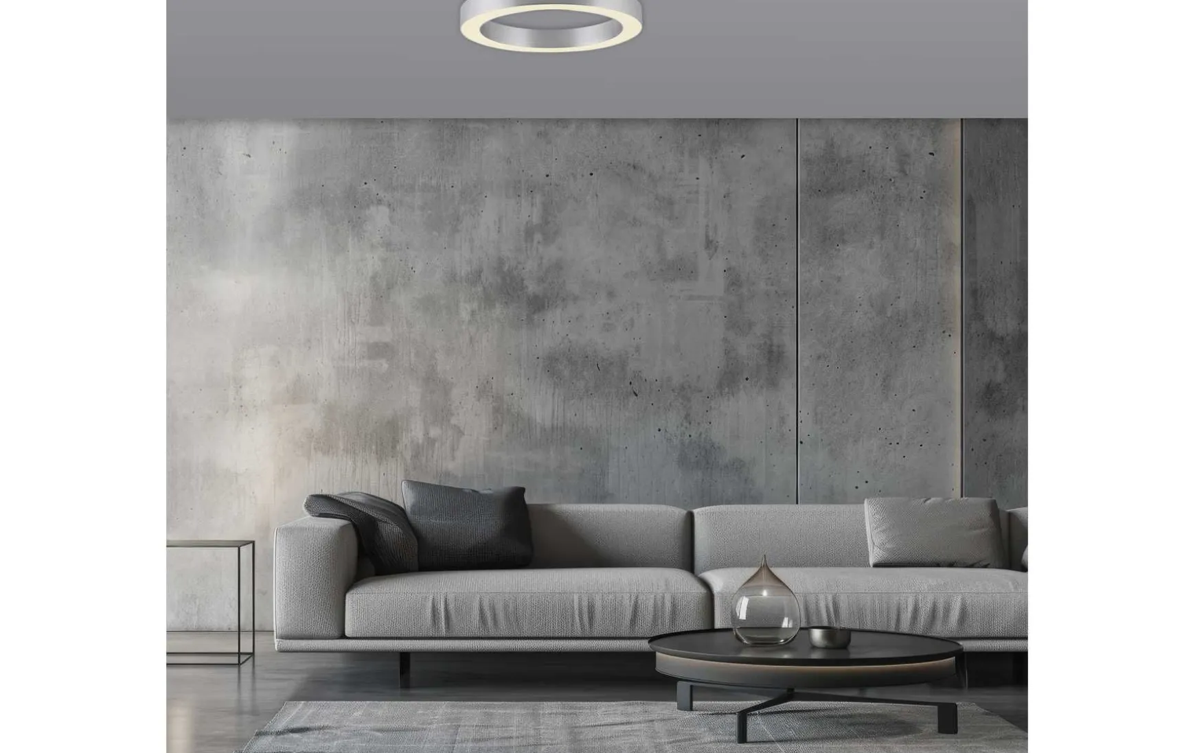 Die Deckenleuchte in Aluminium mit einem Durchmesser von 35 cm wird mit einer Funk-Fernbedienung geliefert.