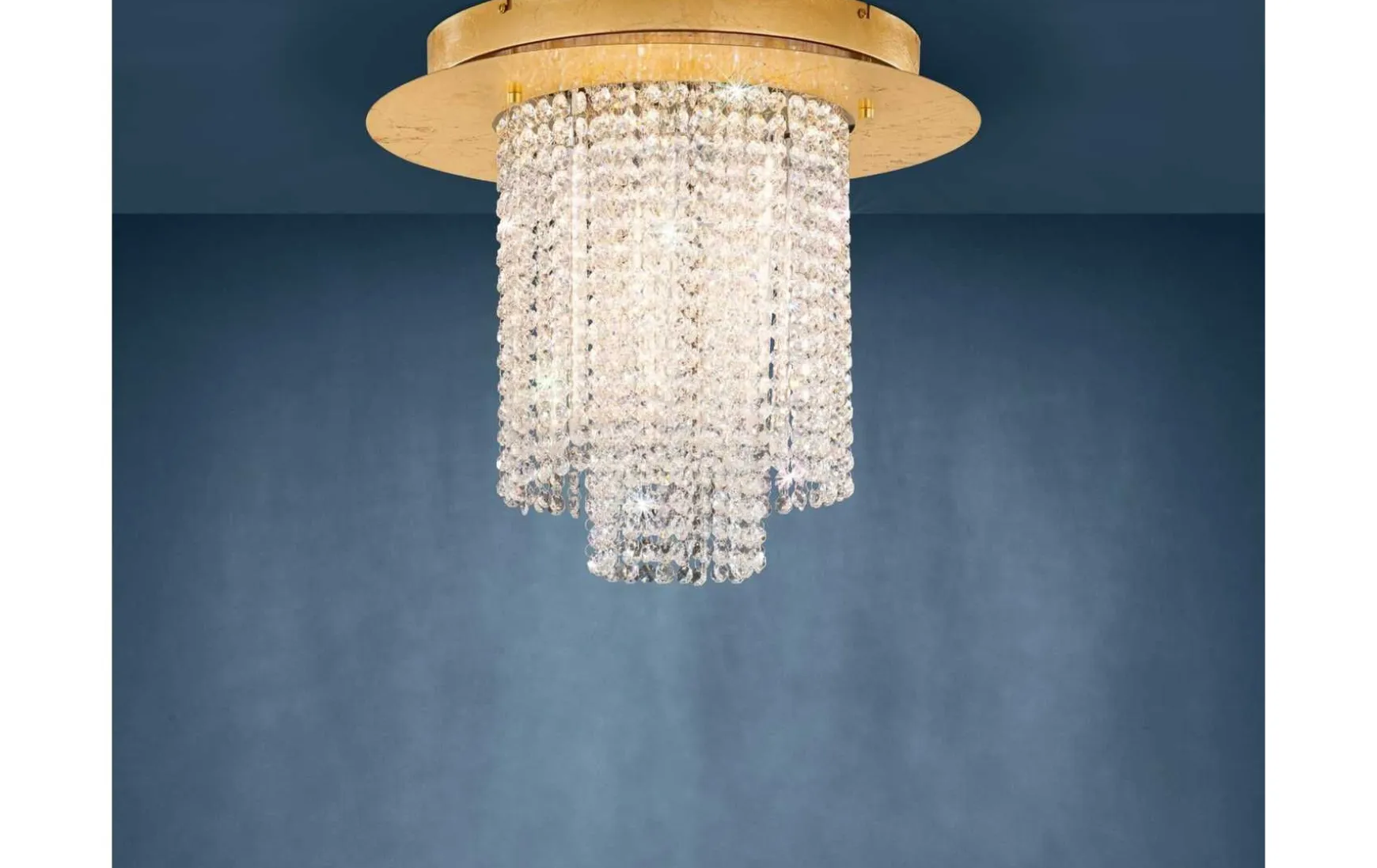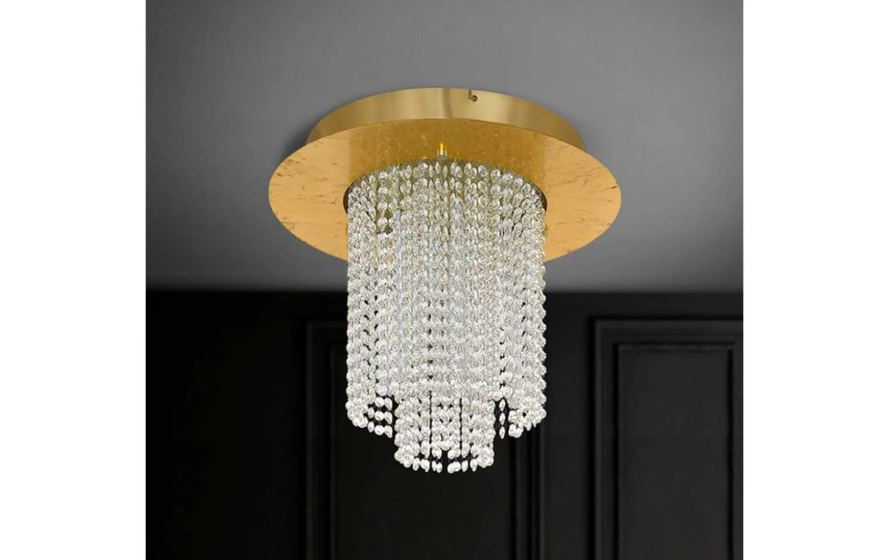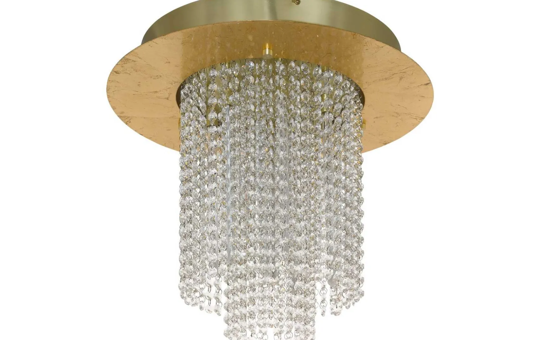 Die LED Deckenleuchte ist aus einem runden Metall-Körper in Blattgold-Optik gefertigt, der mittig mit einer Vielzahl an abgehängten klaren Brillantglas-Kugeln kombiniert wurde. Die integrierten LEDs spenden angenehmes, warmweißes Licht und sorgen dank der wertigen, klaren Brillantgläsern für ein funkelndes und edles Erscheinungsbild. Zudem ist das Licht über einen passenden Drehdimmer an der Wand dimmbar. Die Deckenlampe fügt sich elegant in verschiedene Wohnstile ein und bietet eine stimmungsvolle Beleuchtung für jeden Raum – egal ob im Wohnzimmer, Esszimmer oder Schlafzimmer.
