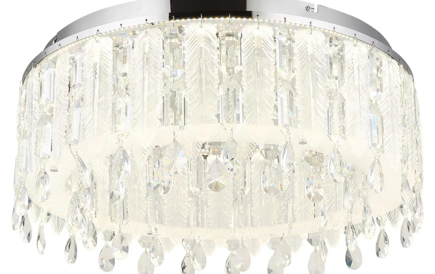 Diese luxuriöse runde Deckenleuchte setzt elegante Akzente in jedem Raum. Der Korpus aus verchromtem Metall und der beeindruckende K5 Kristallbehang in klarer Ausführung verleihen dieser Deckenleuchte eine glamouröse Ausstrahlung. Mit einem großzügigen Durchmesser von 600mm und einer Leistung von 58W erzeugt diese Deckenleuchte einen starken Lichtstrom von 3770 Lumen, der für eine helle und einladende Beleuchtung sorgt. Dank der mitgelieferten Fernbedienung ist die Deckenleuchte dimmbar und ermöglicht es, die Farbtemperatur von 2700K bis 6000K anzupassen. Die Memoryfunktion speichert die zuletzt verwendeten Einstellungen, während die Nachtlichtfunktion für eine sanfte Beleuchtung in der Dunkelheit sorgt. Bringen Sie mit dieser exquisiten Deckenleuchte Stil und Komfort in Ihr Zuhause und erleben Sie eine individuell anpassbare Beleuchtung.