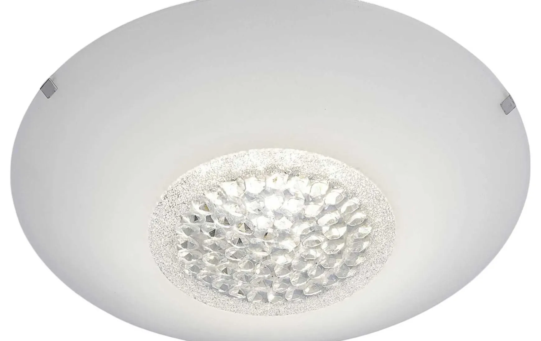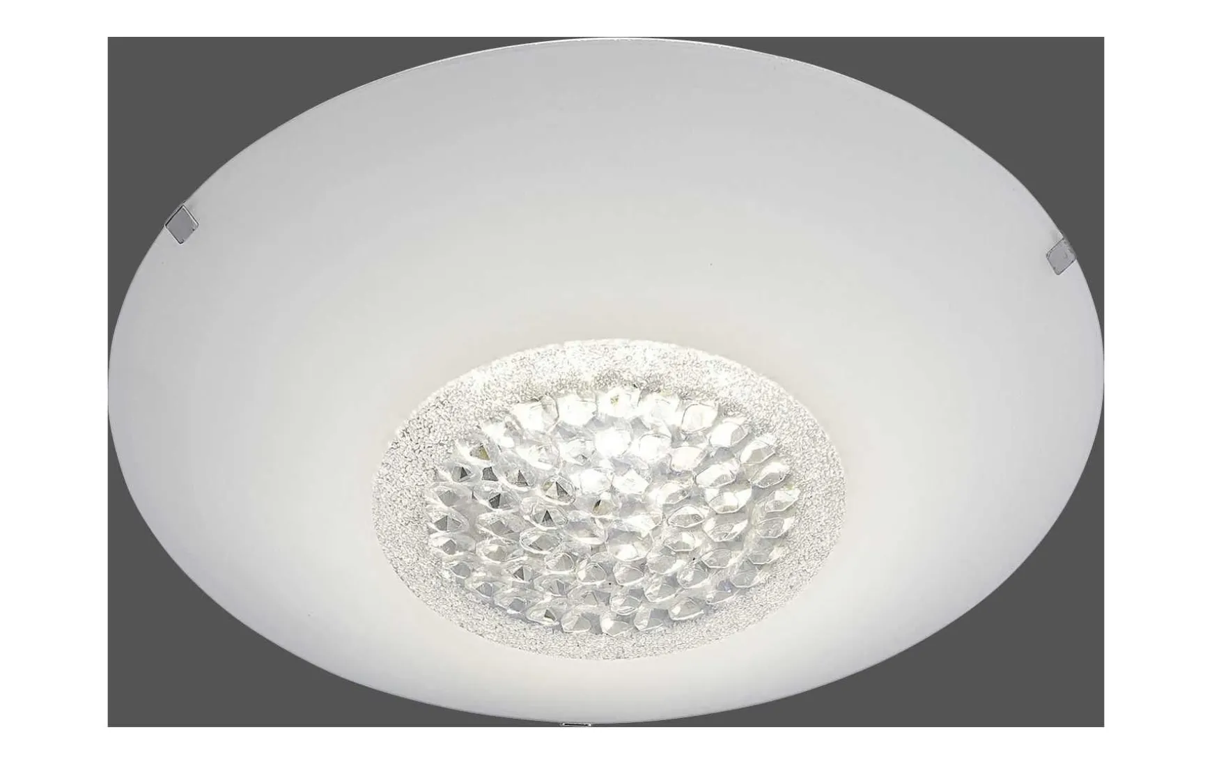 Die runde Deckenleuchte hat ein klassisches Design. Satiniertes Glas mit Kristalleinsatz sorgt für ein angenehmes Licht ohne Blendung. Sie verfügt über ein integriertes LED-Leuchtmittel und sorgt mit einer warmweißen Farbe für eine angenehme Atmosphäre in Ihrem Wohnzimmer. Darüber hinaus ist es mit der intelligenten Switchmo-Technologie ausgestattet. Durch das Vier-Stufen-Dimmen kann die Helligkeit des Lichts durch wiederholtes Drücken des Lichtschalters von 100 % auf 60 %, dann auf 40 % und dann auf 10 % gedimmt werden. Dank der verwendeten LED-Technologie ist die Lampe äußerst energieeffizient und überzeugt durch ihre niedrige Temperatur und lange Lebensdauer.