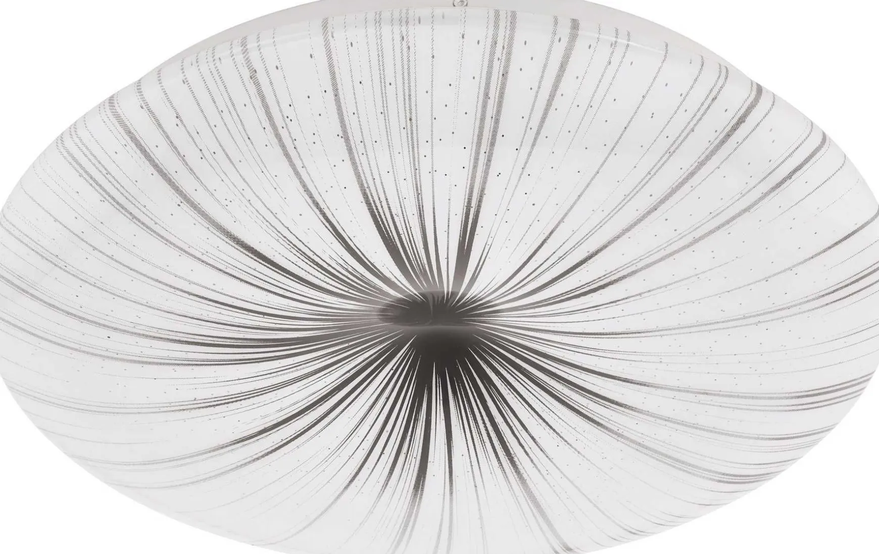 Diese Deckenleuchte besteht aus einer runden Kunststoff-Abdeckung, die mit einem weiß/dunkelgrauen Muster kombiniert wurde.