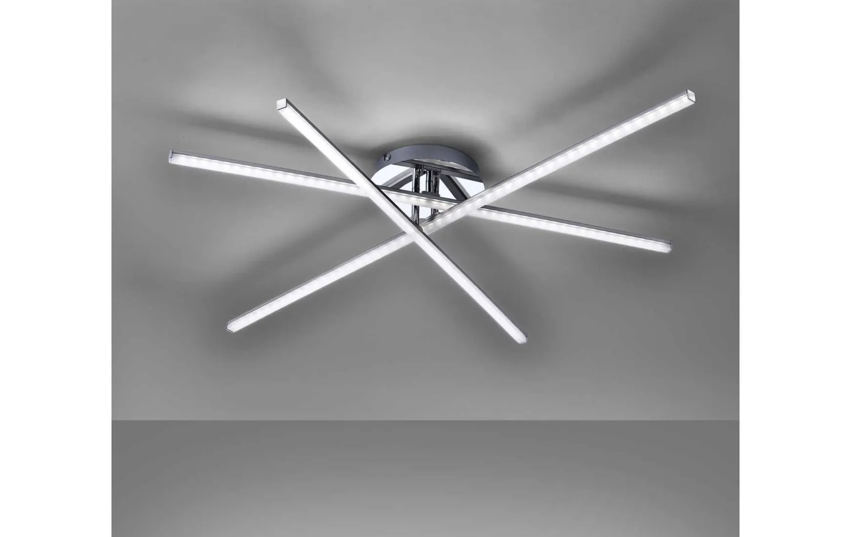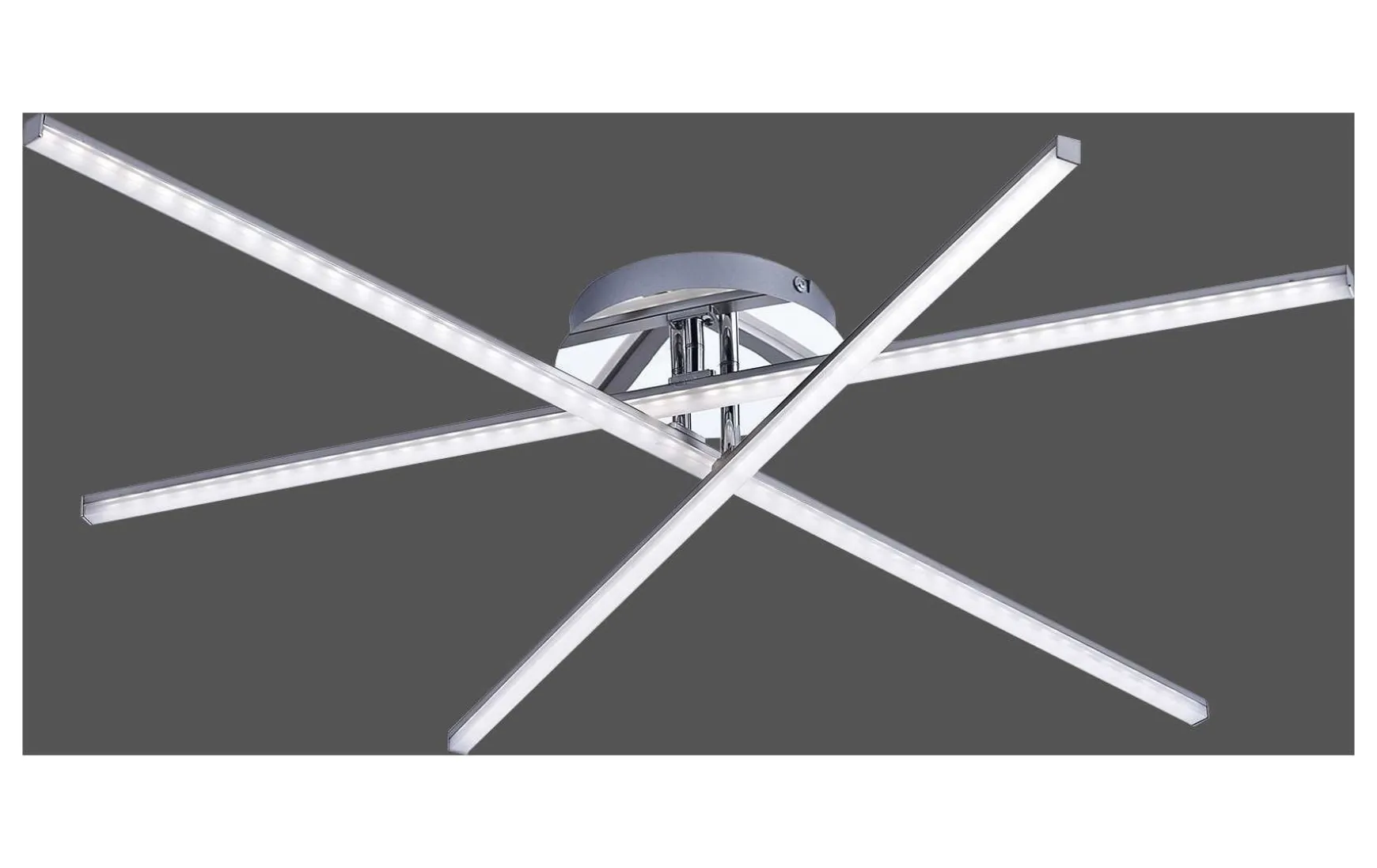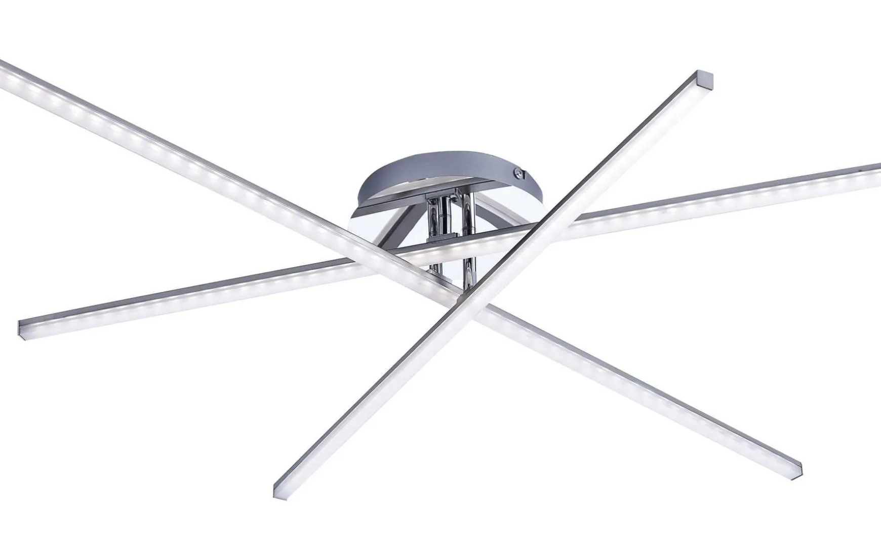 Die modern, elegante Design-Deckenleuchte erhellt formschön Ihren Wohnbereich. Die aus Eisen gefertigte Deckenleuchte wird mit drei LED-Leuchtmitteln geliefert. Jedes Leuchtmittel strahlt rund 800 Lumen aus und wirkt mit einer Farbtemperatur von 3000 Kelvin angenehm warmweiß. Einzelne Leuchtenarme sind beweglich und durch diese Beweglichkeit kann man eine neue Optik der Leuchte schaffen. Durch die Acrylglaseinsätze gibt sie ein schönes Licht wieder. Sie hat eine Länge von 101,0 cm, eine Breite von 80,5 cm und eine Abhängung von 12,0 cm.