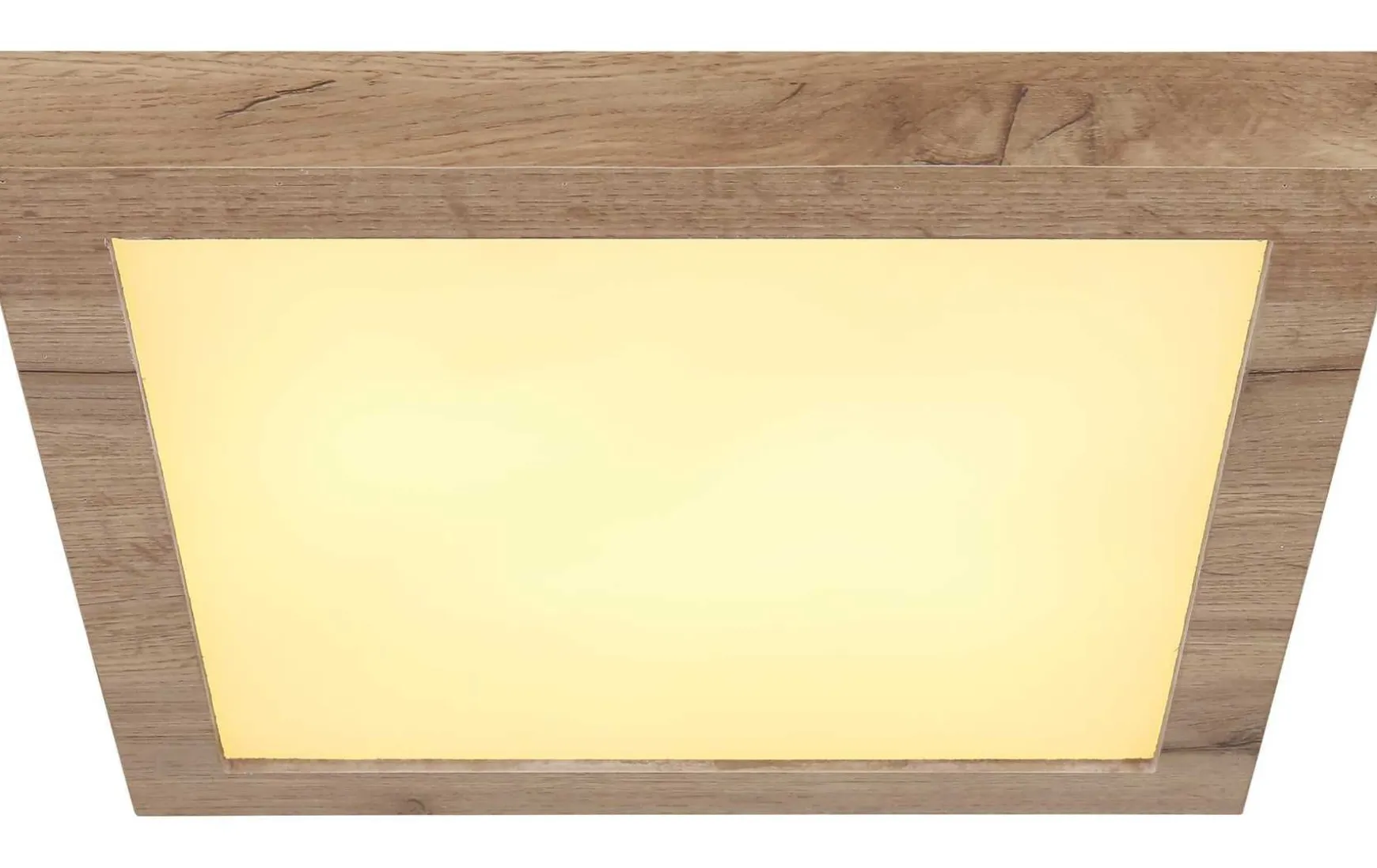 Diese Deckenleuchte besteht aus Metall in weiß matt, MDF in dunkler Holzoptik und Kunststoff in opal. Die Abmessungen betragen LxBxH: 350x350x60mm. Die Leuchte hat eine LED mit einer Leistung von 16W und einer Spannung von 230V, die eine Lichtquelle von 1800lm Source und 620lm Output bei einer Farbtemperatur von 3000K bietet.