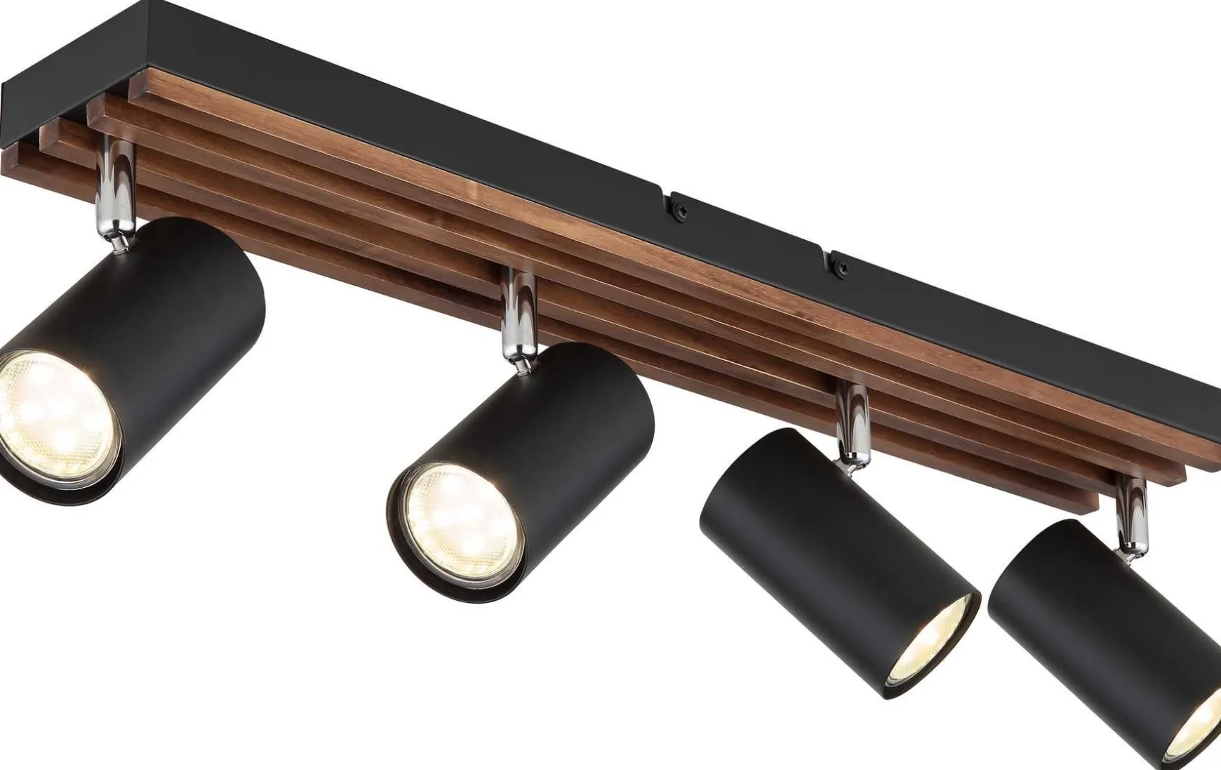 Die Wandleuchte vereint modernes Design mit natürlichen Akzenten und bietet eine stilvolle Beleuchtungslösung für jedes Zuhause. Das rechteckige Wandschild aus mattem schwarzen Metall wird durch eine edle Holzapplikation in dunkelbraunem Holz ergänzt, was für eine harmonische Kombination aus modernen und natürlichen Elementen sorgt. Die zylindrischen Strahler aus schwarzem Metall sind flexibel verstellbar und ermöglichen eine präzise Ausrichtung des Lichts, ideal für Akzentbeleuchtung. Mit einer Länge von 560 mm, einer Breite von 80 mm und einer Höhe von 125 mm eignet sich die Leuchte hervorragend für verschiedene Wandbereiche in Ihrem Wohnzimmer, Flur oder Arbeitsraum. Die Strahlerleuchte wird ohne Leuchtmittel geliefert und ist mit GU10-Fassungen ausgestattet, sodass Sie das passende Leuchtmittel für Ihre Bedürfnisse auswählen können. Diese Wandleuchte kombiniert funktionale Beleuchtung mit elegantem Design und ist ein wahrer Blickfang in Ihrem Raum.