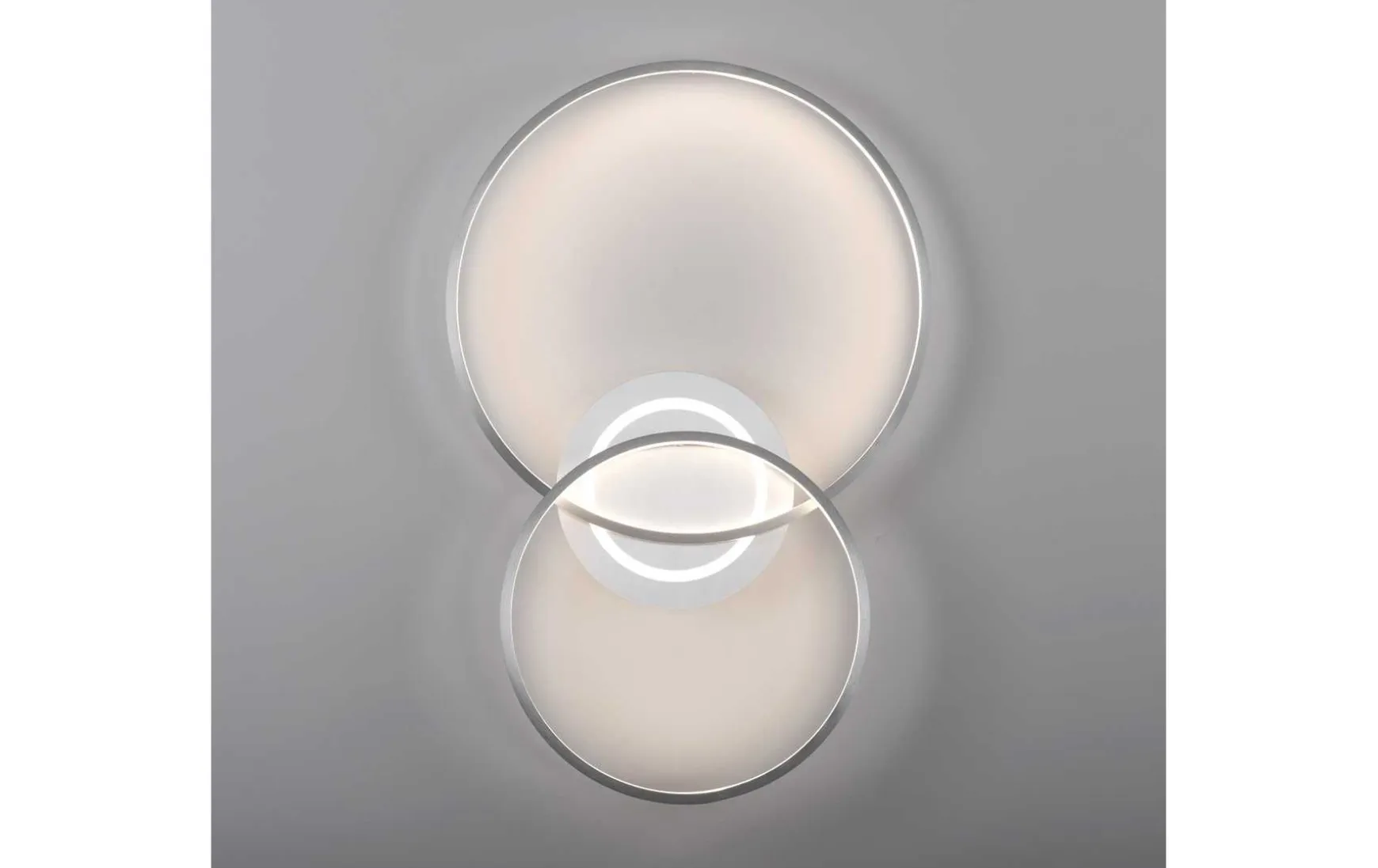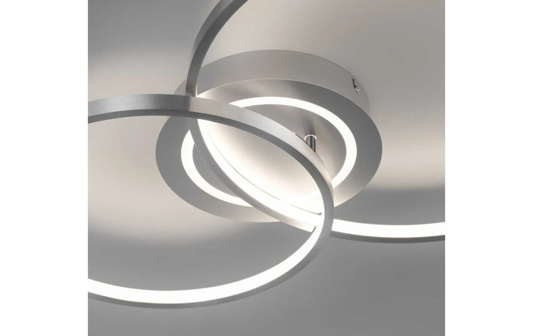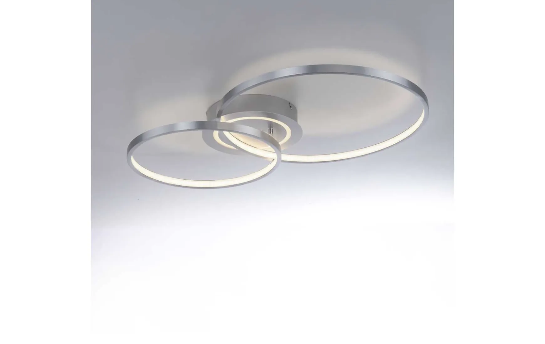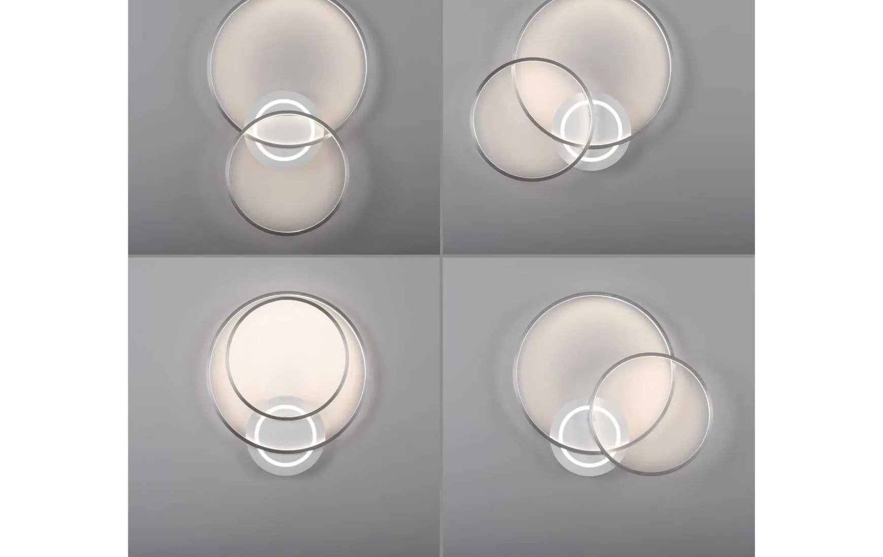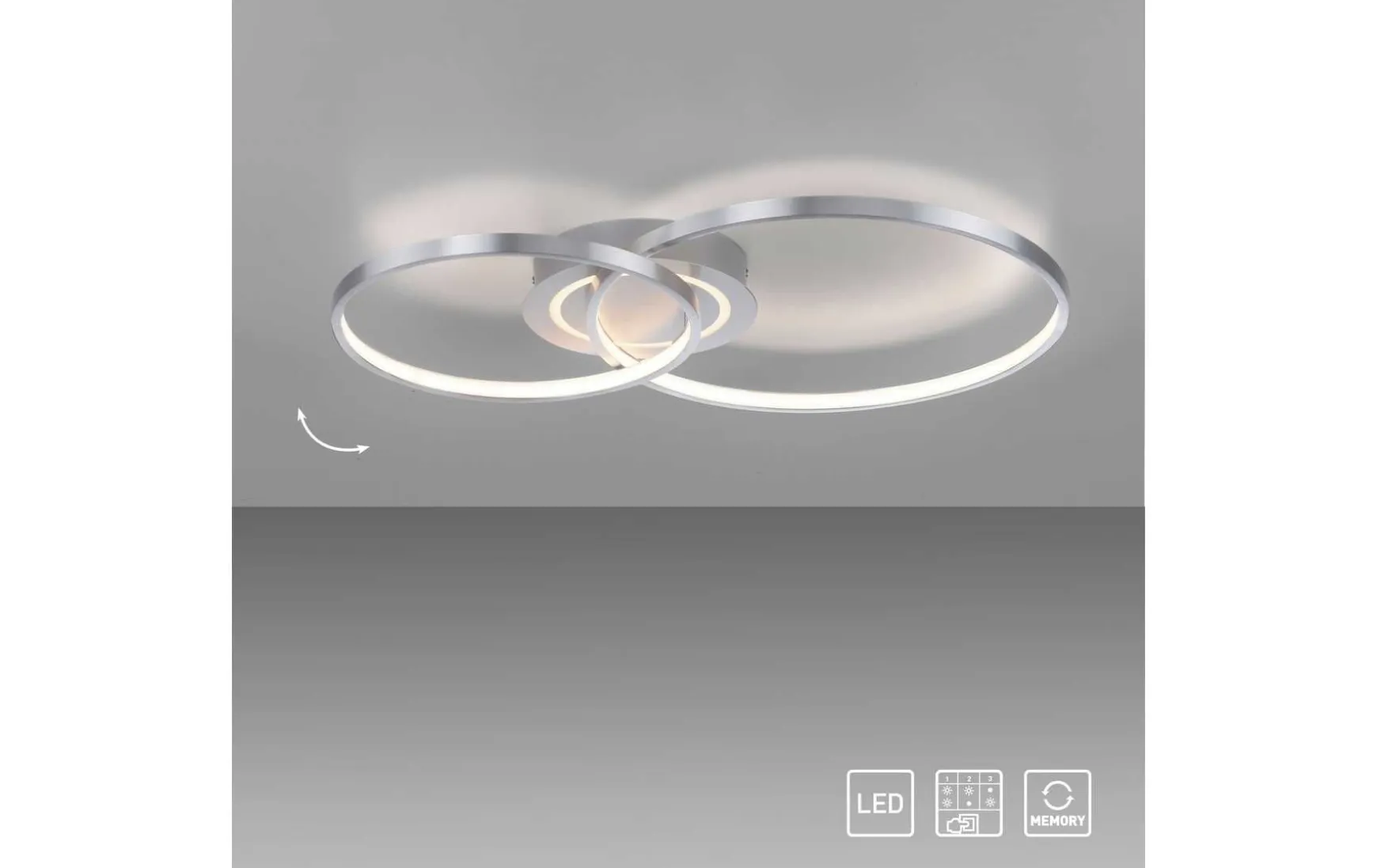 Die LED Deckenleuchte aus Aluminium überzeugt durch ein modernes Ring-Design. Die energiesparende LED Deckenleuchte wird mit zwei warmweißen LED Leuchtmitteln geliefert. Per Lichtschalter kann man die Lichtquellen der Leuchte getrennt voneinander schalten. Schaltet man die Leuchte zum ersten Mal an dann erstrahlt die Deckenleuchte in vollständigen Licht. Beim zweiten Mal schalten, leuchten nur die beiden Lichtringe und beim dritten Mal nur der Deckenkasten. Durch die Memoryfunktion bleibt die zuletzt gewählten Einstellung solange erhalten bis man eine Veränderung vornimmt. Der kleinere Lichtring der Leuchte ist drehbar und so kann man die Form individuell verändern und so ein komplett anderes Gesamtbild der Deckenleuchte erstellen.