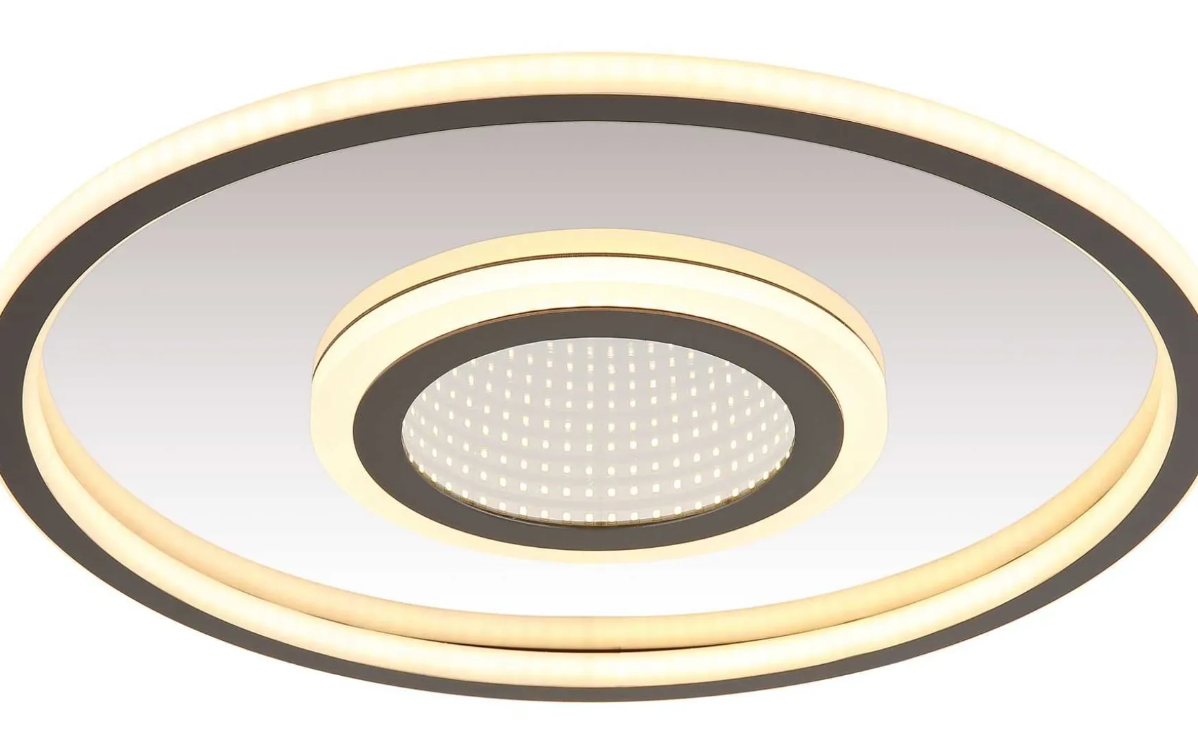 Der Schirm aus grauem, mattem Aluminium, opalem Kunststoff und verspiegeltem Acryl rundet das stilvolle Design ab. Mit einem Durchmesser von 432 mm und einem warmweißen Licht mit 3000 K schafft die Leuchte eine angenehme Atmosphäre in jedem Raum. Die Deckenleuchte bietet eine praktische Memoryfunktion und drei Beleuchtungsstufen: alle LEDs zusammen, nur der äußere Ring oder nur der innere Ring. Diese vielseitigen Einstellungen ermöglichen es Ihnen, die Beleuchtung perfekt an Ihre Bedürfnisse anzupassen.