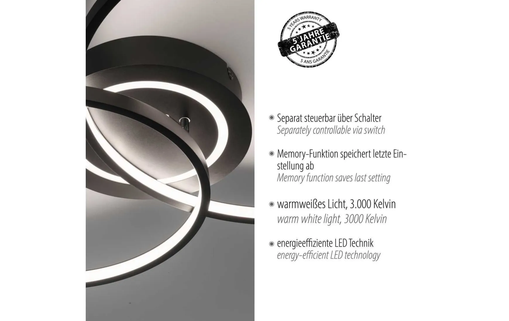 Die schwarze LED Deckenleuchte überzeugt durch ein modernes Ring-Design. Die energiesparende LED Deckenleuchte wird mit zwei warmweißen LED Leuchtmitteln geliefert. Per Lichtschalter kann man die Lichtquellen der Leuchte getrennt voneinander schalten. Schaltet man die Leuchte zum ersten Mal an dann erstrahlt die Deckenleuchte in vollständigen Licht. Beim zweiten Mal schalten, leuchten nur die beiden Lichtringe und beim dritten Mal nur der Deckenkasten. Durch die Memoryfunktion bleibt die zuletzt gewählten Einstellung solange erhalten bis man eine Veränderung vornimmt. Der kleinere Lichtring der Leuchte ist drehbar und so kann man die Form individuell verändern und so ein komplett anderes Gesamtbild der Deckenleuchte erstellen.