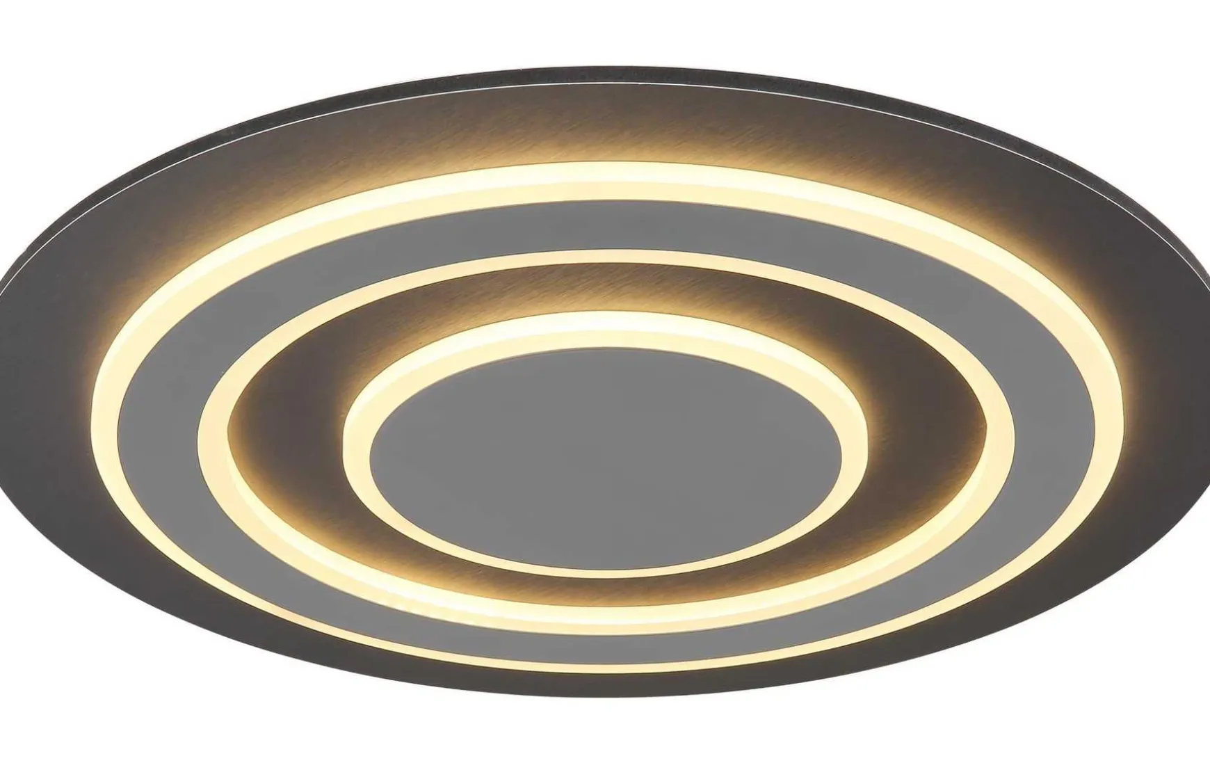 Diese Deckenleuchte ist eine ansprechende und moderne Lösung für die Beleuchtung von Räumen. Ihr runder Design mit einem Durchmesser von 480mm passt sich perfekt in jede Dekoration ein. Der Korpus besteht aus Metall anthrazit gebürstet, während der Schirm aus Metall grau, gebürstet, und Acryl Opal kombiniert wird. Durch diese Verbindung entsteht ein weiches und diffuses Licht, das einen warmen und einladenden Effekt erzeugt. Die Leuchte verfügt über einen hohen Output von 1100 Lumen in einem warmen Weiß (3000K), um eine angenehme und friedliche Atmosphäre zu schaffen. Die Deckenleuchte eignet sich ideal für die Illumination von Wohnräumen, Büros oder Hotelzimmern, um eine elegante und moderne Beleuchtung zu schaffen.