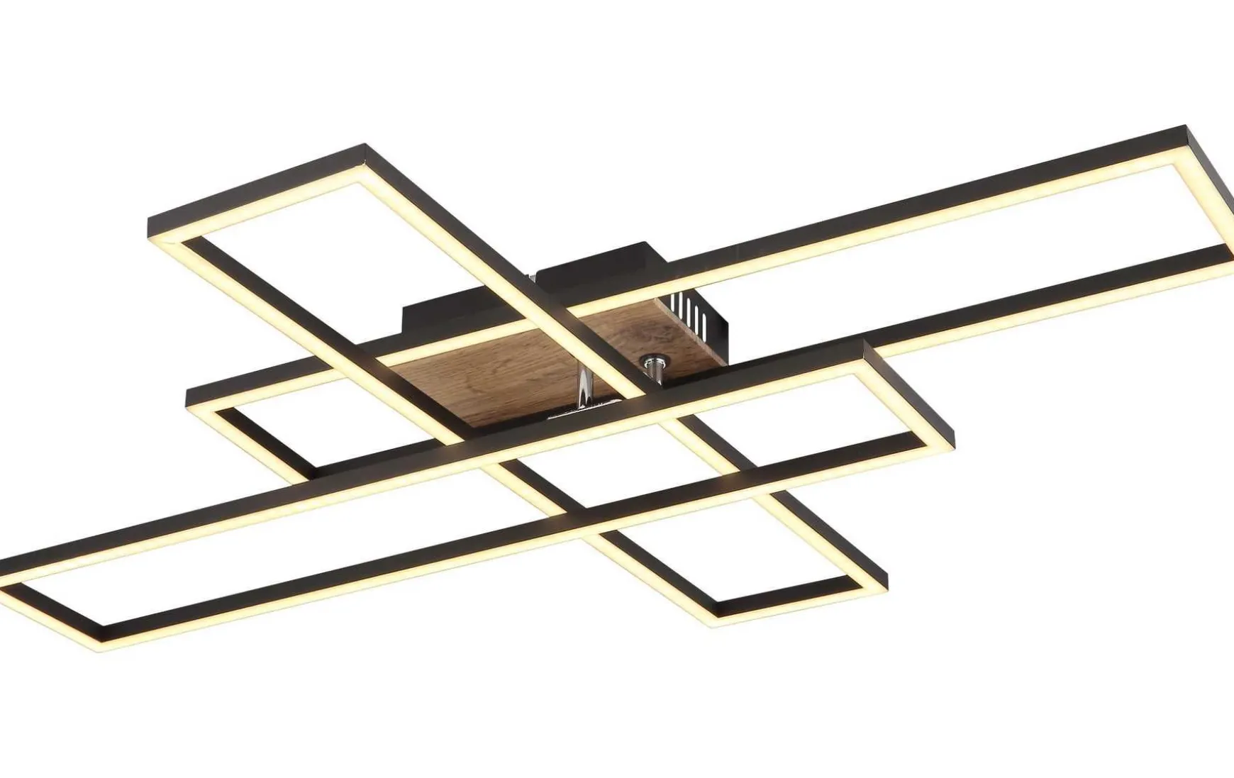 Der Korpus aus schwarz mattem Metall in Kombination mit dunkler MDF-Holzoptik verleiht der Leuchte eine edle Note.