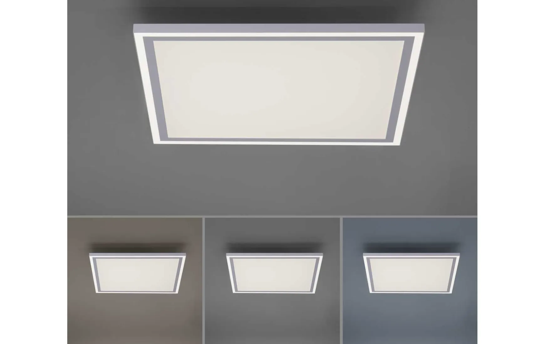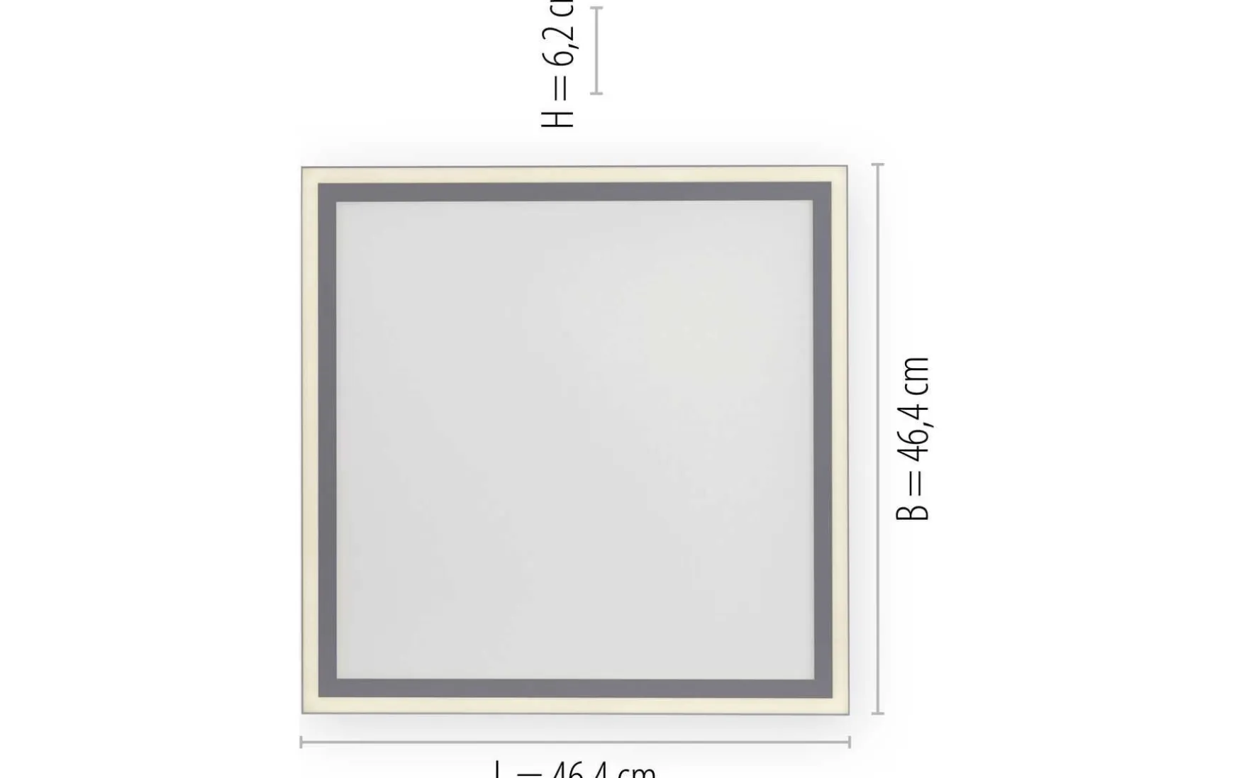Die Deckenleuchte hat eine Länge und Breite von 46,4 cm und eine Abhängung von 6,2 cm.