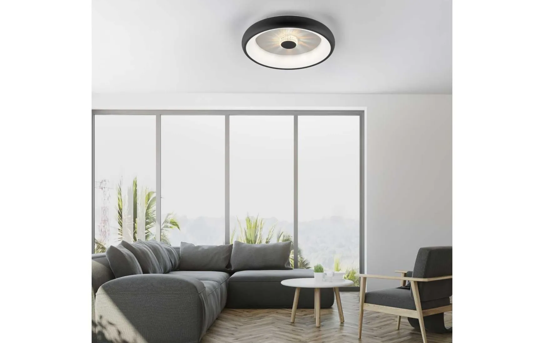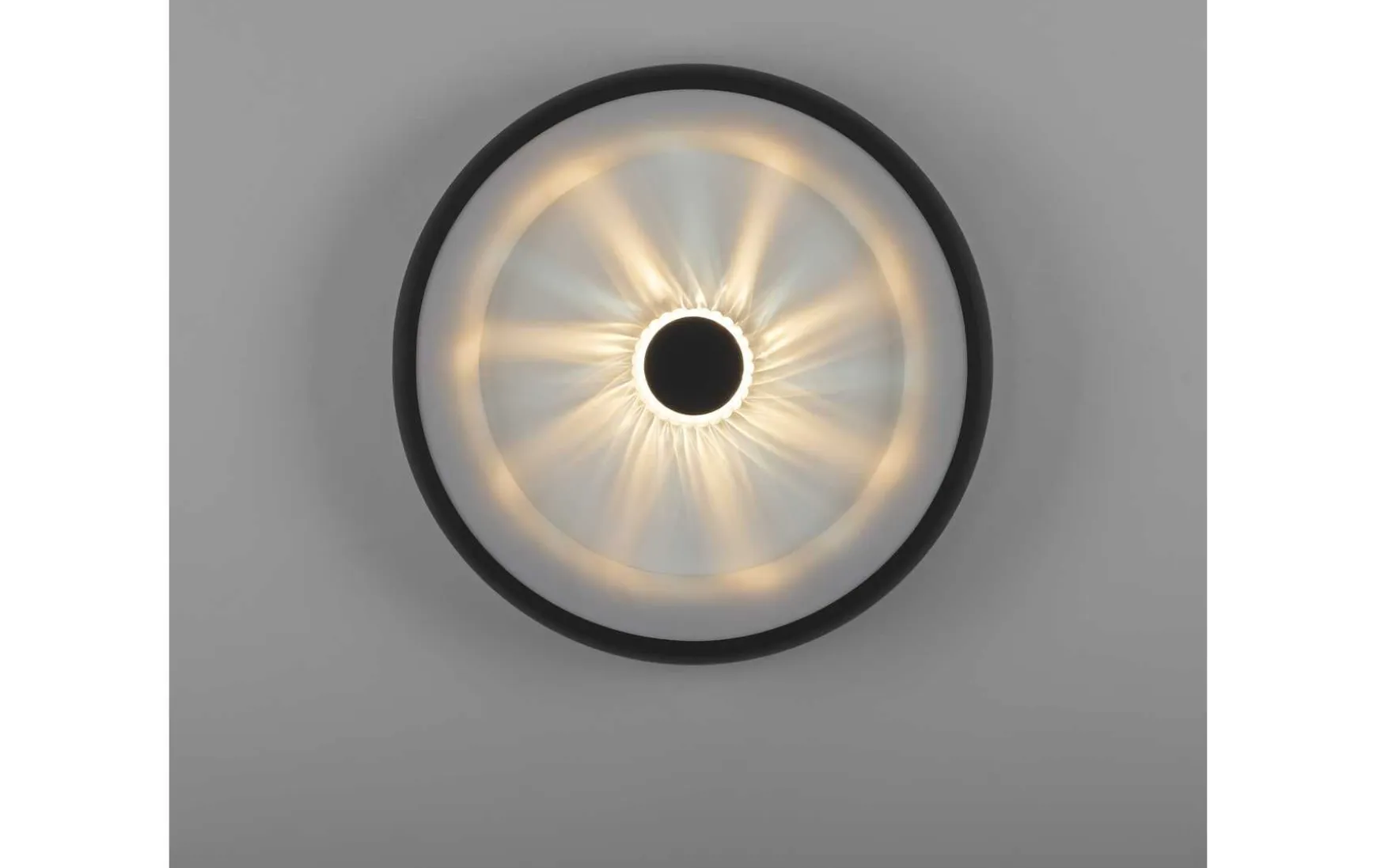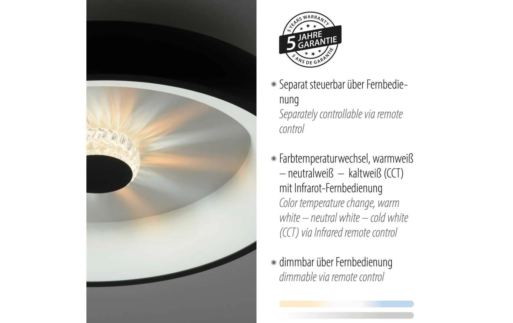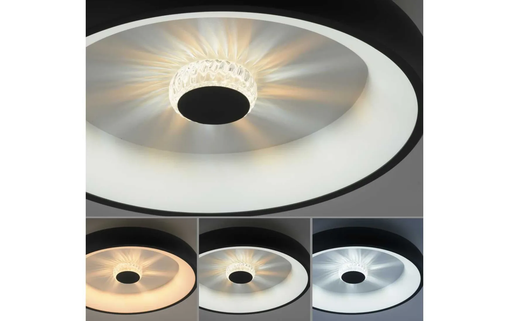 Die LED Deckenleuchte vereint elegantes Design, innovative Technologie und zauberhafte Lichteffekte. Das runde Design und die schwarze Farbe verleihen Ihrem Raum zeitlose Eleganz. Mit der stufenlosen Dimmfunktion haben Sie die volle Kontrolle über die Helligkeit der Beleuchtung. Passen Sie das Licht ganz nach Ihren Bedürfnissen an und schaffen Sie die gewünschte Atmosphäre in Ihrem Raum. Ob helles Arbeitslicht oder gedämpftes, romantisches Ambiente – die Deckenleuchte erfüllt Ihre Wünsche auf Knopfdruck. Die mitgelieferte Funkfernbedienung macht die Bedienung der Leuchte besonders komfortabel. Steuern Sie die Helligkeit und die Lichtfarbe bequem aus der Ferne, ohne dass Sie sich von Ihrem Platz bewegen müssen. Machen Sie es sich gemütlich und genießen Sie die kabellose Kontrolle über Ihre Beleuchtung. Dank der integrierten Memoryfunktion merkt sich die Deckenleuchte Ihre individuellen Einstellungen. Selbst nach dem Ausschalten und erneuten Einschalten bleibt Ihre bevorzugte Lichtintensität und -farbe erhalten, ohne dass Sie sie erneut einstellen müssen. Mit der CCT-Farbtemperatursteuerung können Sie den Lichtton von warmweißem Licht (2700 K) bis zu tageslichtweißem Licht (5000 K) individuell einstellen. Schaffen Sie eine gemütliche Atmosphäre oder erhellen Sie Ihren Raum mit natürlichem Tageslicht – die Wahl liegt ganz bei Ihnen. Ein besonderes Highlight ist der wunderschöne Kristalleffekt in der Mitte der Leuchte. Dieser sorgt für ein faszinierendes Lichtspiel. Lassen Sie sich von den funkelnden Reflexionen verzaubern und genießen Sie das besondere Flair, das sie Ihnen bietet.